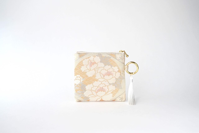 華紋模様織 ゴールド・クリーム色のシルク帯で製作したバッグチャーム型スクエアポーチです。やわらかで上品な色合いで、静かな華やかさがあります。 カラビナ付きでスマホチェーンストラップやバッグにつけて、持ち運ぶことができとても便利です。メイク用品や、鍵、イヤフォンなどの小物入れにぴったりです。 誕生日プレゼントなど特別な方へのギフトとしてもおすすめです。 シルク帯ならではの静かな存在感、オーラ、気品が溢れるポーチです。 【アパレルのプロが丁寧に作ったリユース帯のポーチ】 裁縫、ポーチのパターン(型紙)はアパレルのパタンナー(型紙職人)が手がけており、丁寧な手作業で仕上げてあります。 【一点もののリユース帯を使ったシルク帯のポーチ】 リユース帯を使っているため、市販のポーチにはない高級感があります。 帯素材は扱いにくいため、帯生地を使ったポーチは、市販品にはあまり無い希少品です。 ポーチに合わせて取り外し可能なミニタッセルをおつけしました。 【こんな方におすすめです】 ・本物志向の方 ・高級感のあるポーチを探している方 ・日本文化、和小物、和装が好きな方 ・大切な方へのギフトを探している方 外国のご友人、結婚式のお祝い、目上の方へのギフトなどにも高級感があり、最適です。 (シールをギフト用シールに付け替えることも可能です。 無料で承りますので、ご希望の方は備考欄にコメントくださいませ。) 【素材】 表地:シルク帯 裏地:綿 【大きさ】 高さ13cm、横13.5cm、マチ0.5cm 【ご購入時のご注意点】 ・通常、オーダーを頂いてから発送まで、2、3日以内に対応しております。 ・パソコンやスマートフォンのブラウザにより画像と色合いが異なる場合もあります。 ・ギフトをご希望の方は備考欄にその旨ご記入くださいませ。 ギフト用のシールにて無料でご対応いたします。 ・裁縫は丁寧に仕上げてありますが、製品の特性上、気にならない程度の歪みなどございます。また手作業で仕上げておりますため、縫製の歪みなどある場合もありますので、予めご了承くださいませ。 ・リユース帯のため、帯生地にリユース帯特有の風合い、味わいがあります。 製作時に気がつかない程度の若干の小さな汚れ、生地のホツレなどがある場合がございます。また、リユース帯特有の匂いなどあることがございますので、予めご了承お願いいたします。