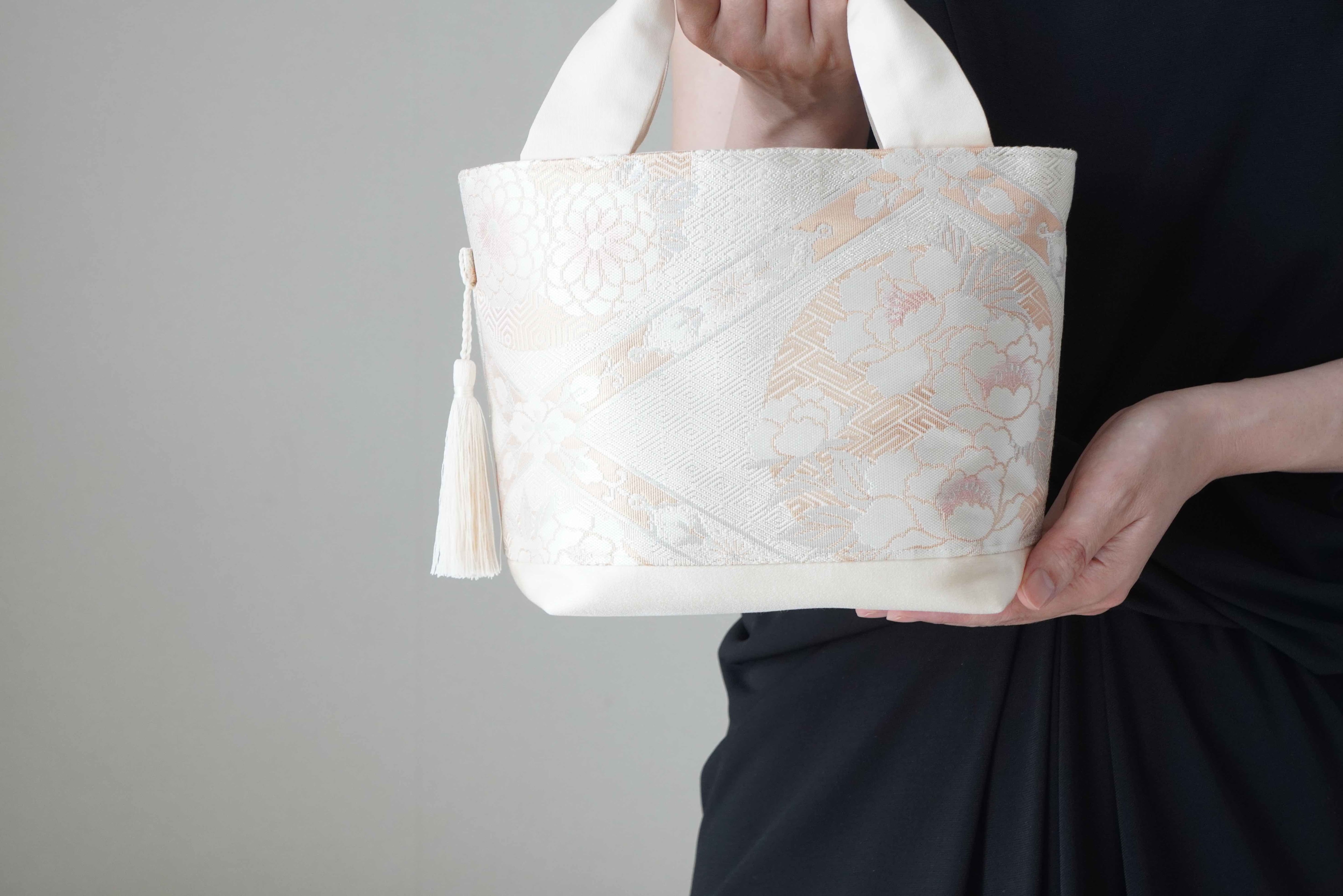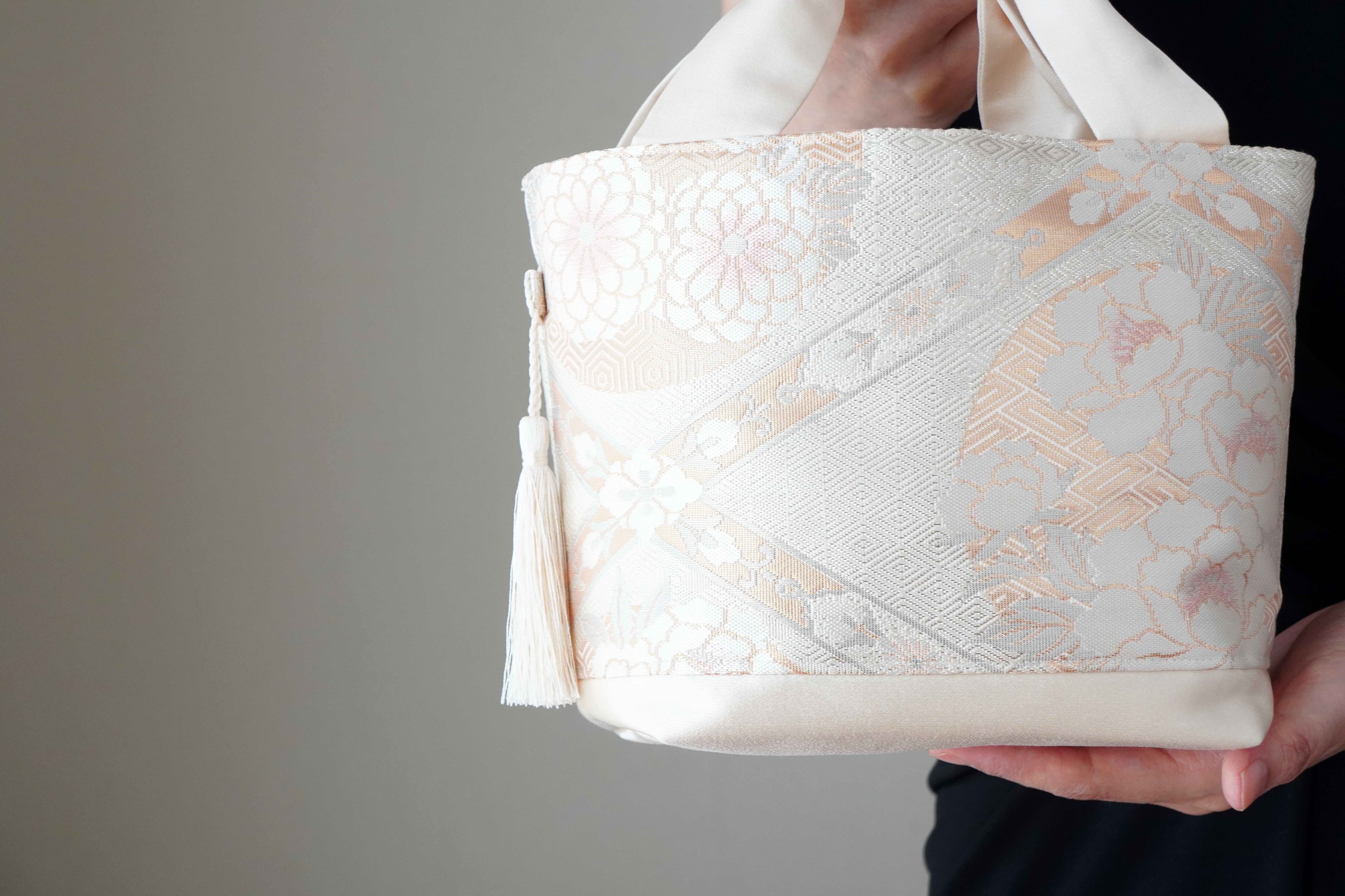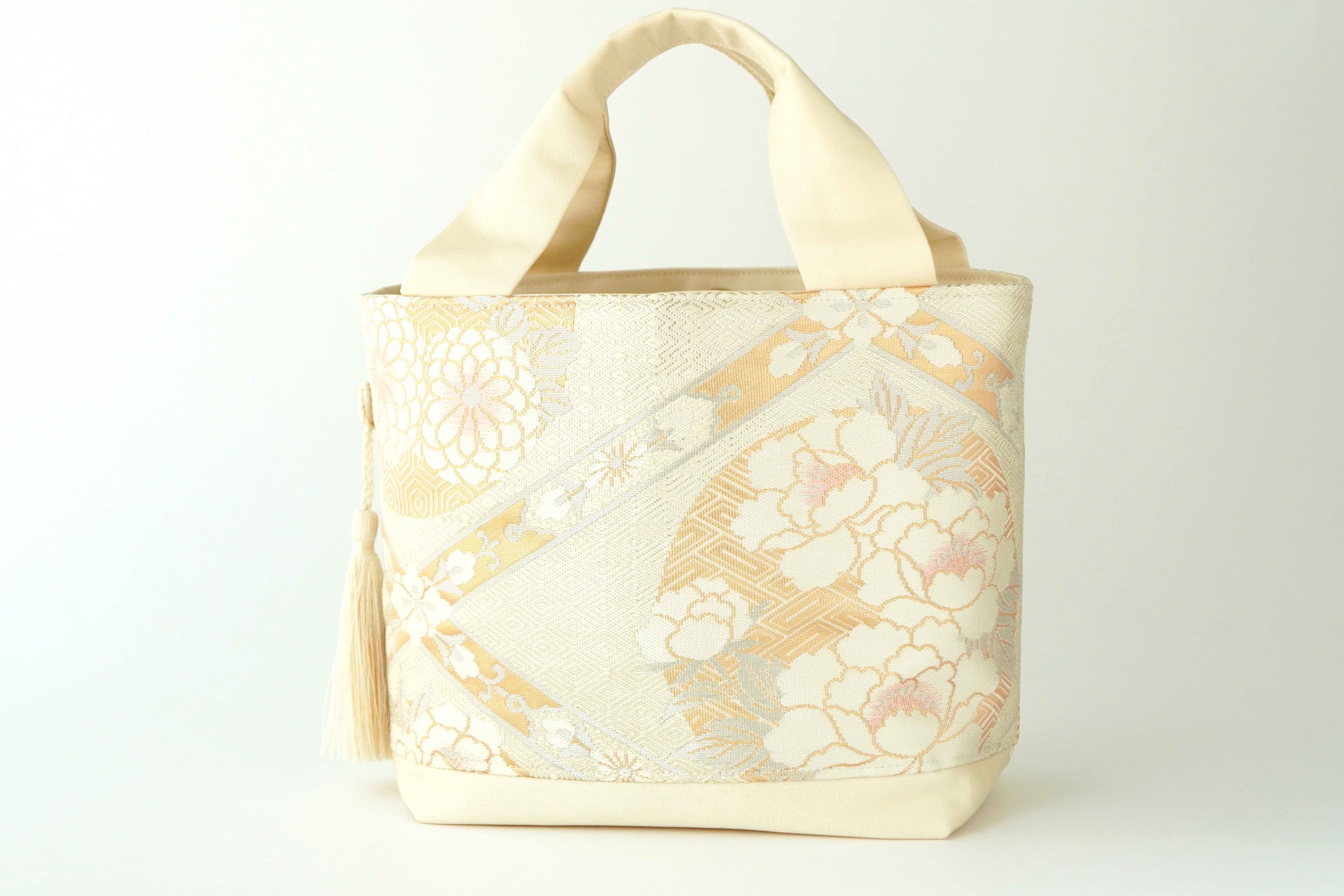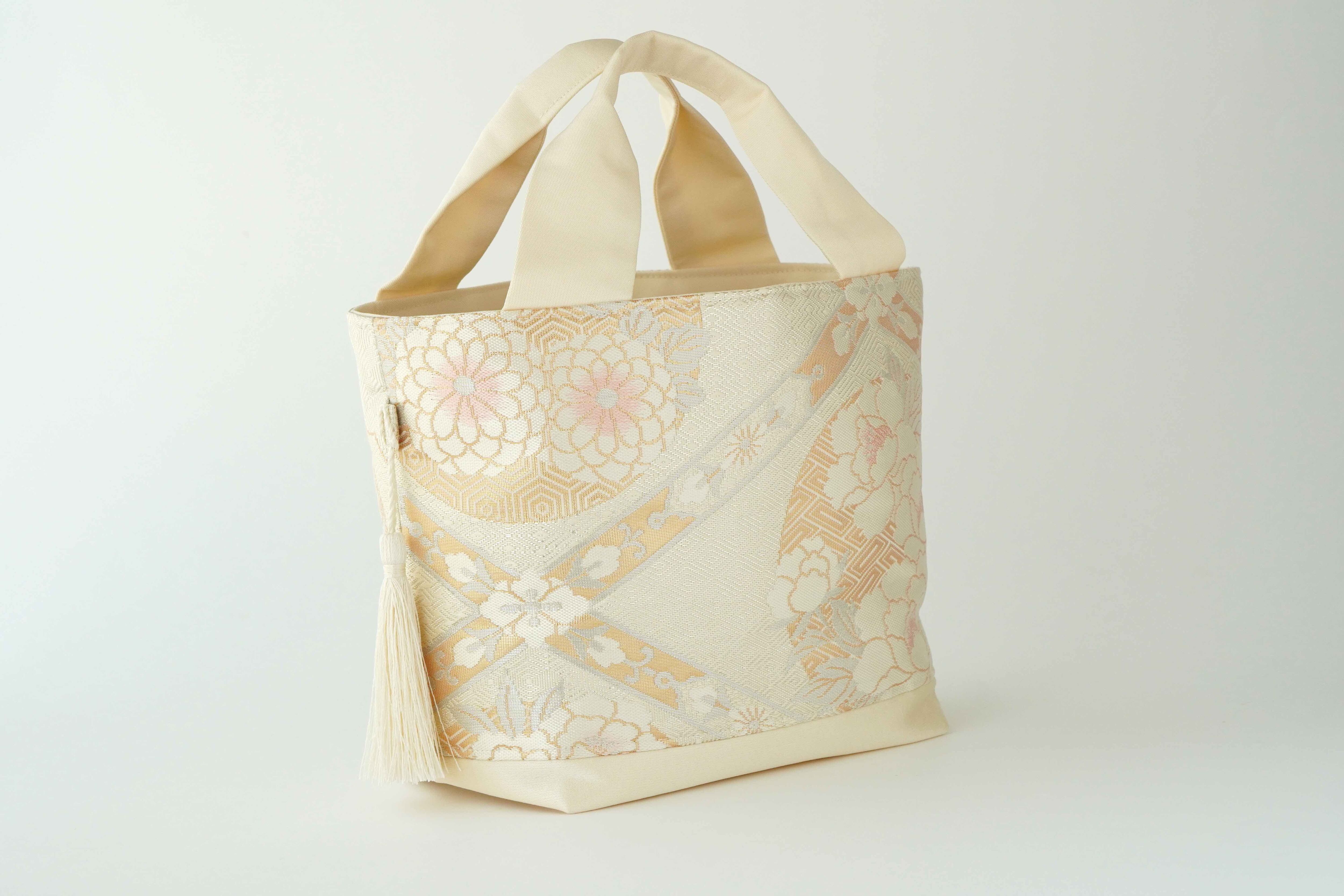 【花丸模様 ベージュ・シルバー シルク 帯リメイク トート型バック】日常使い、結婚式、パーティー、お呼ばれの日に。