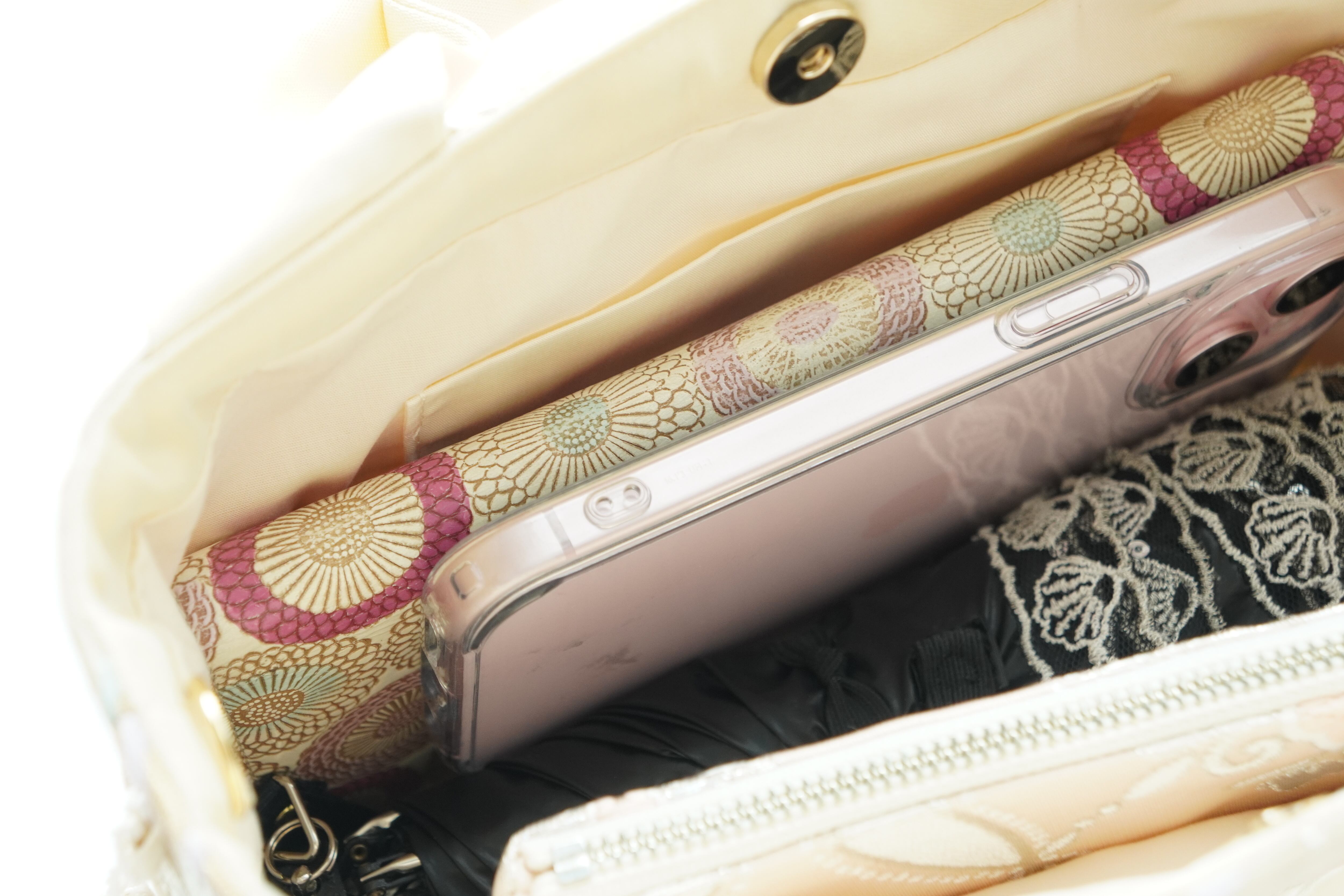 コンパクトながら、一般的な大きさの長財布、スマートフォン、ミニポーチ、ハンカチなどが収納できます。