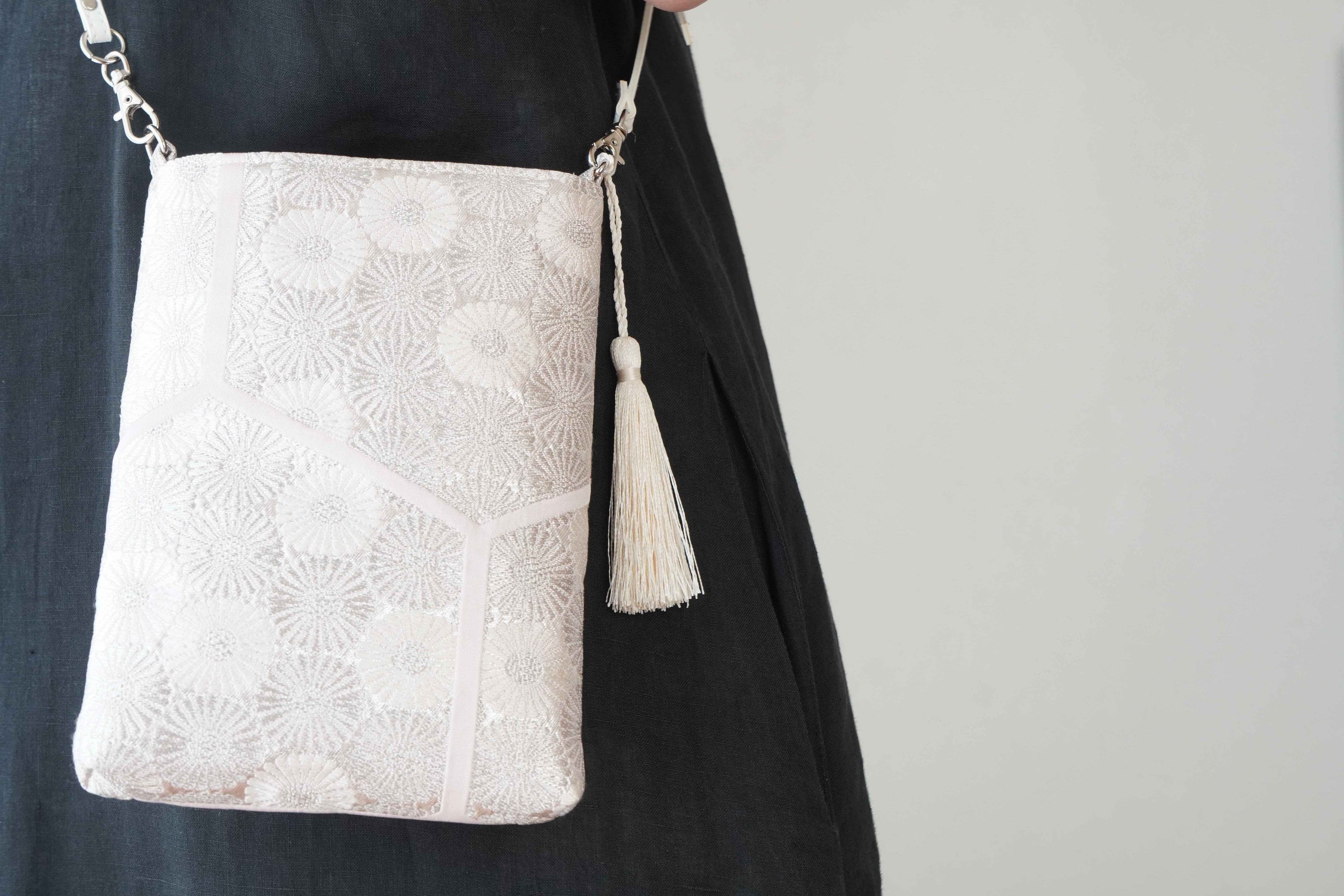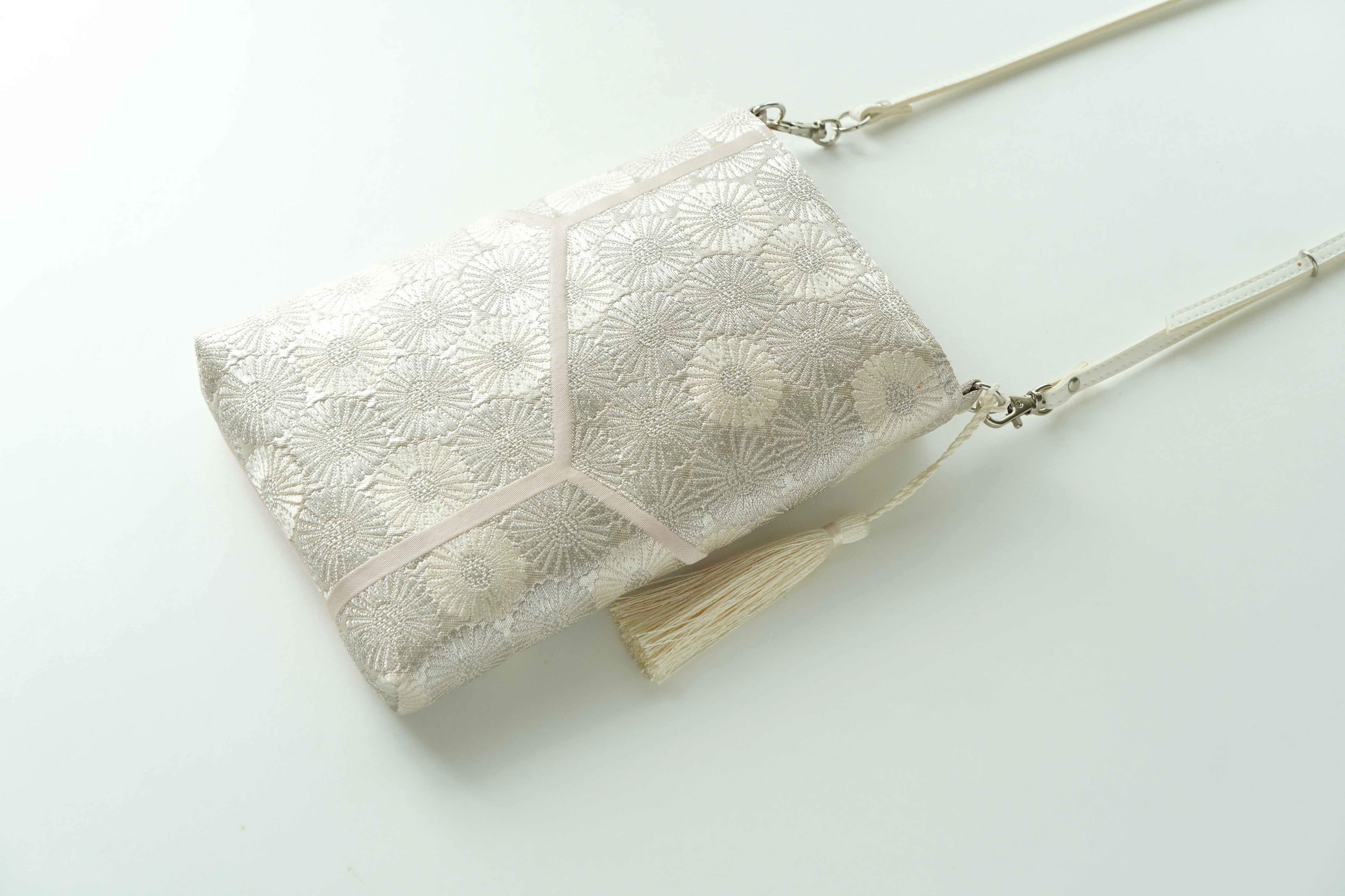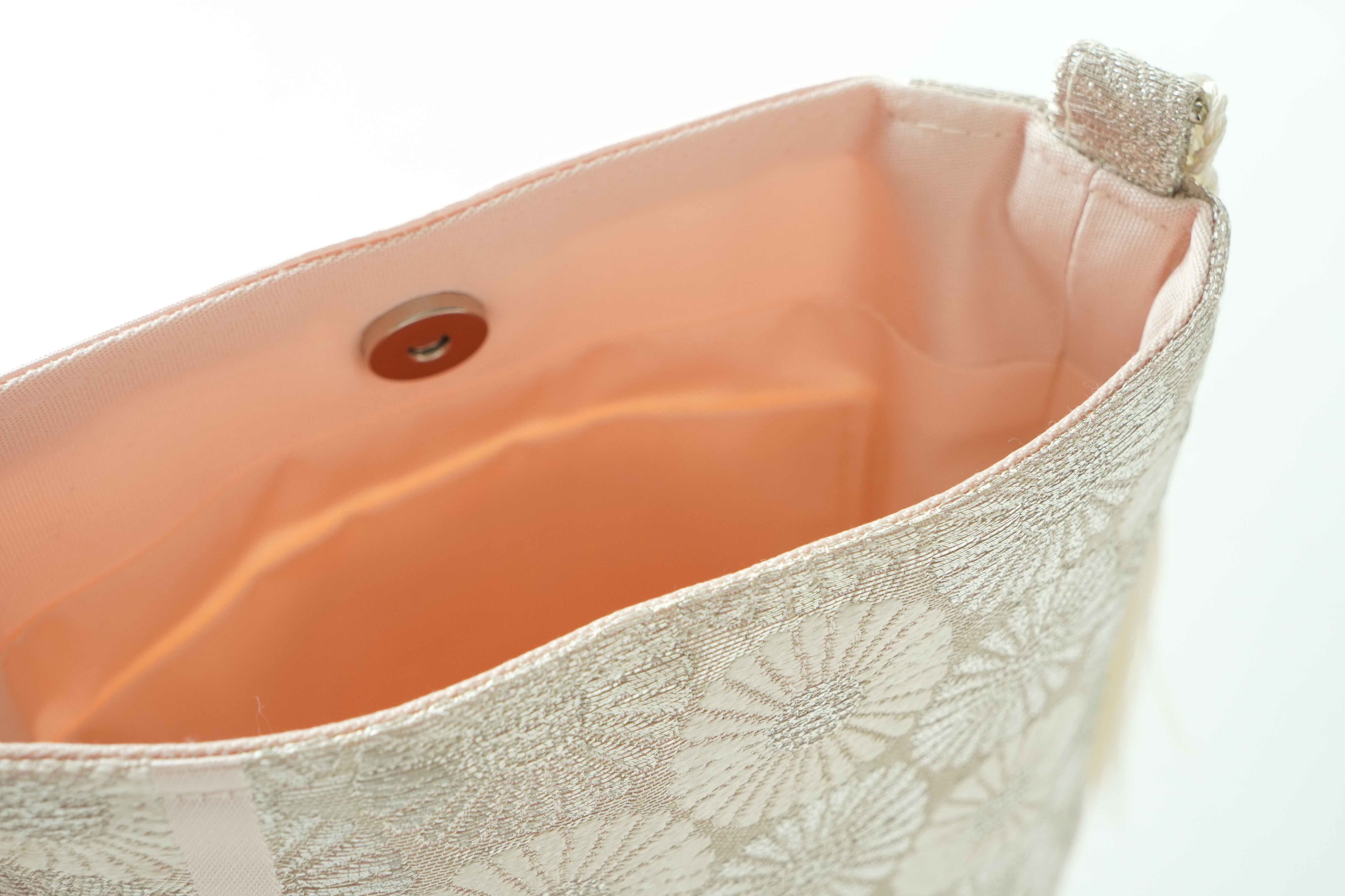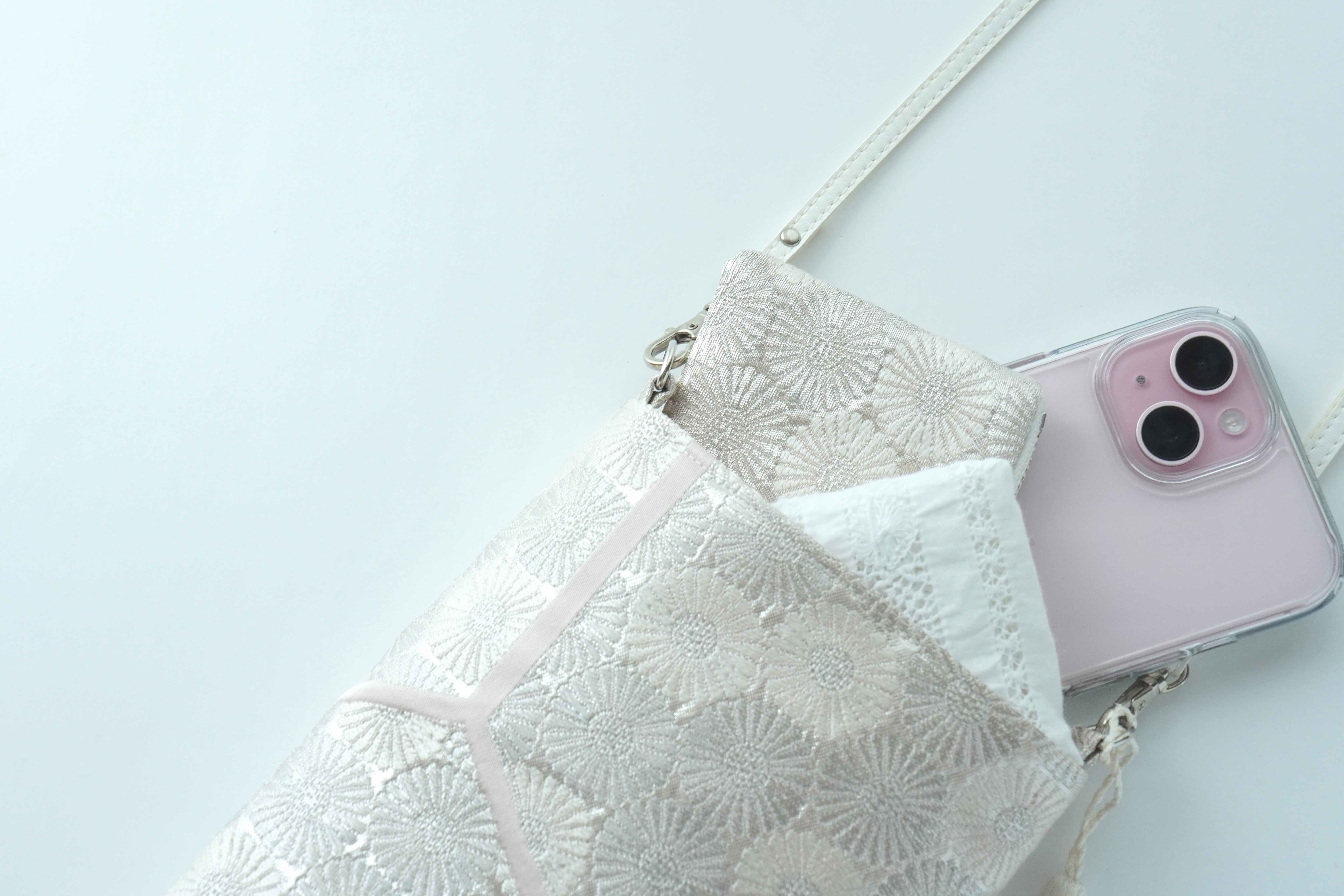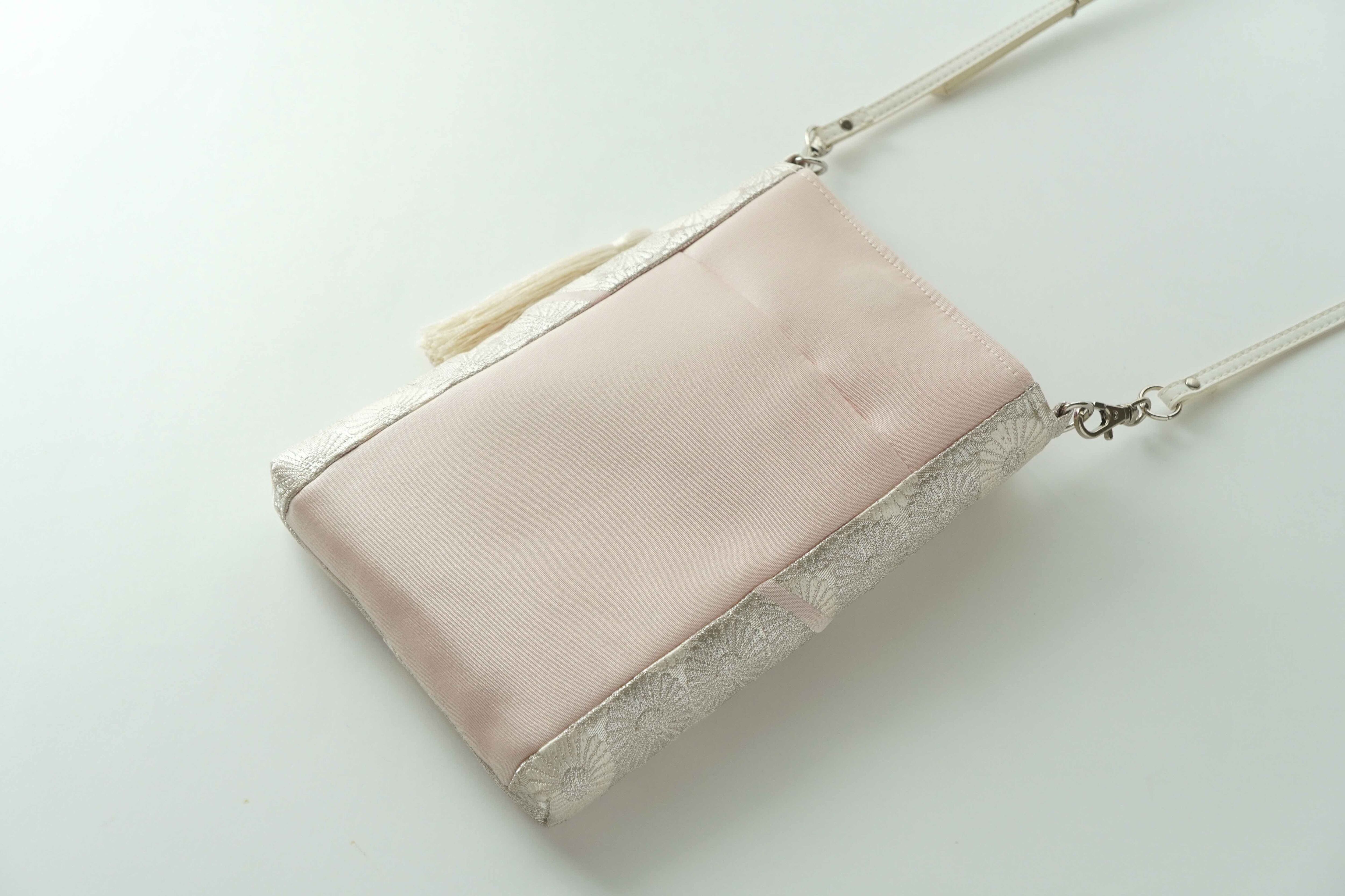 【亀甲繋ぎ 花模様 シルバー・桜色 シルク帯リメイク スマホショルダーバッグ】特別な日、結婚式、パーティー、ギフトにも。