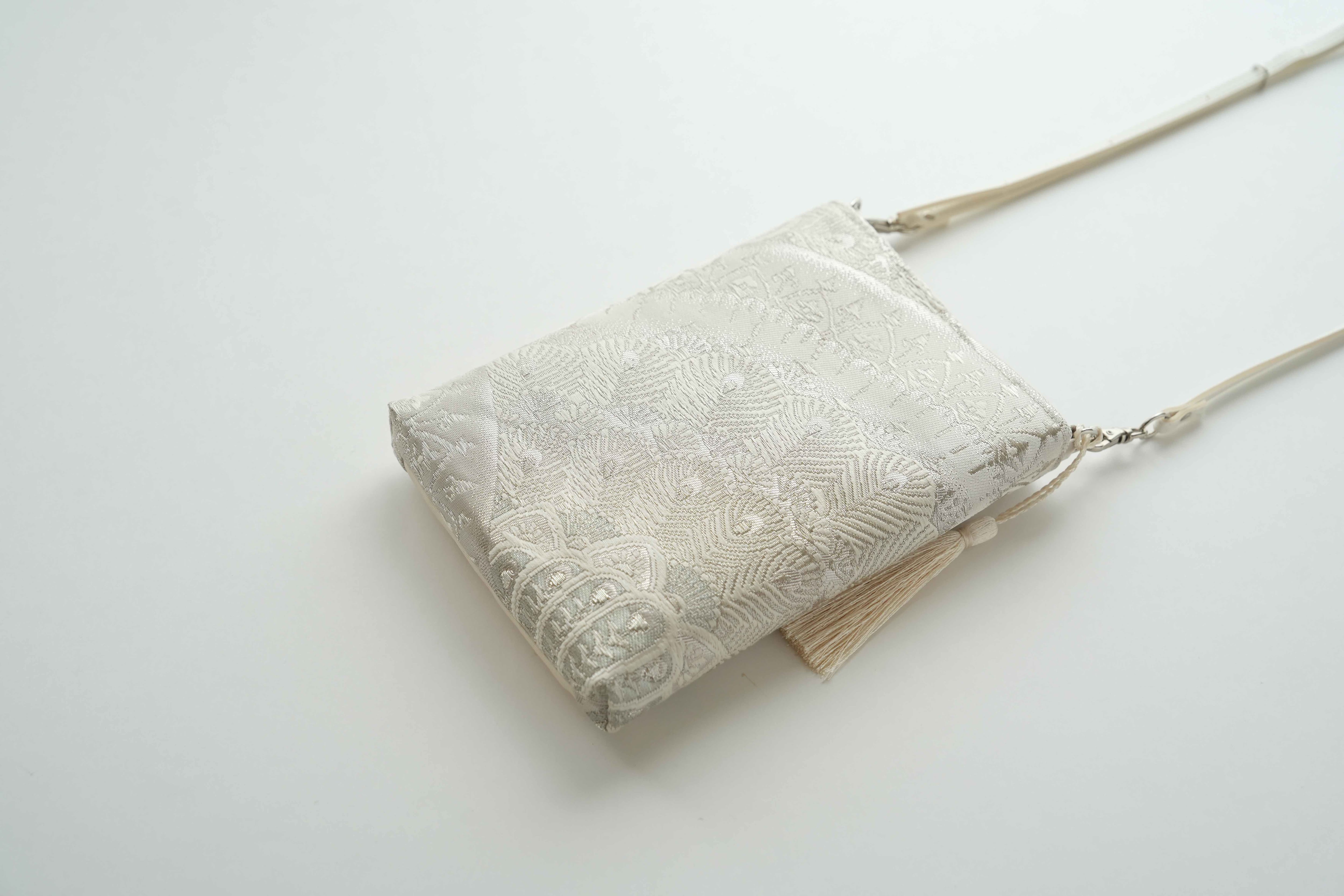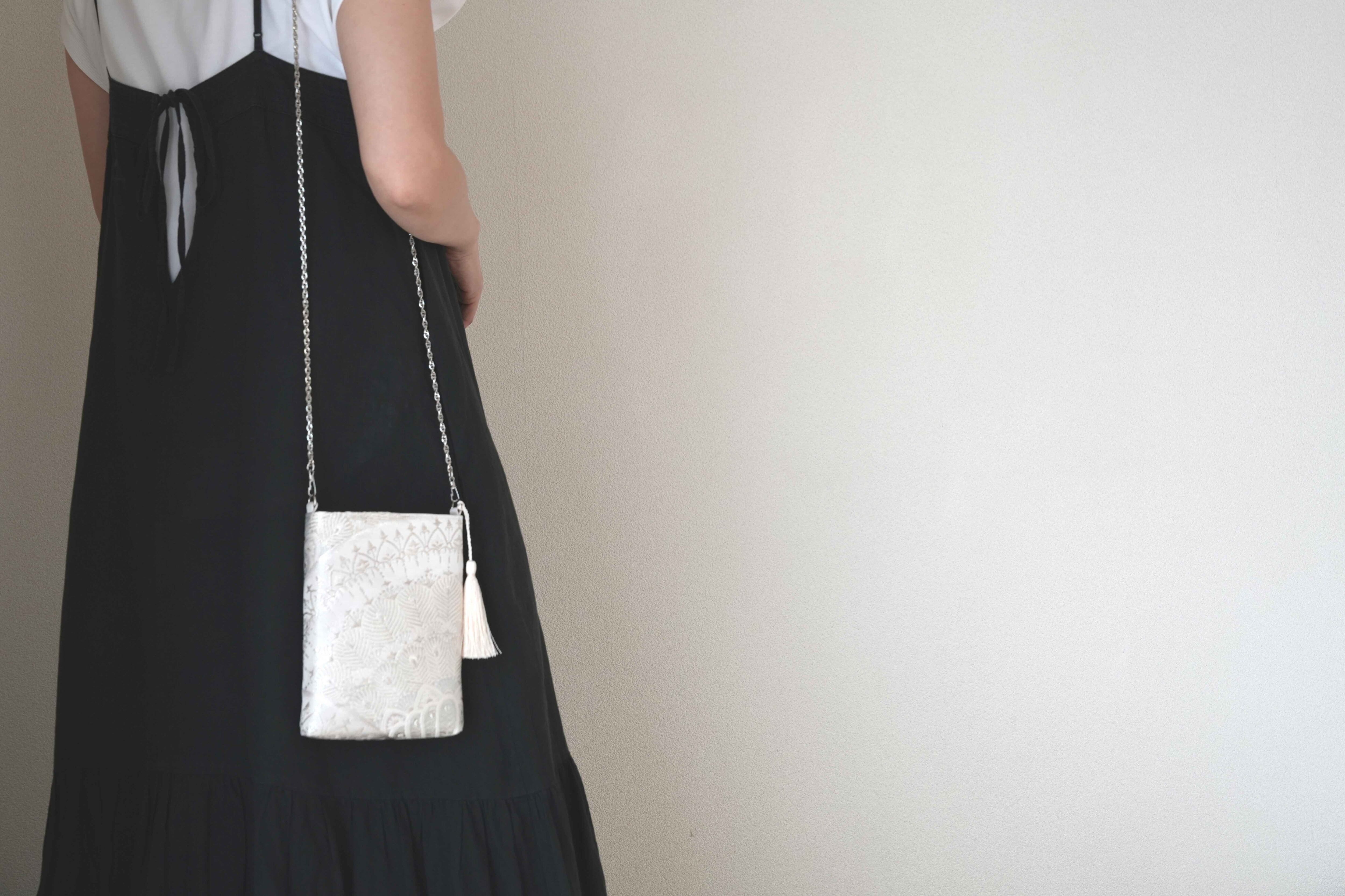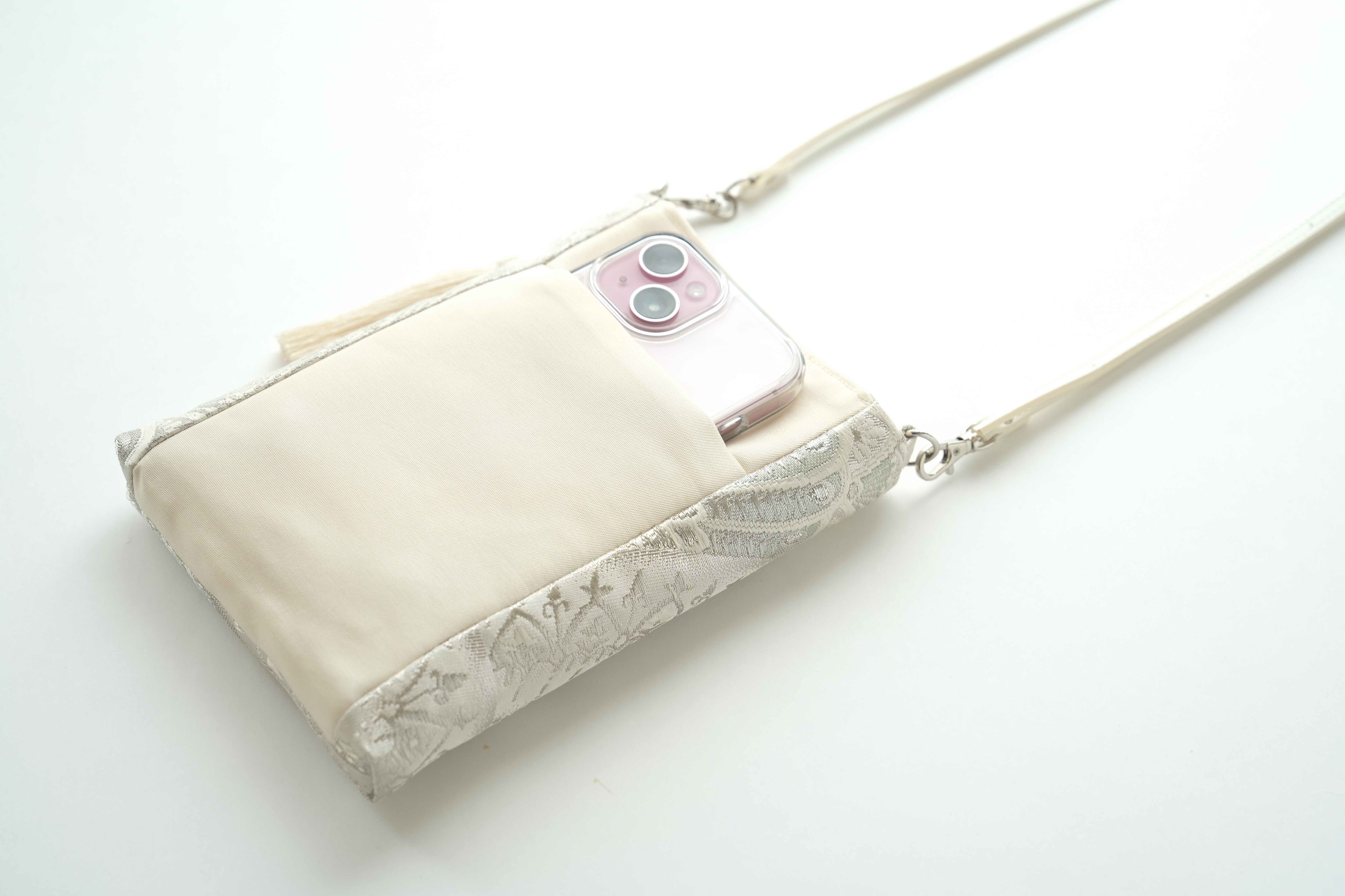 花青海波模様のシルバー帯地で製作したシルバーのシルク帯で製作したスマホショルダーバッグです。