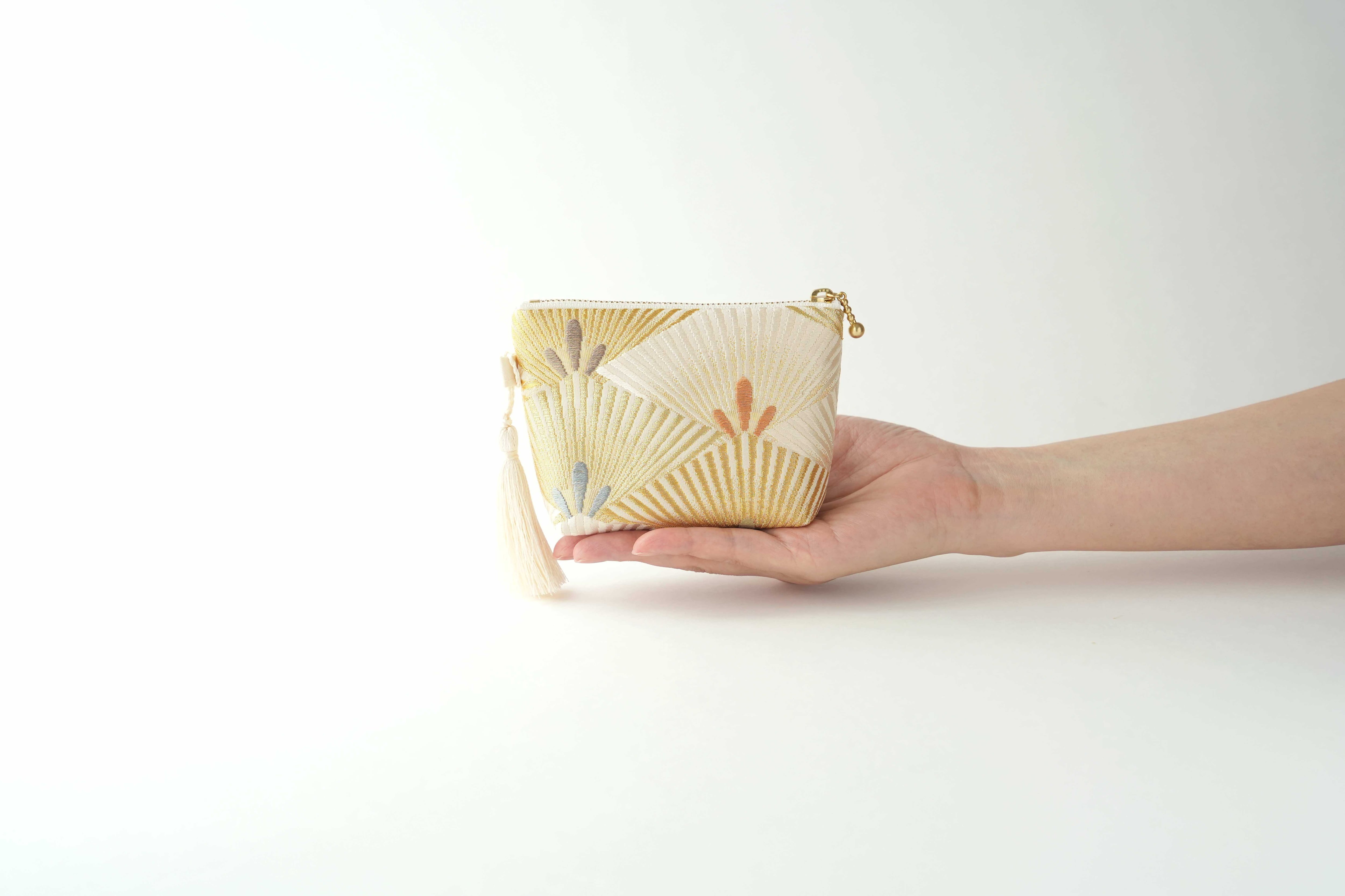 【西陣織 篠屋宗兵衛謹製 若松模様 ゴールド シルク帯リメイクミニポーチ】カードケース、ポーチ小さめ、ジュエリーポーチ。誕生日ギフトにも。