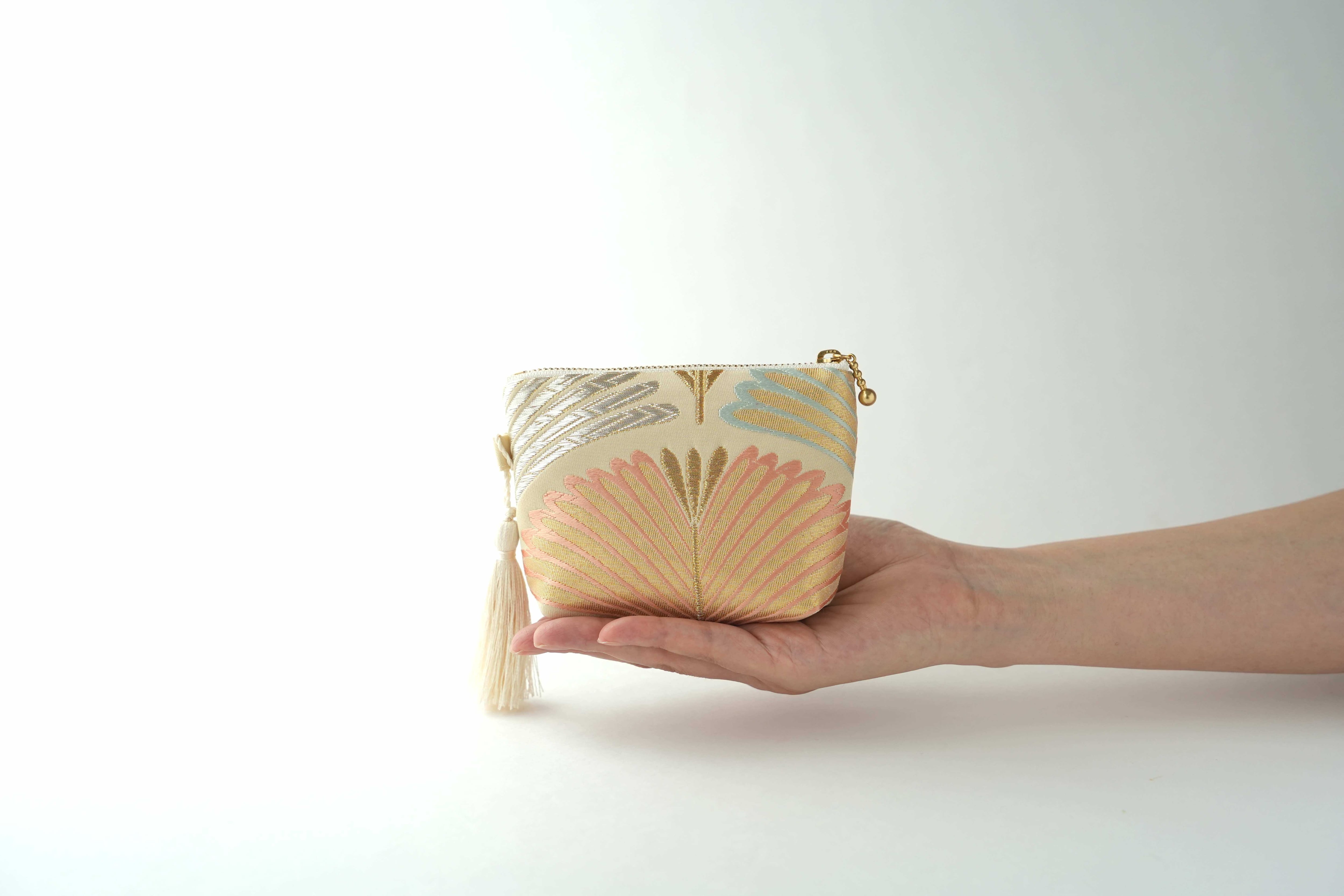 ベージュ・ゴールド・シルバーの帯地に松紋様があしらわれたシルク帯で製作したミニポーチです。
