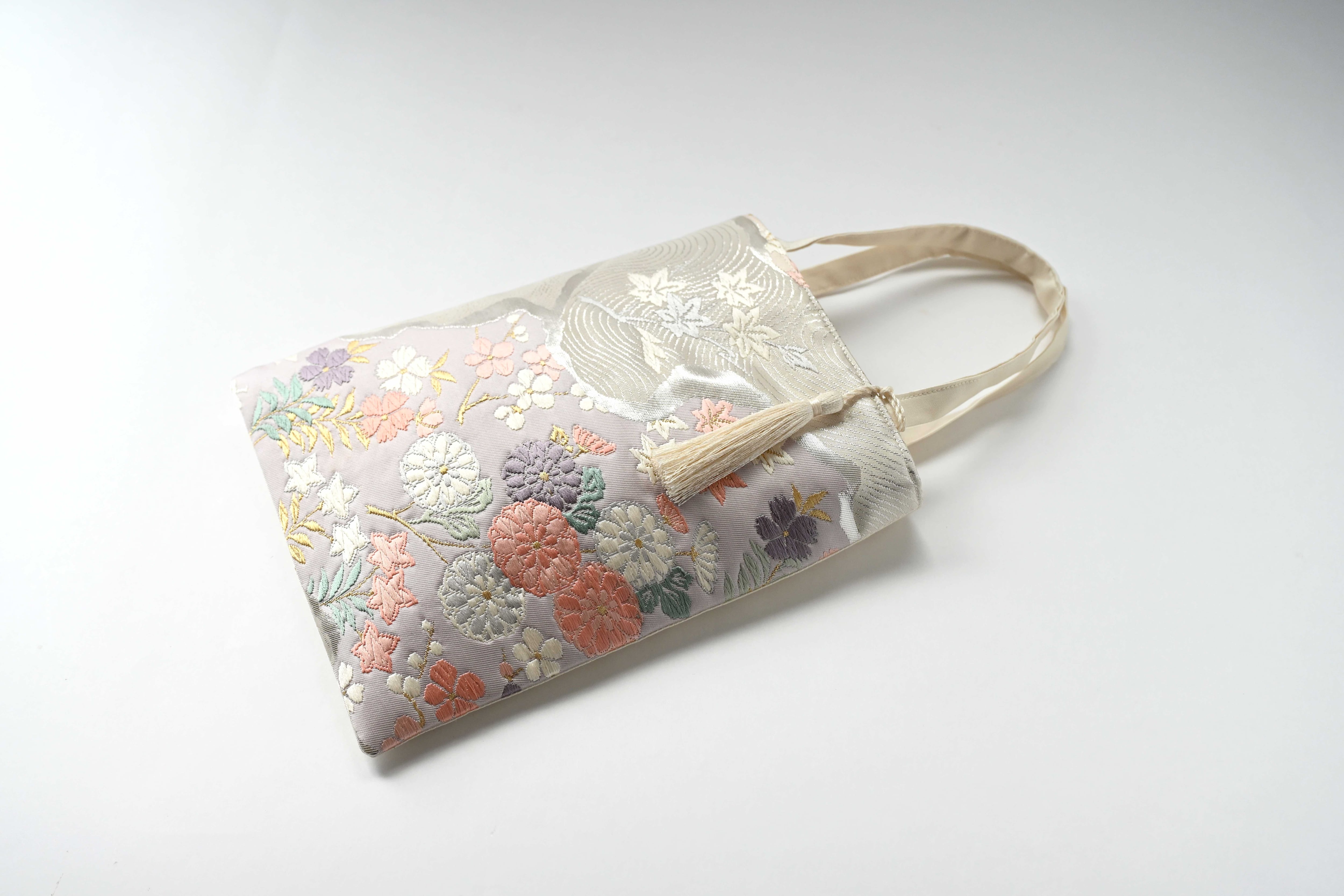 花模様のシルク帯で作られたバッグは可愛らしくも、シルクならではの上質感があります。