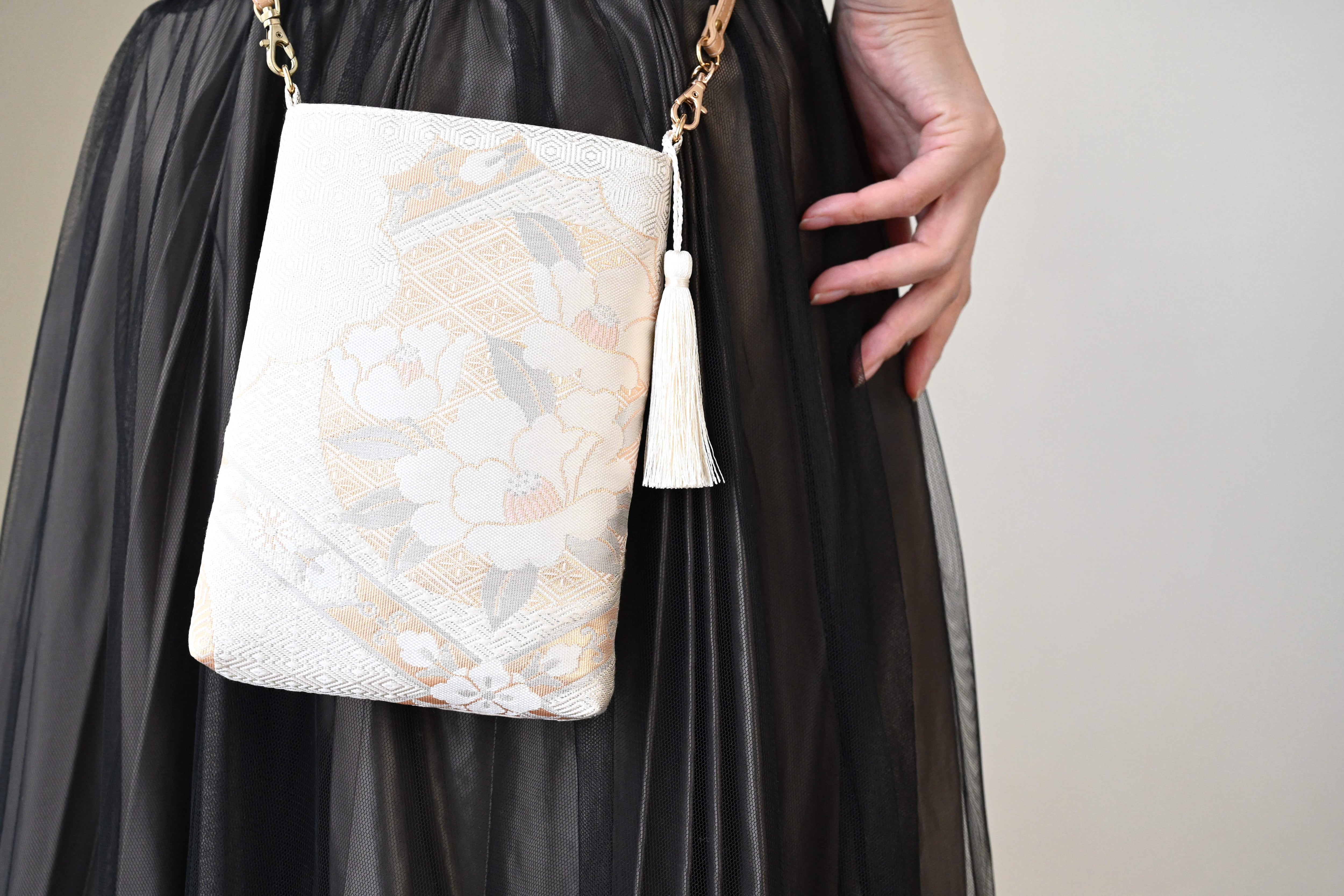 【花丸模様 ベージュ・シルバー シルク帯リメイクスマホショルダーバッグ】日常使い、お呼ばれの日、結婚式バッグ、フォーマルバッグ、誕生日ギフトとしても。