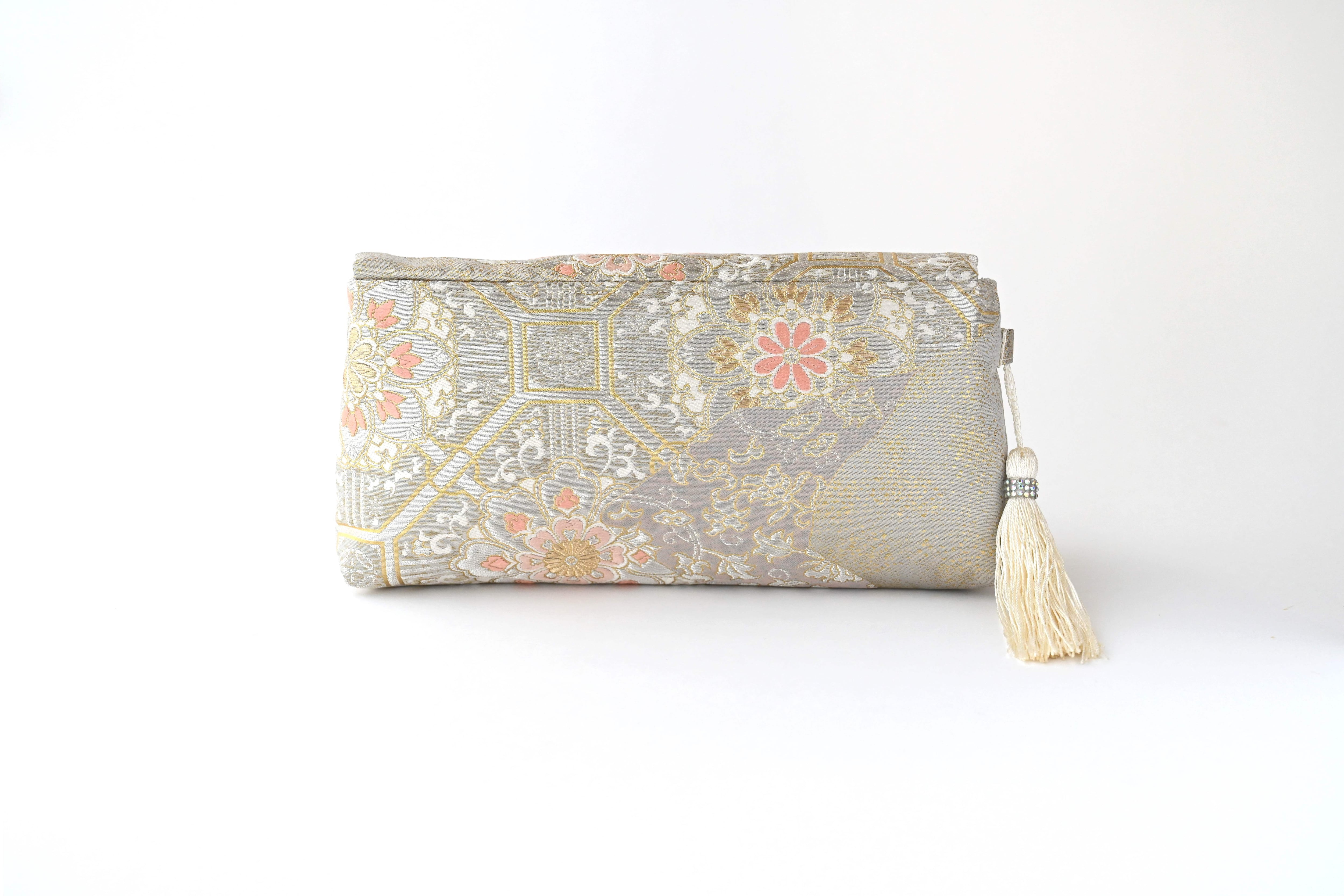 西陣織の老舗 服部織物製 蜀江文に雲取り・花唐草模様の上質なシルク帯で製作した2Wayクラッチ&ハンドバッグです。