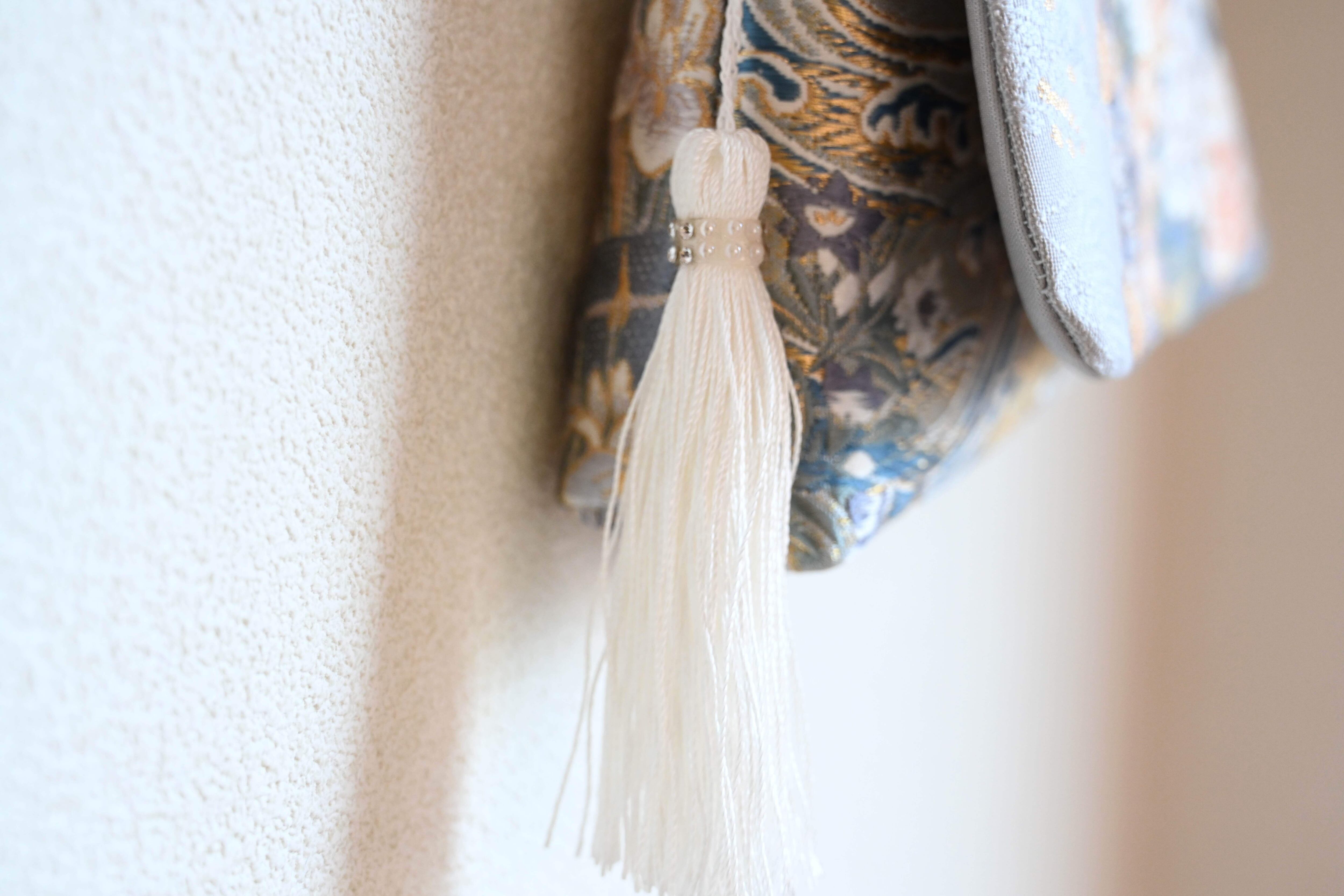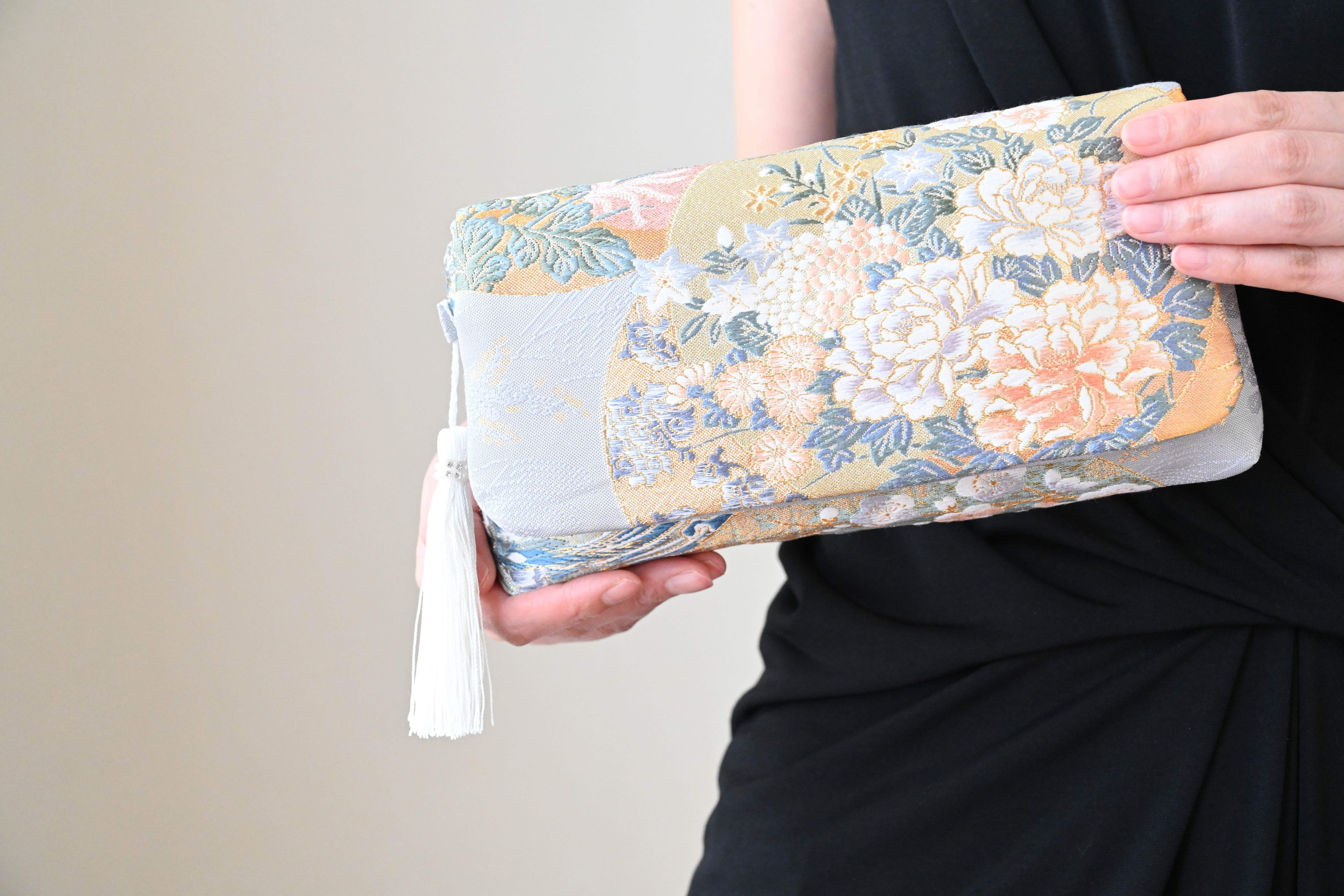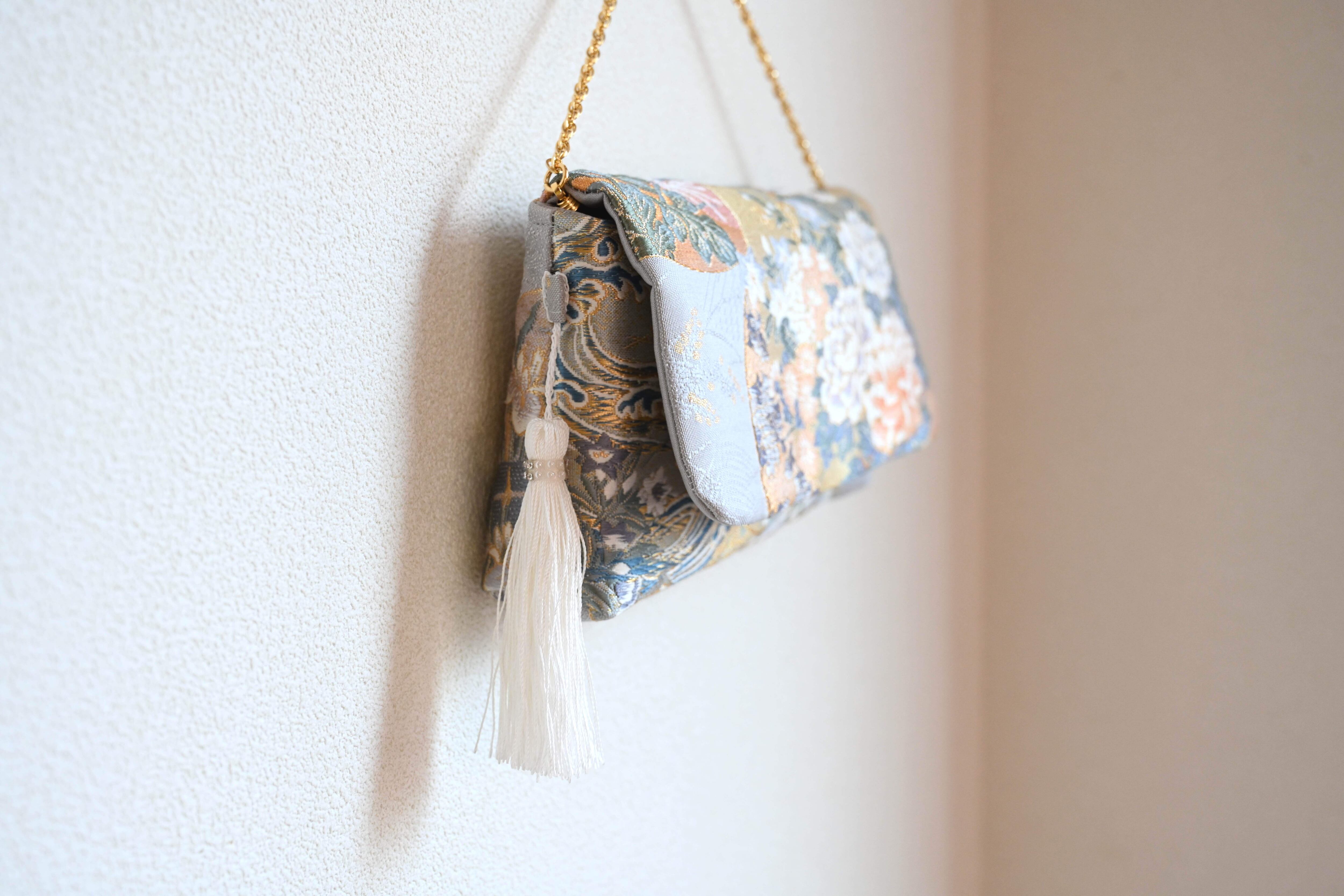 フォーマル帯のため、結婚式やパーティーのバッグとして、格も申し分なく、シンプルなワンピースに合わせるだけで、フォーマルな場にふさわしいワンランク上のコーディネートに。