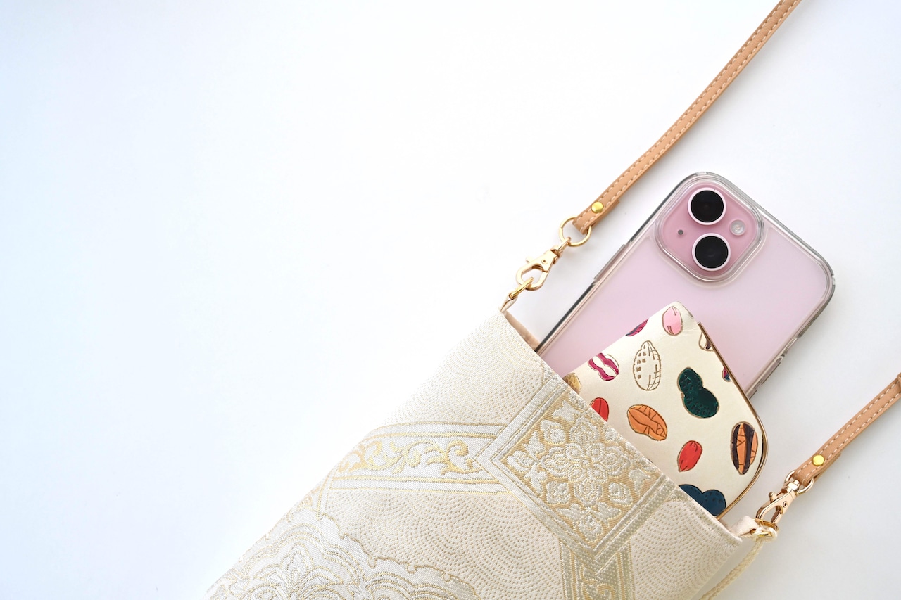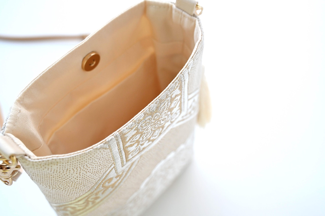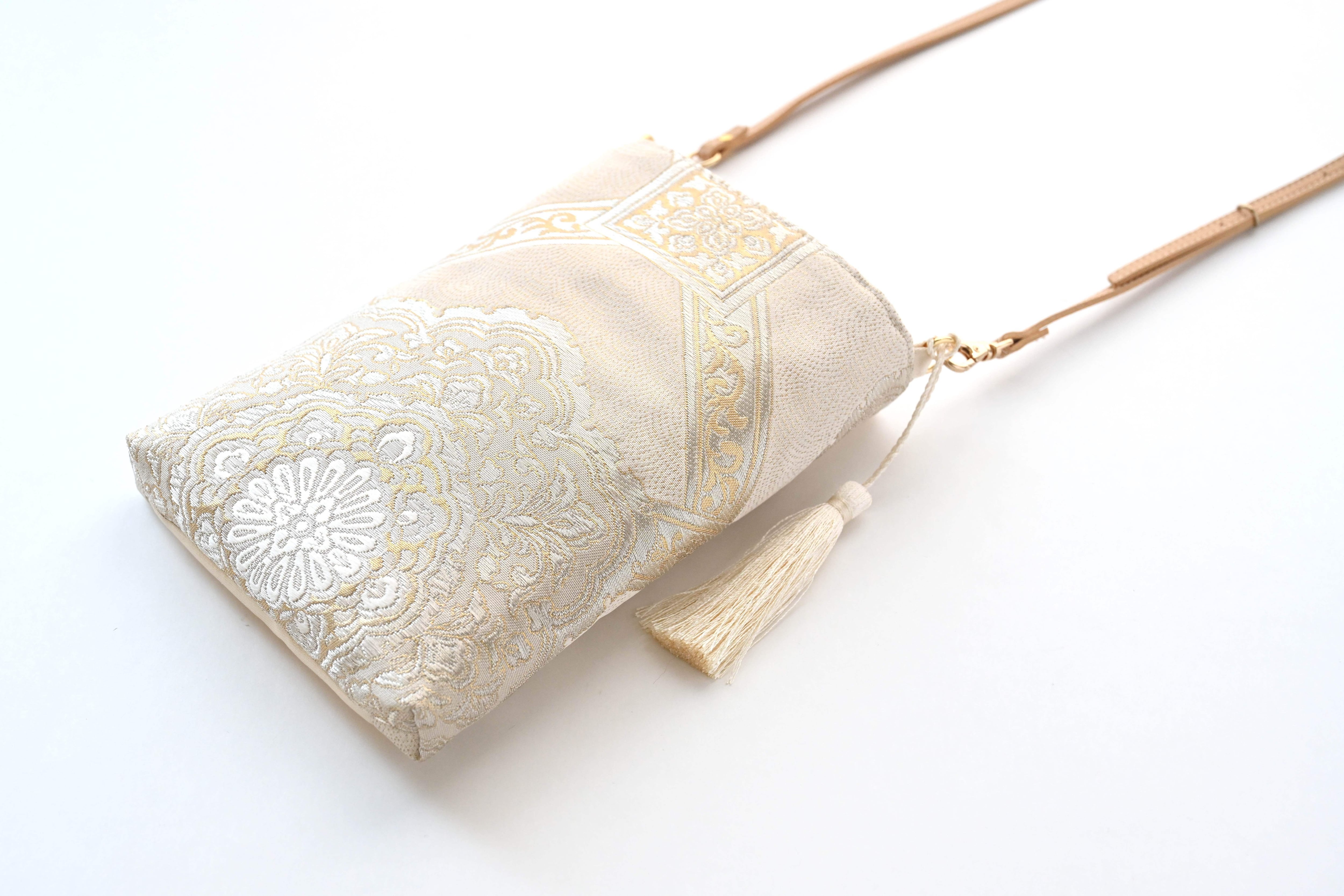 【華紋模様織 ゴールド・クリーム色 シルク帯リメイク スマホショルダーバッグ】日常使い、お呼ばれの日、結婚式バッグ、フォーマルバッグ、誕生日ギフトとしても。