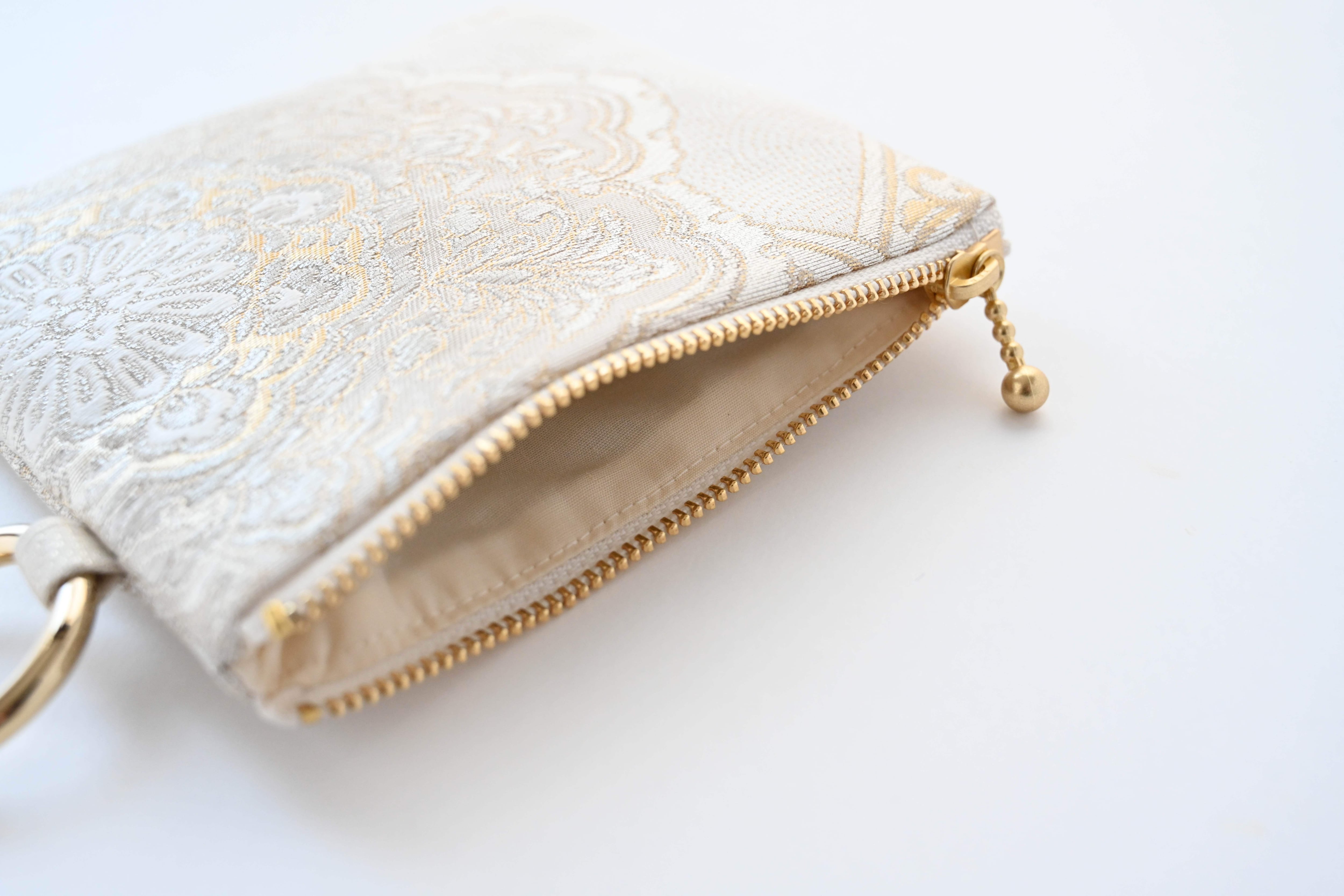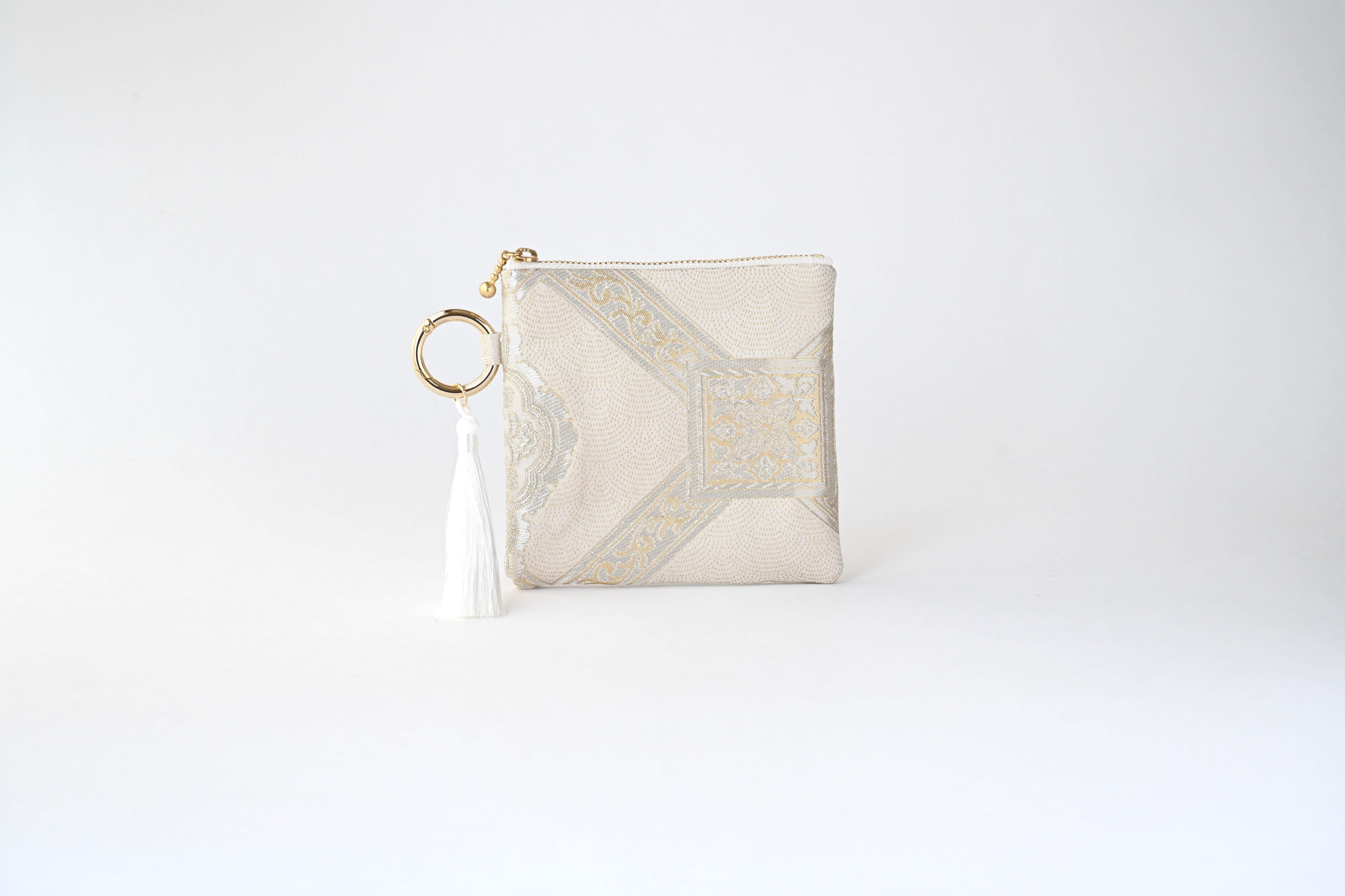 華紋模様織 ゴールド・クリーム色のシルク帯で製作したバッグチャーム型スクエアポーチです。やわらかで上品な色合いで、静かな華やかさがあります。
