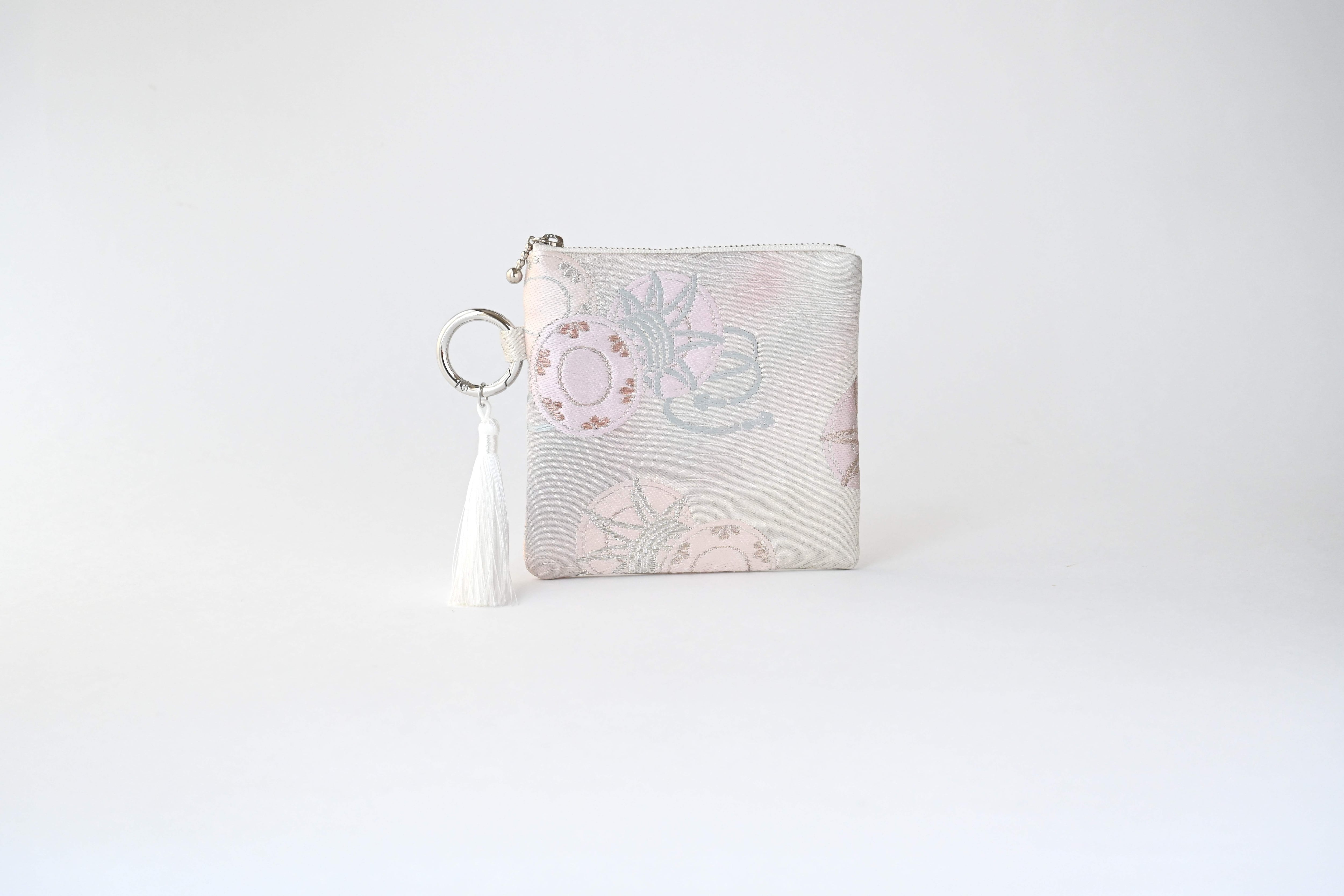 鼓模様 シルバー シルク帯で製作したバッグチャーム型スクエアポーチです。
