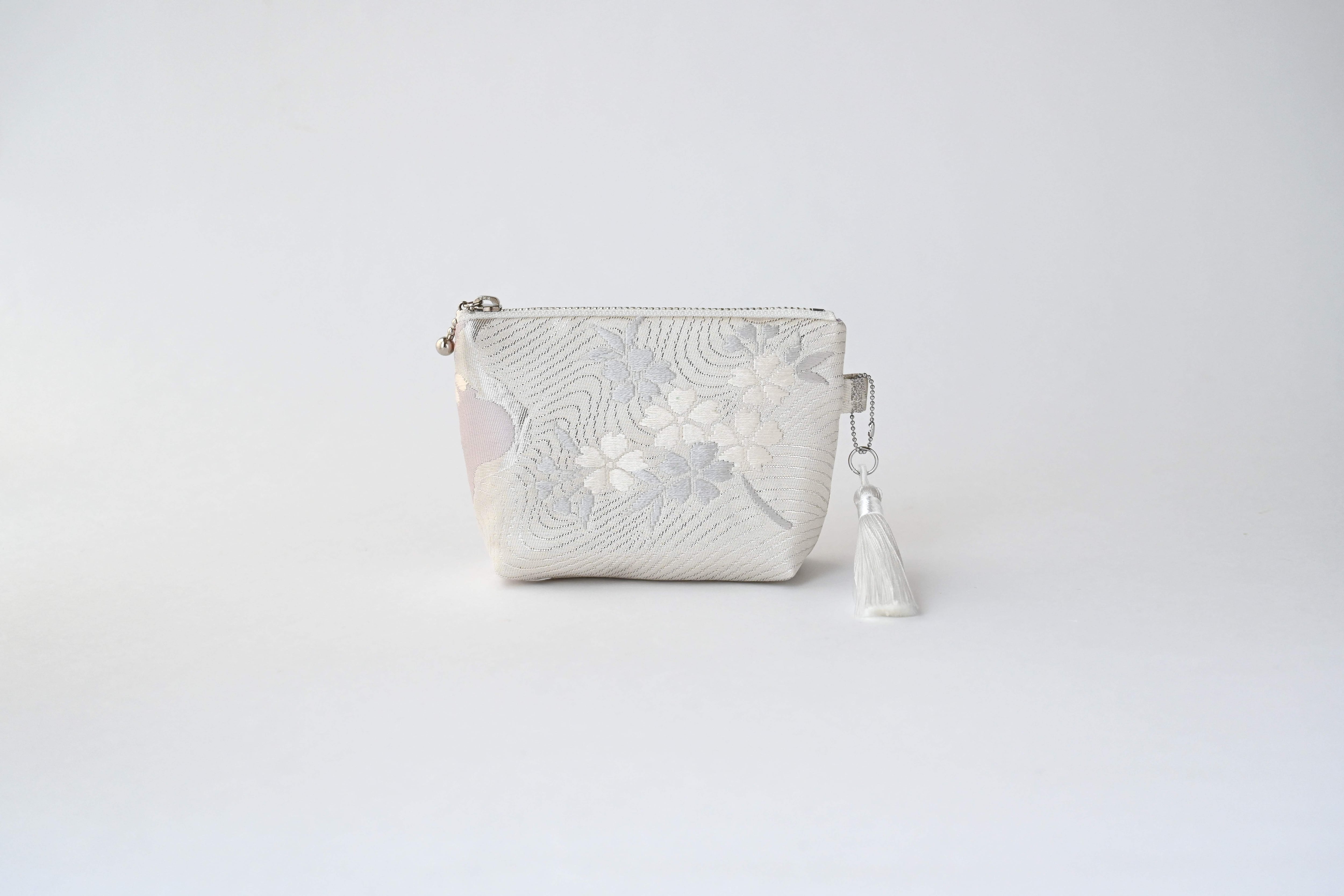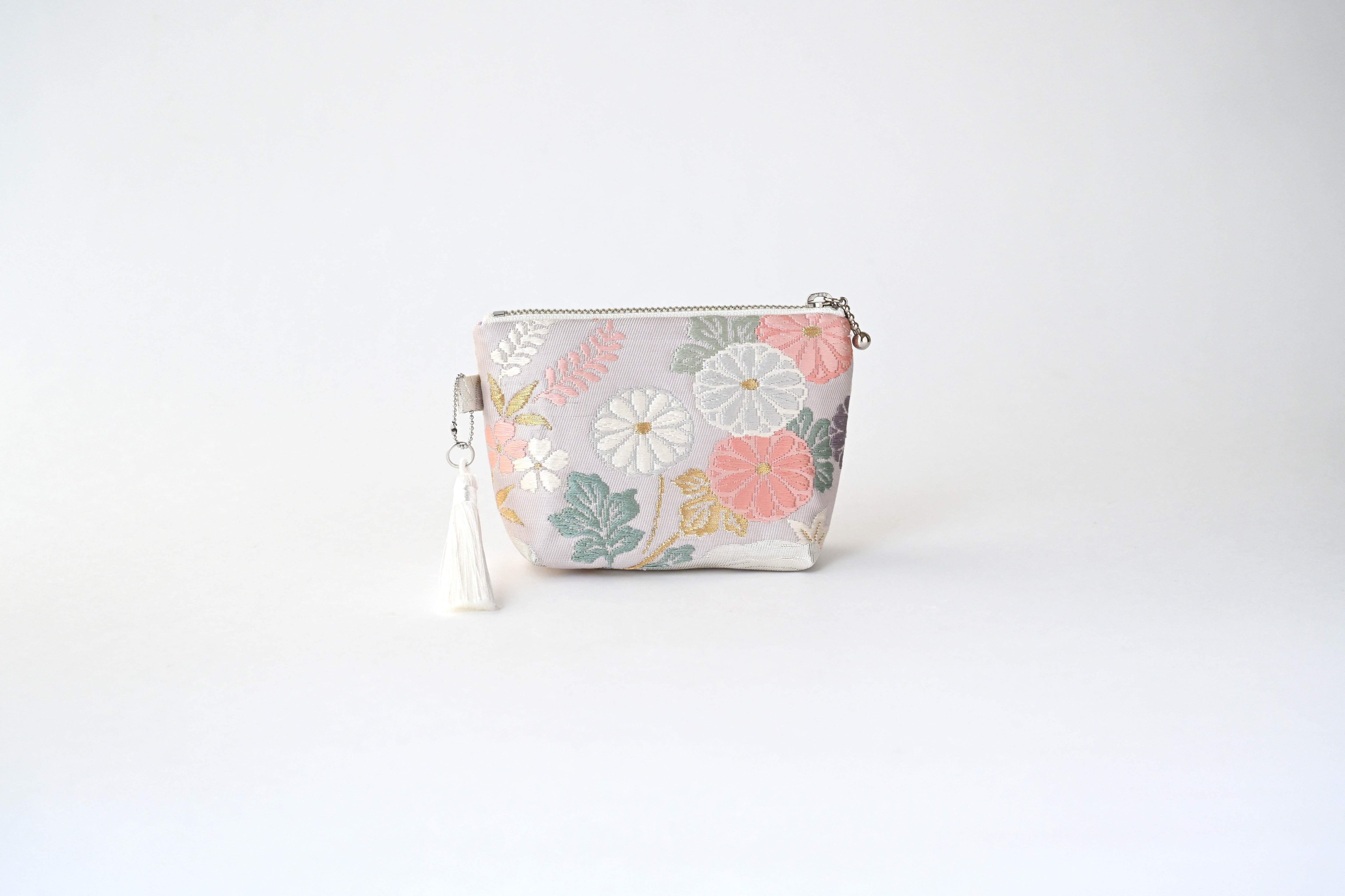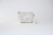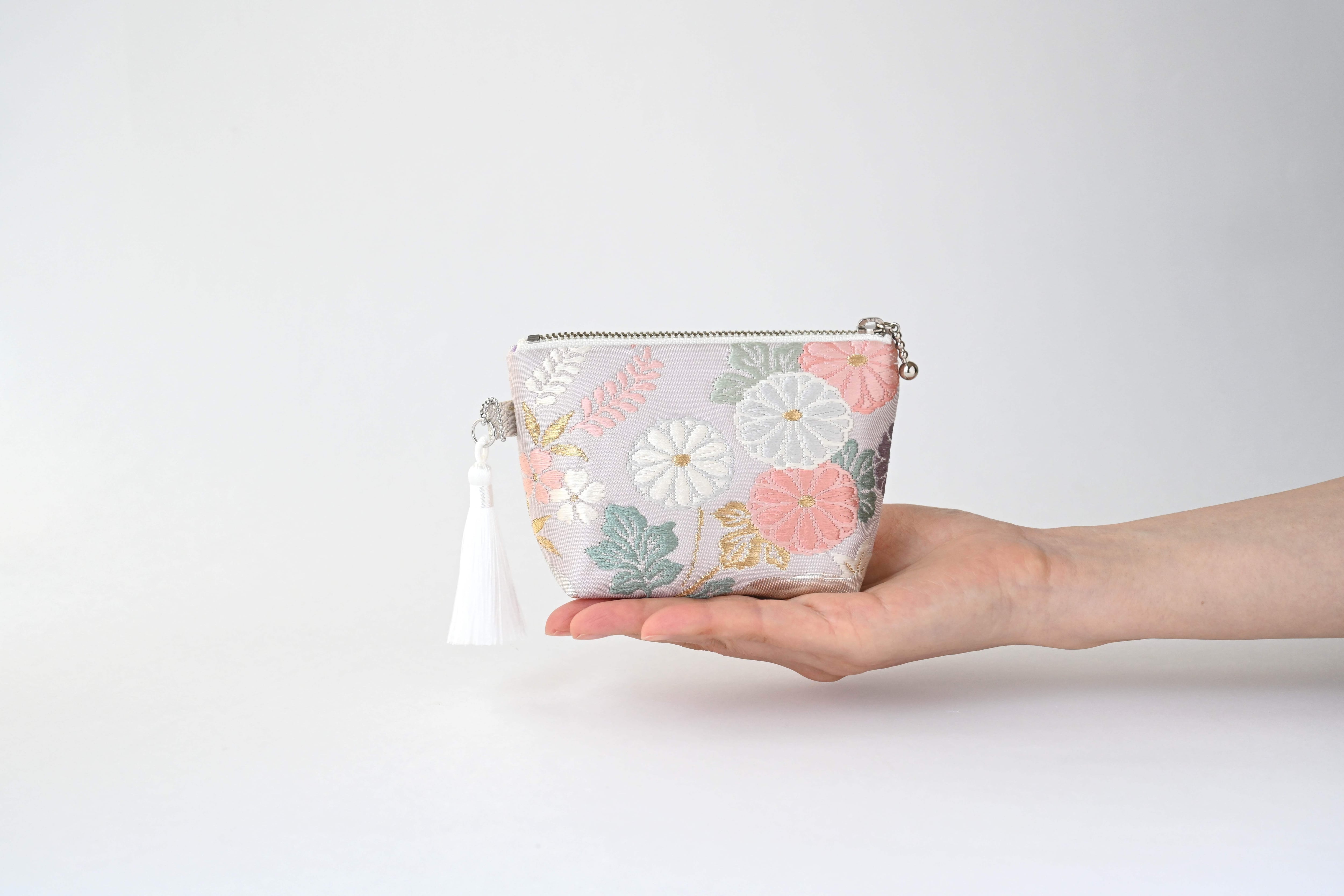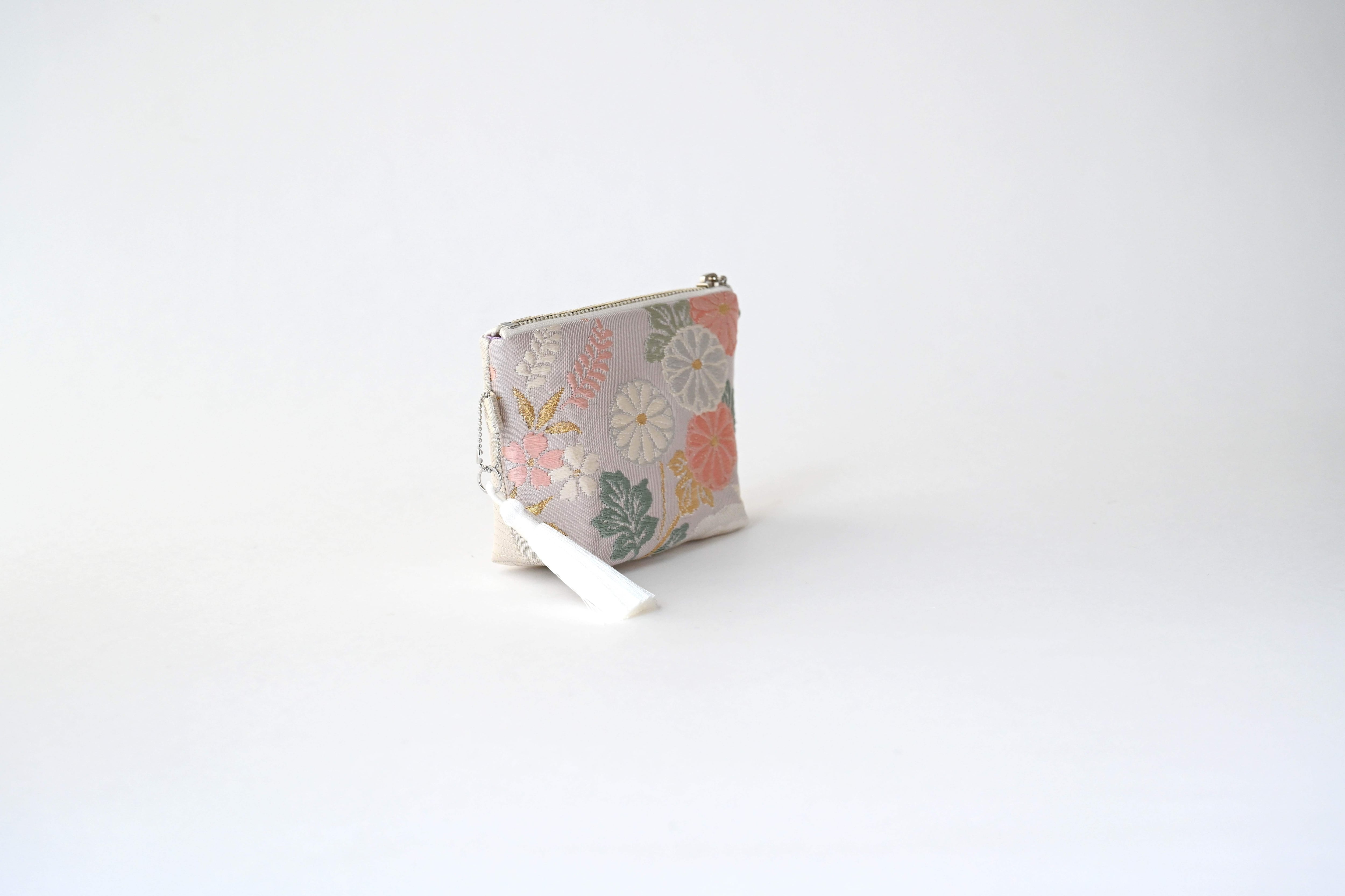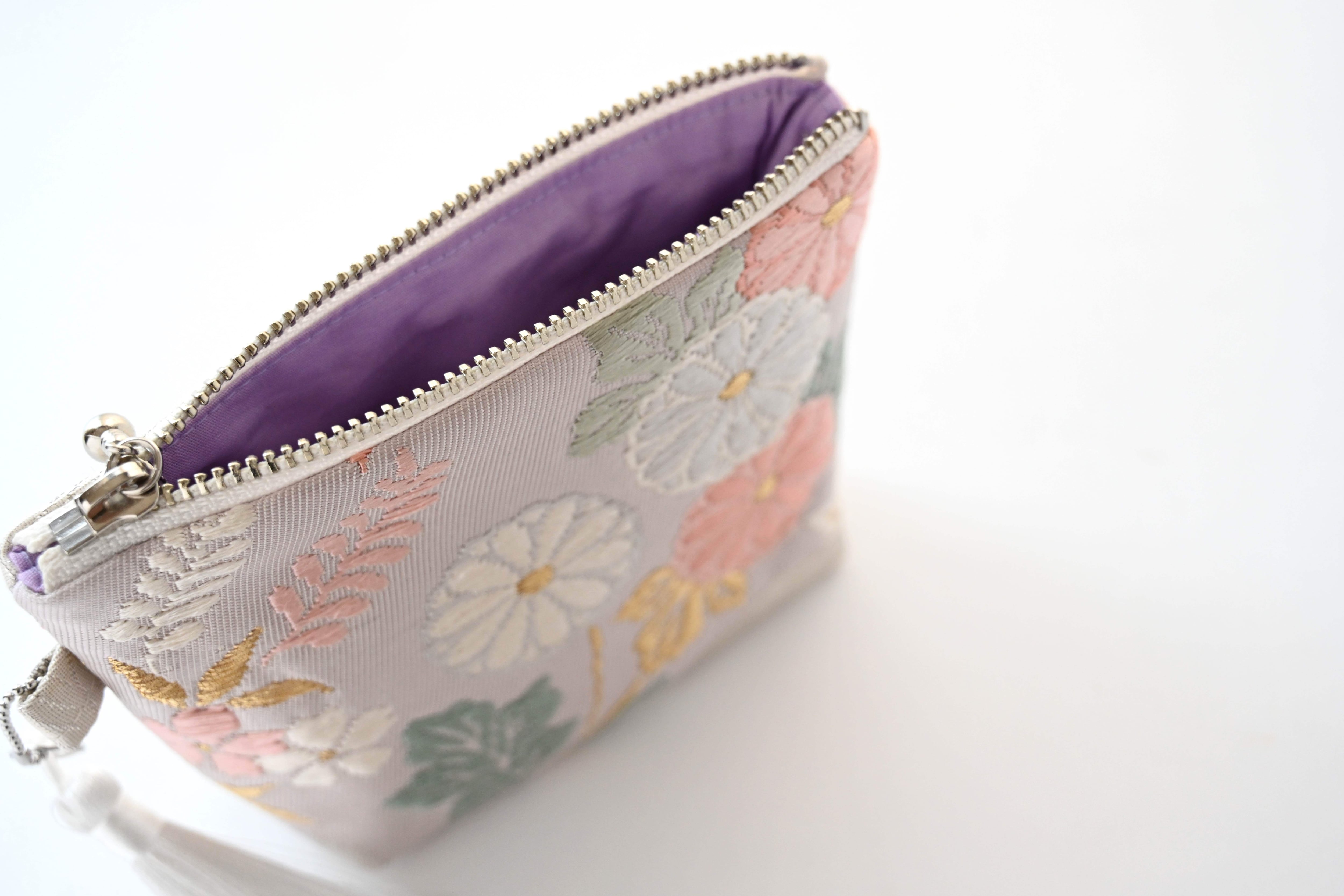 花々・色紙・波模様 シルバー 薄紫のシルク帯を使って製作したミニポーチです。