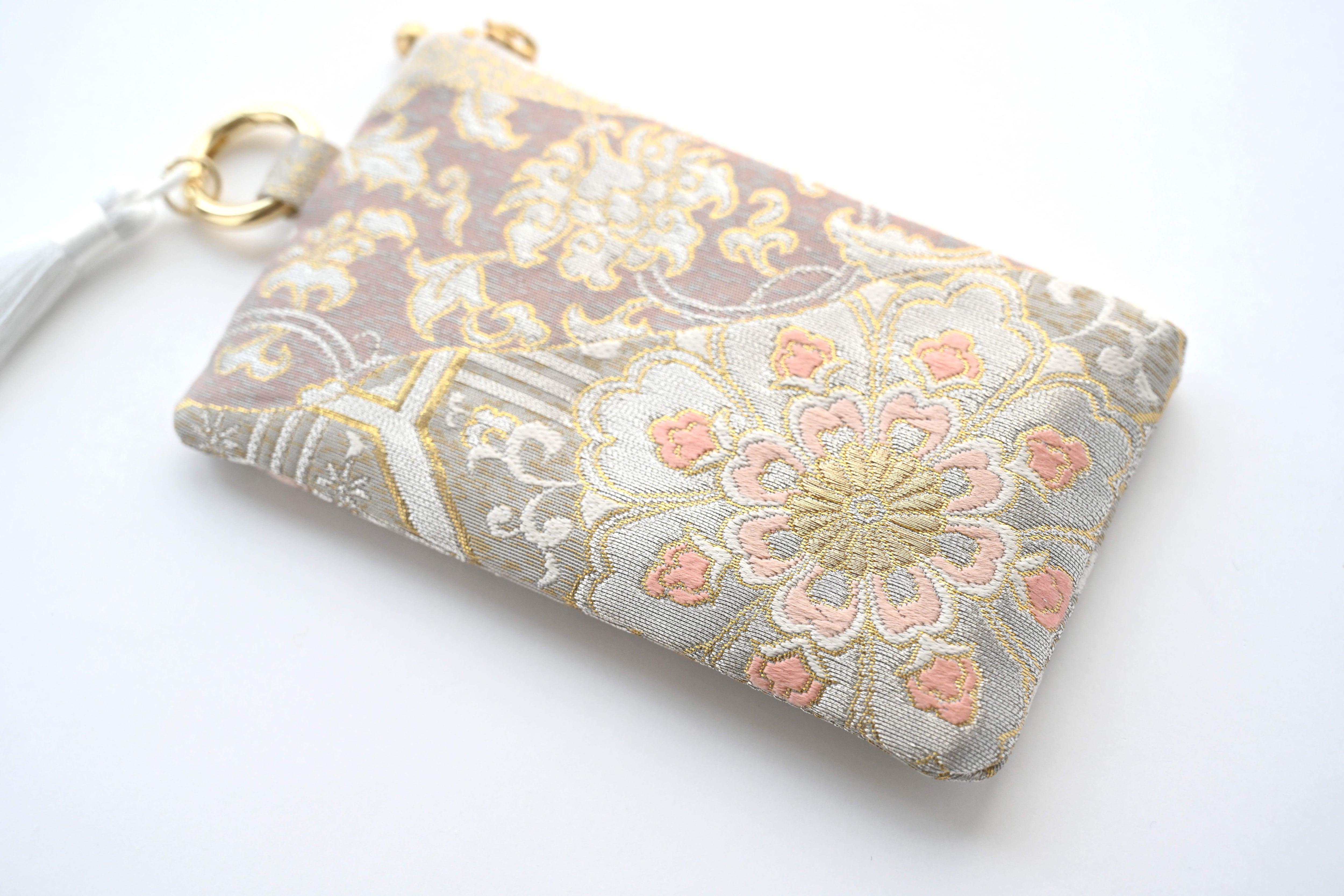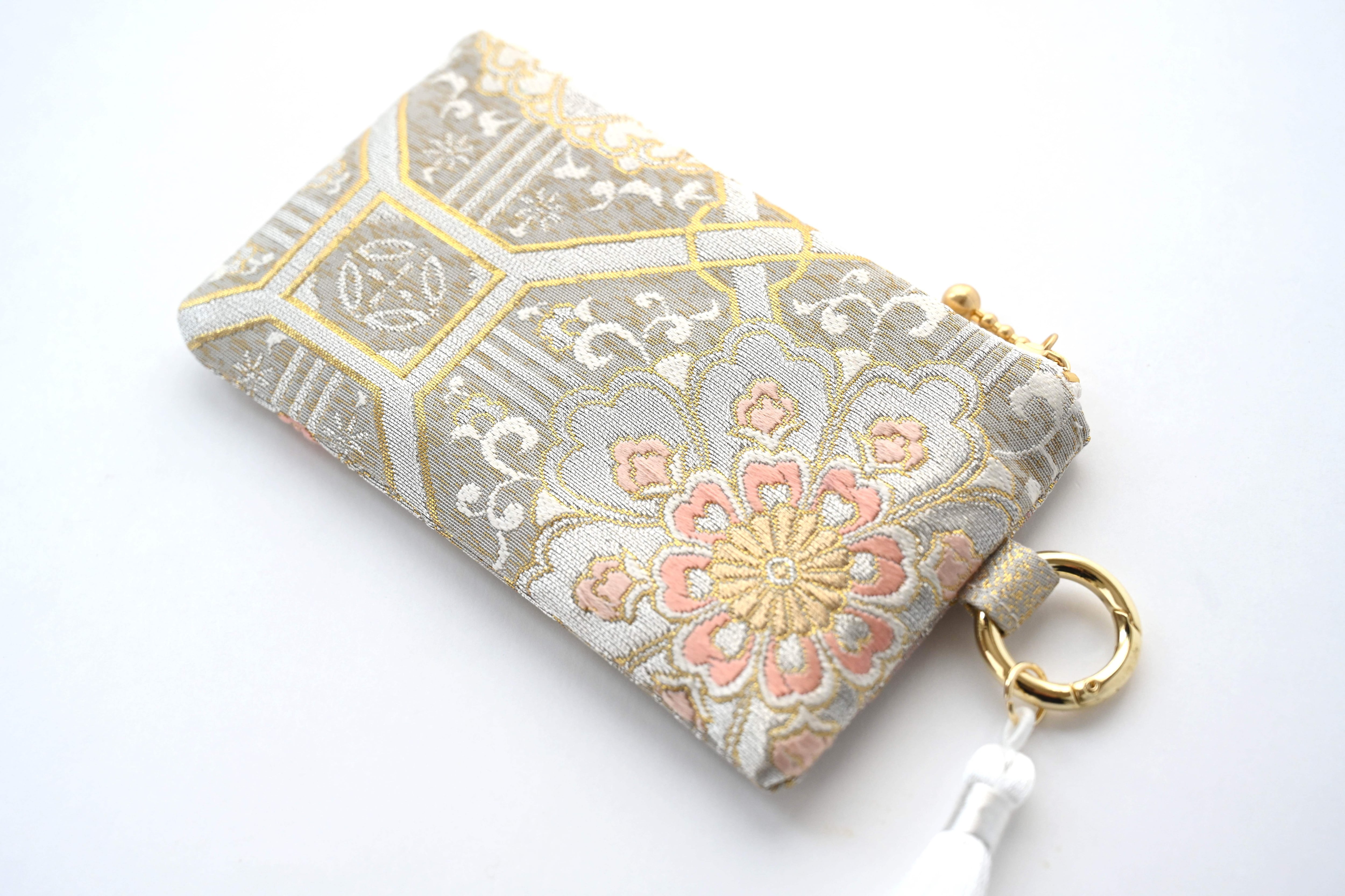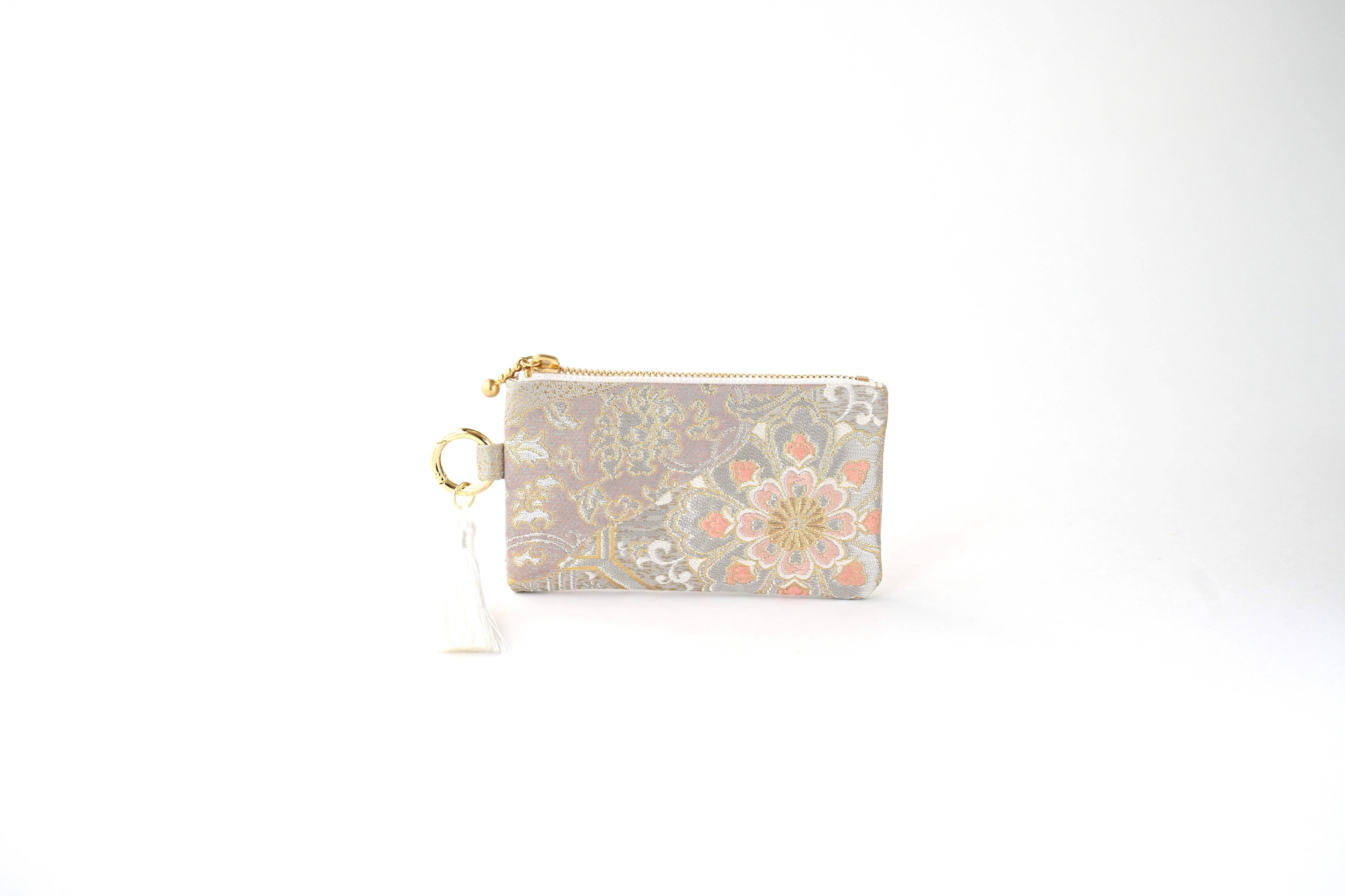 【西陣織・服部織物製蜀江文に雲取り・花唐草模様 シルク帯リメイク カラビナ付きミニポーチ】カードポーチ、メイクポーチ、ミニ財布、誕生日、外国人の方へのギフトにも。