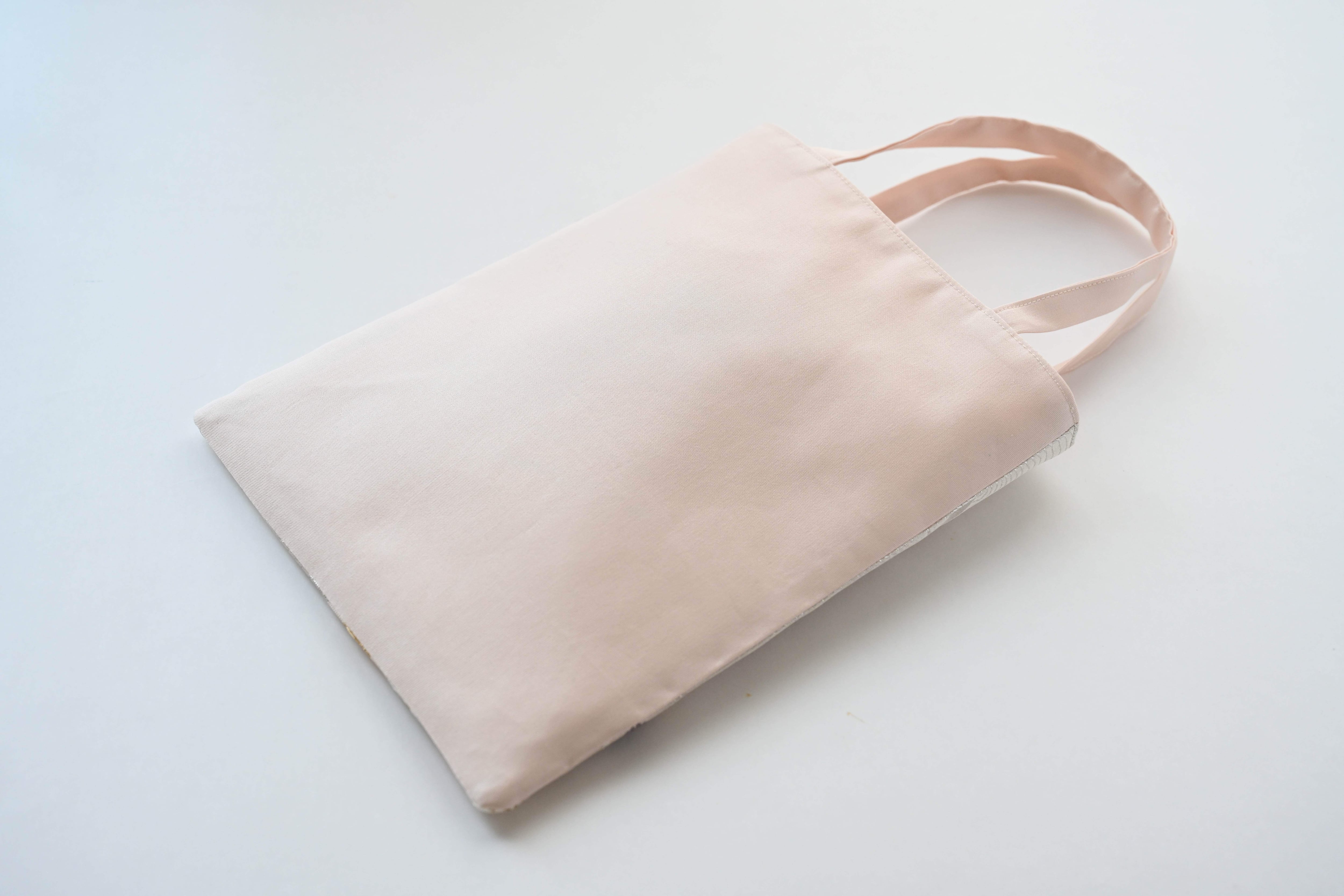 花々・色紙・波模様 シルバー 薄ピンクのシルク帯を使ったミニサブバッグです。