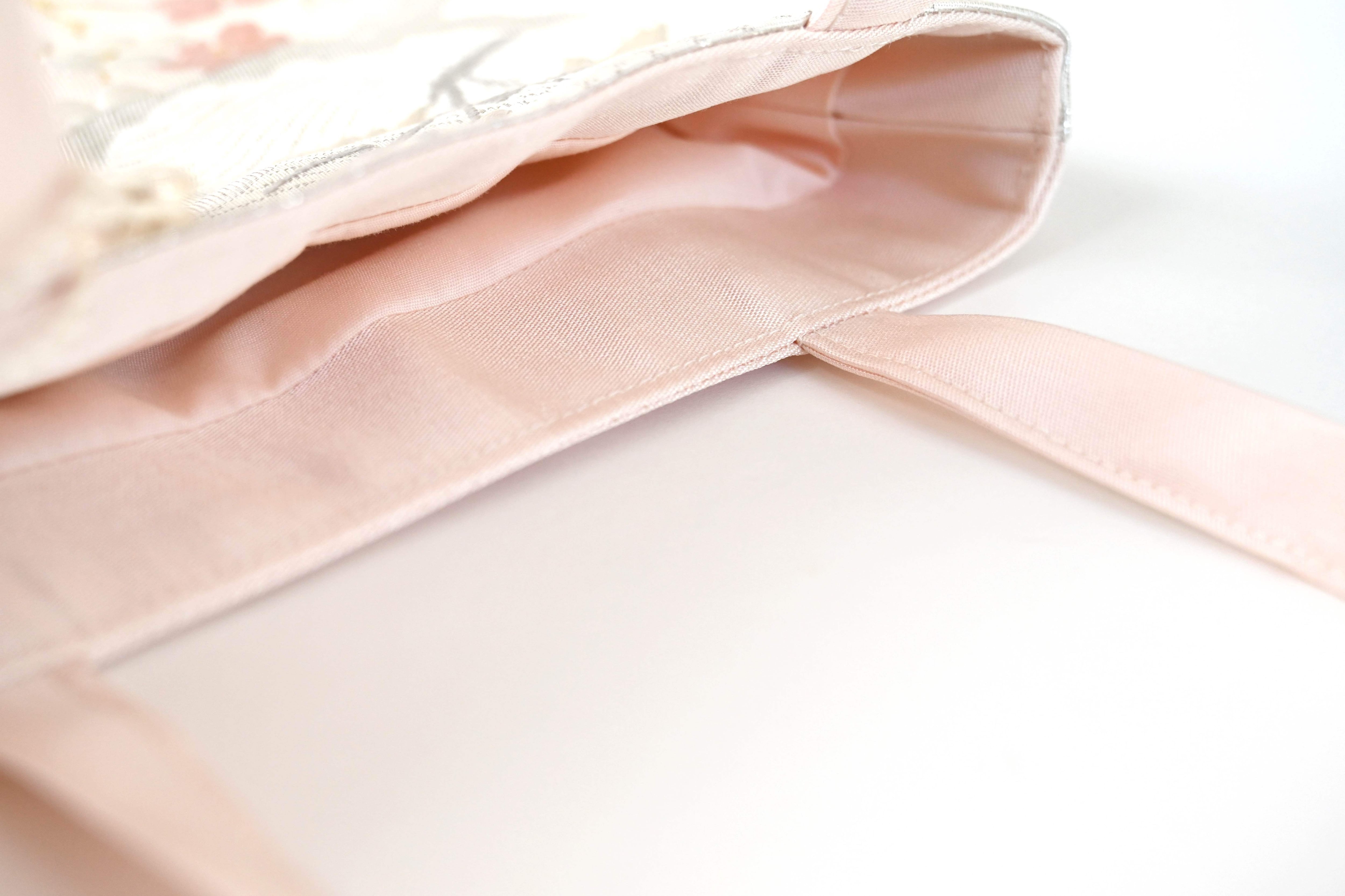 【花々・色紙・波模様 シルバー・薄ピンク シルク帯リメイク ミニサブバック フォーマルバック】日常使い、結婚式、パーティー、和装、入学式、卒業式にも。