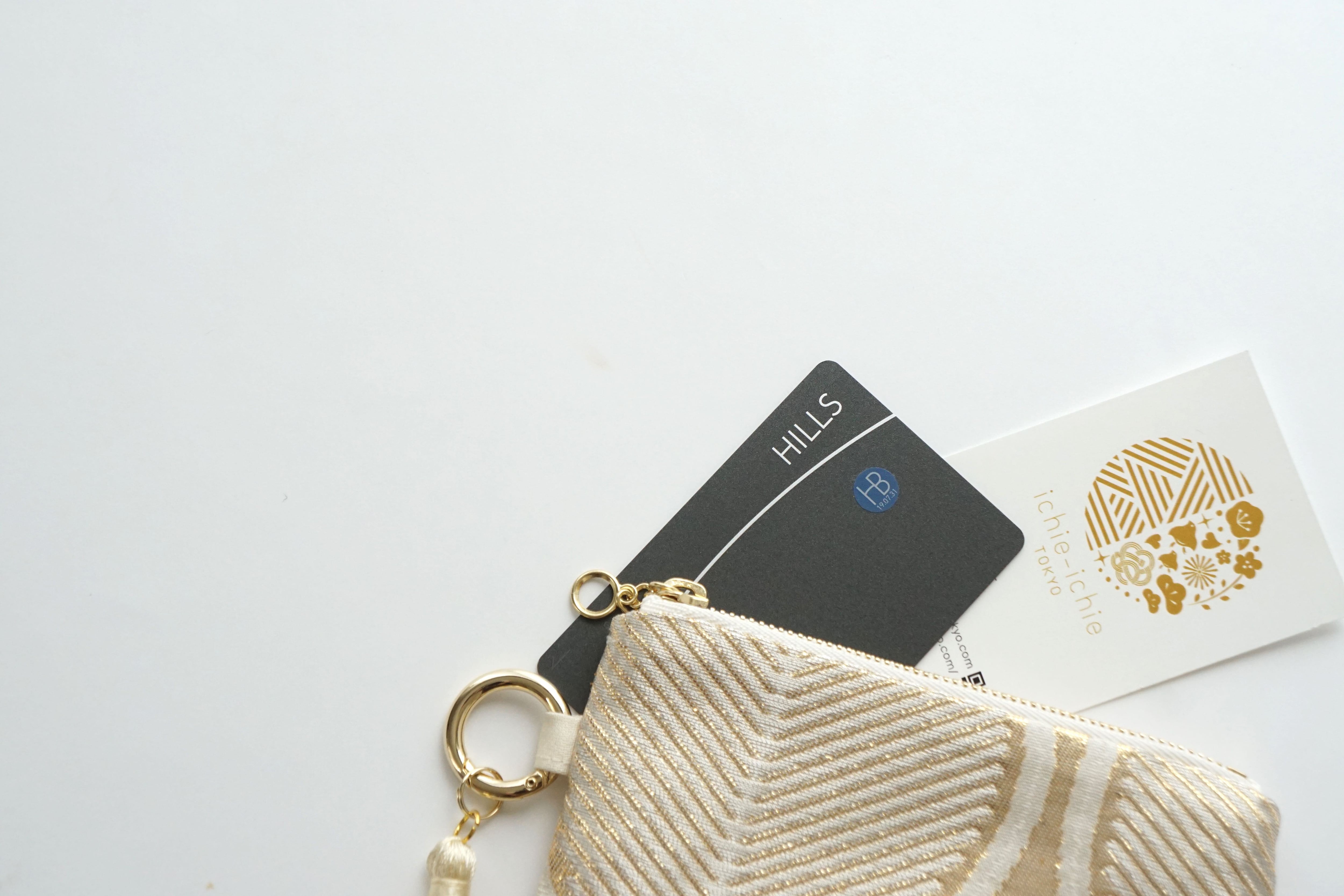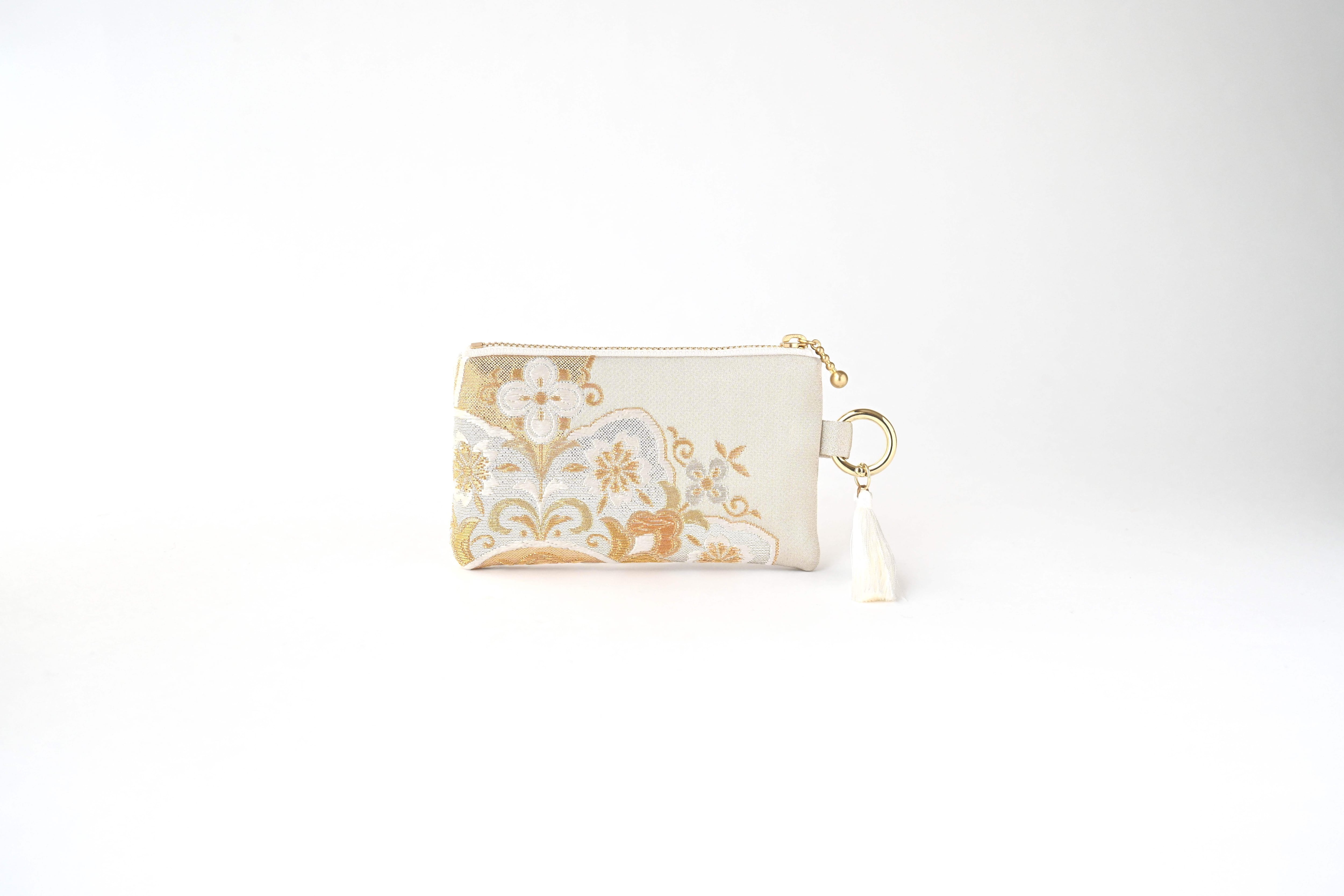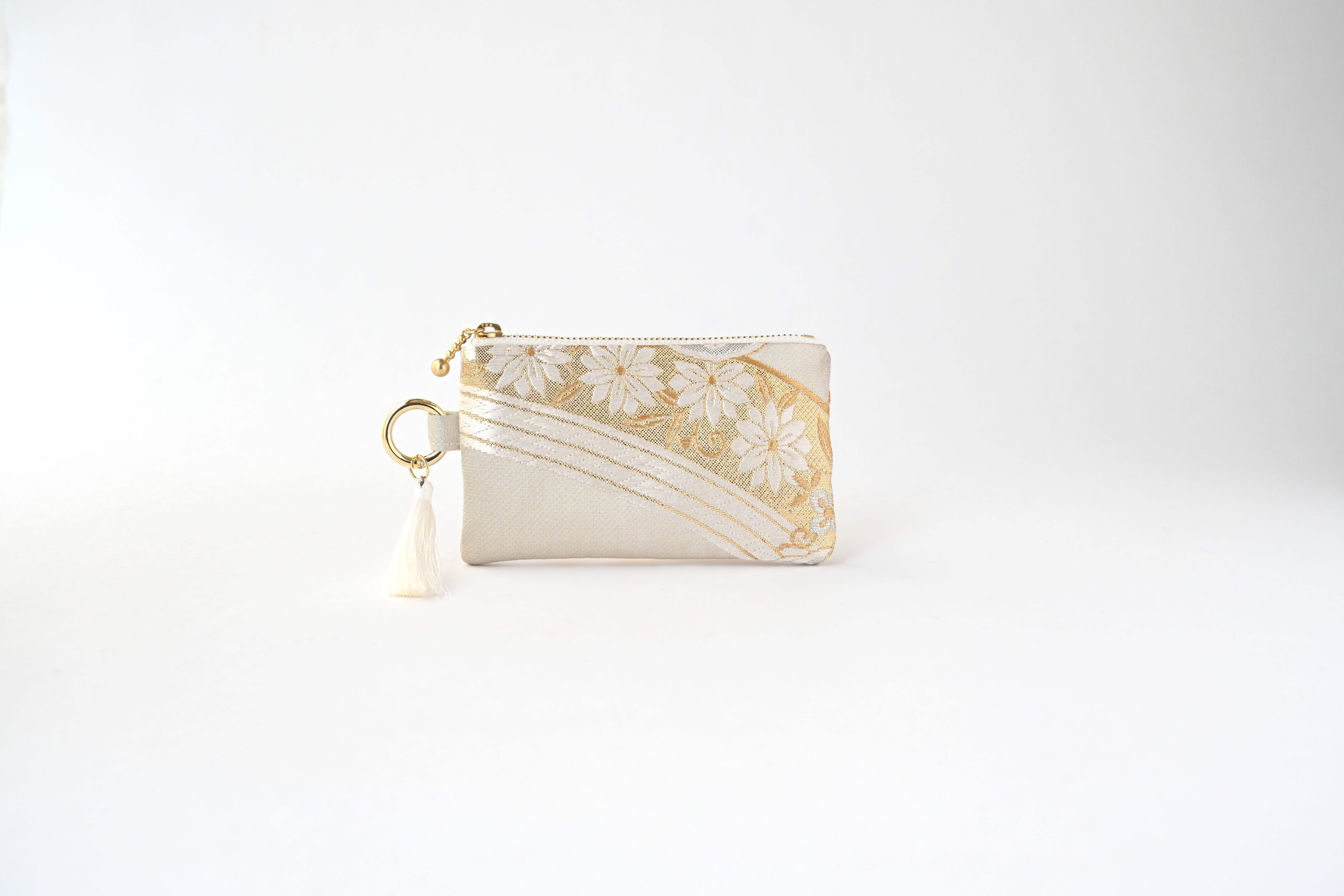 【シルバー・ゴールド 華紋様 シルク帯リメイク カラビナ付きミニポーチ】カードポーチ、メイクポーチ、ミニ財布、誕生日、外国人の方へのギフトにも。