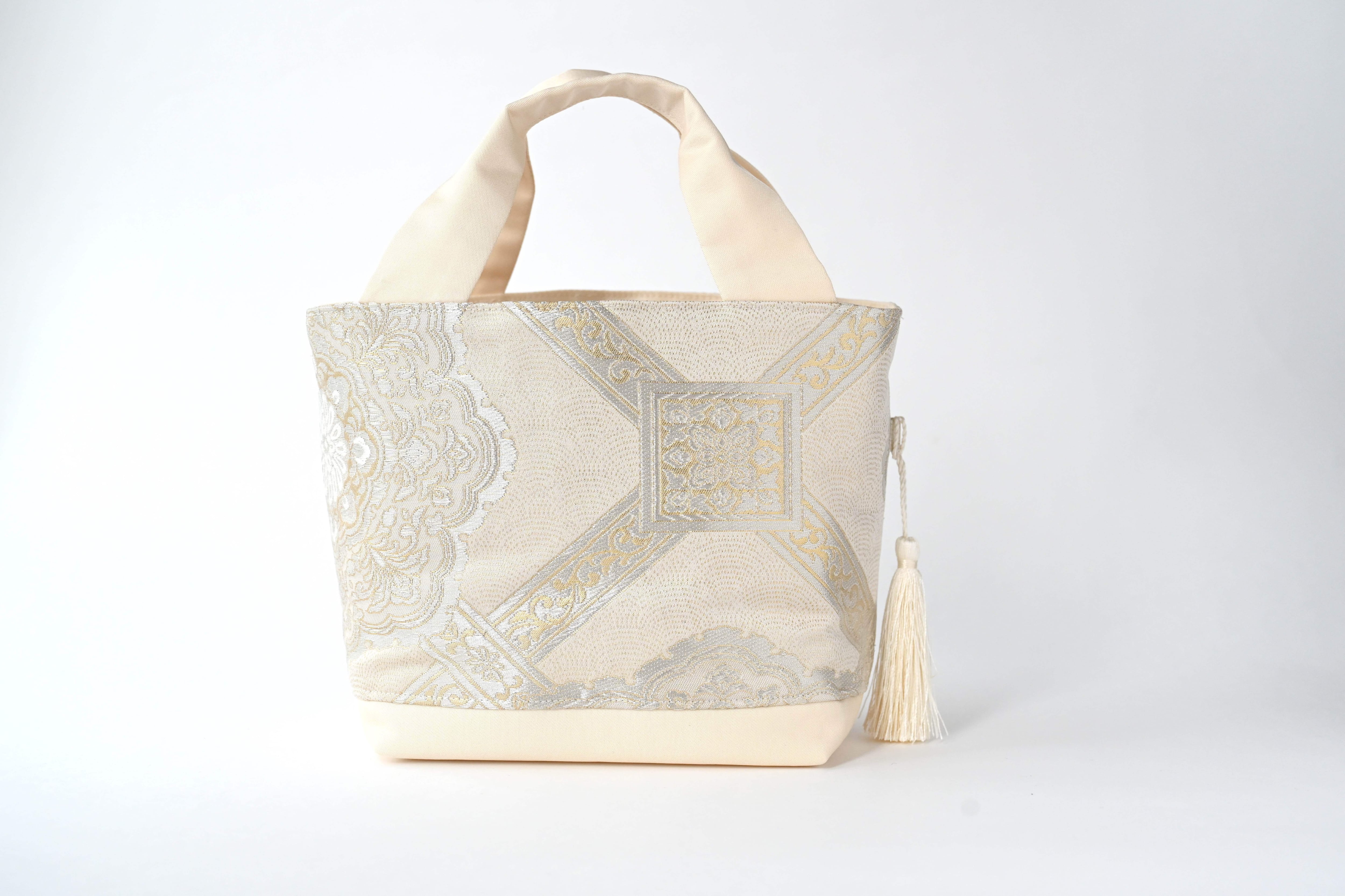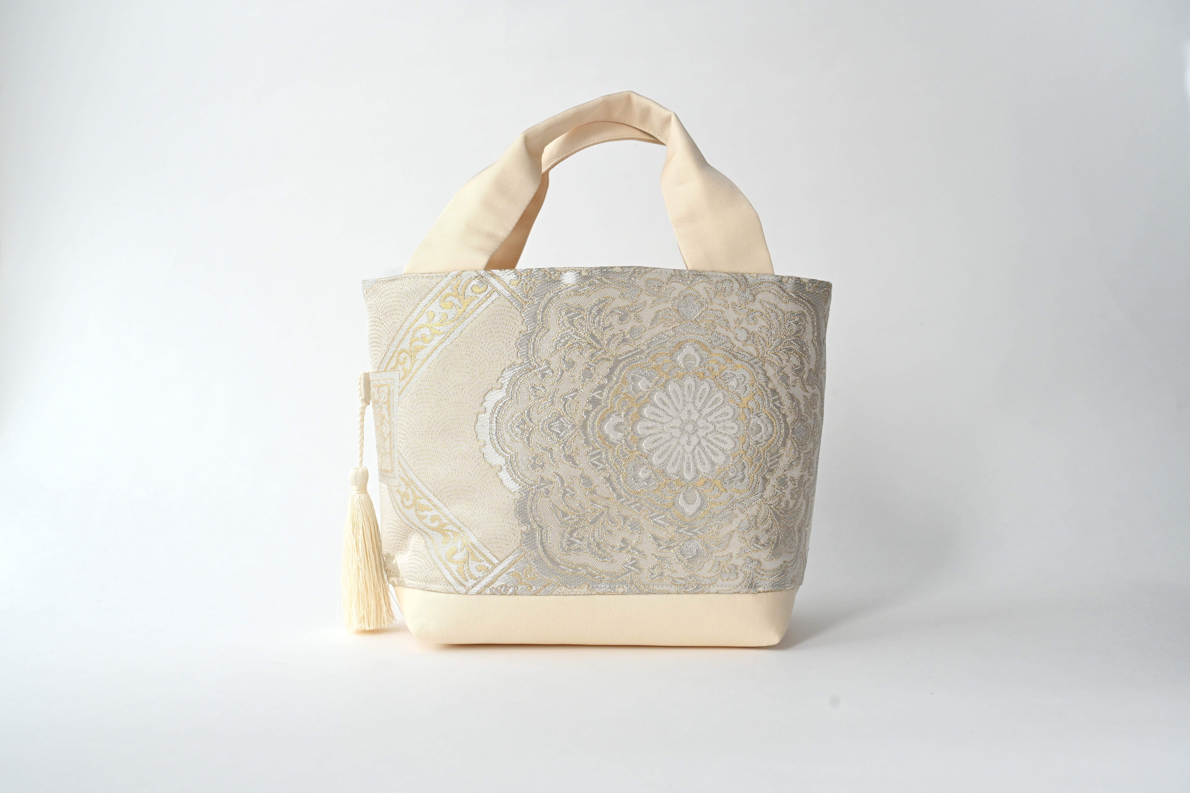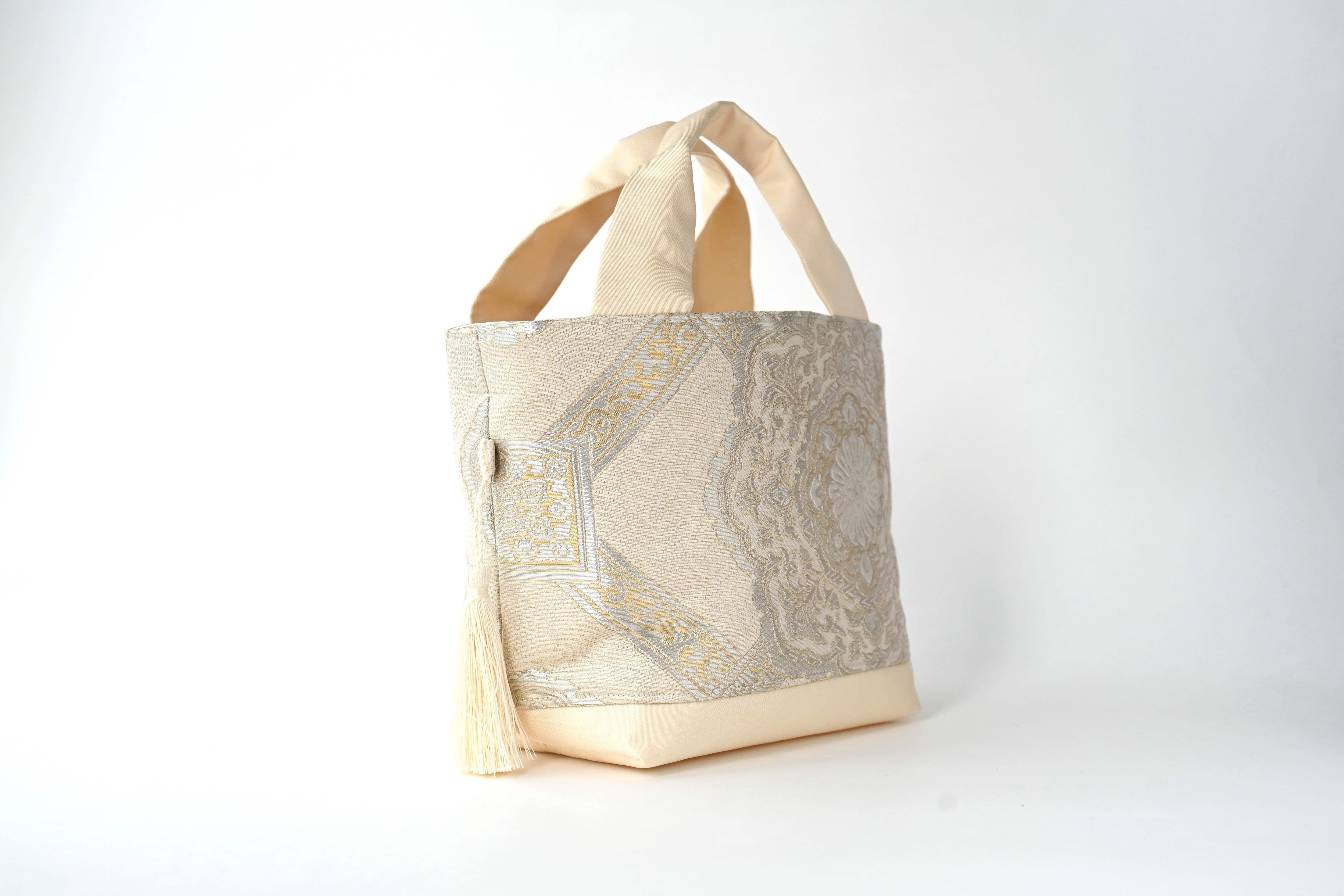 【 華紋模様織 ゴールド・クリーム色 帯リメイク トート型バッグ】日常使い、結婚式、パーティー、お呼ばれの日に。