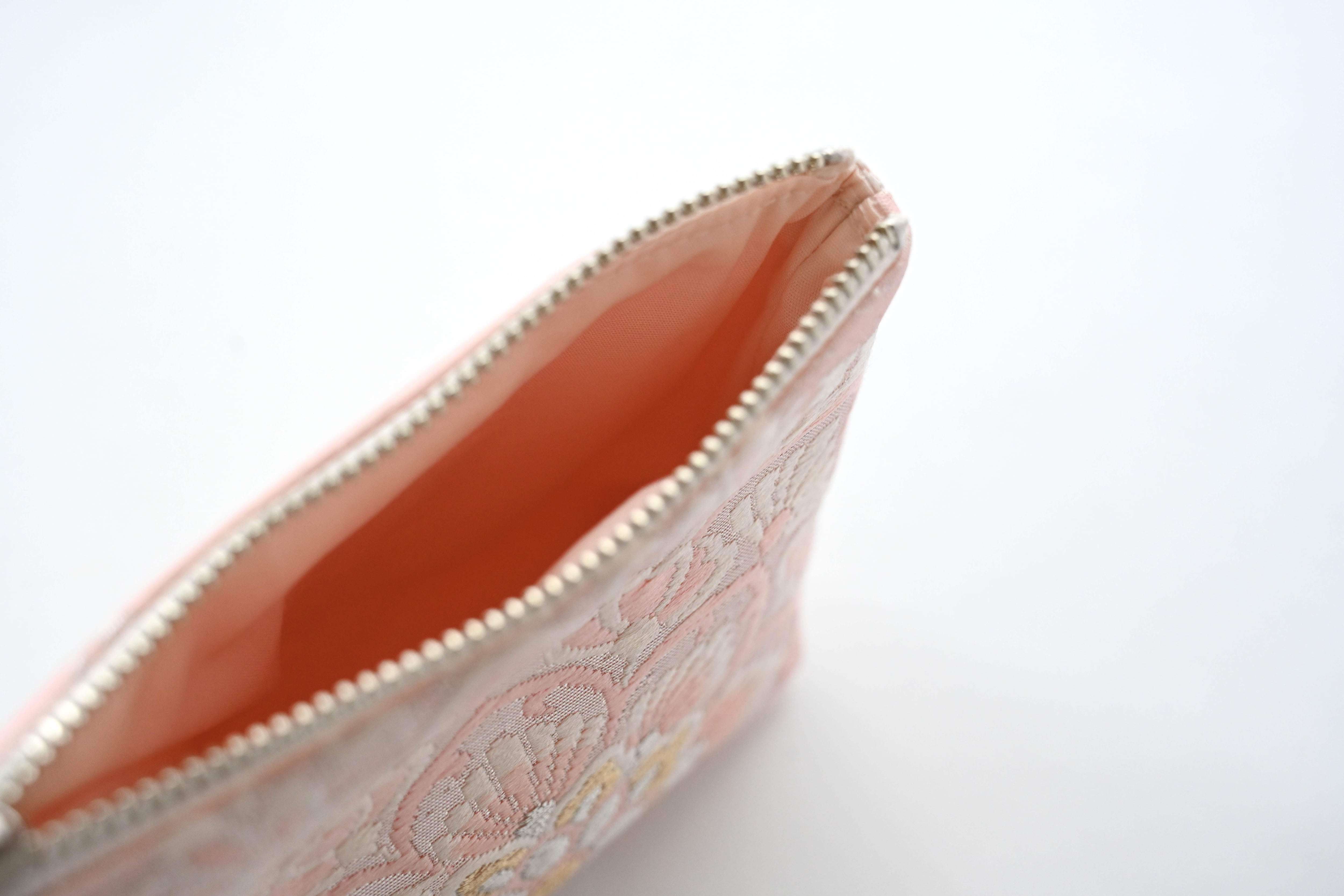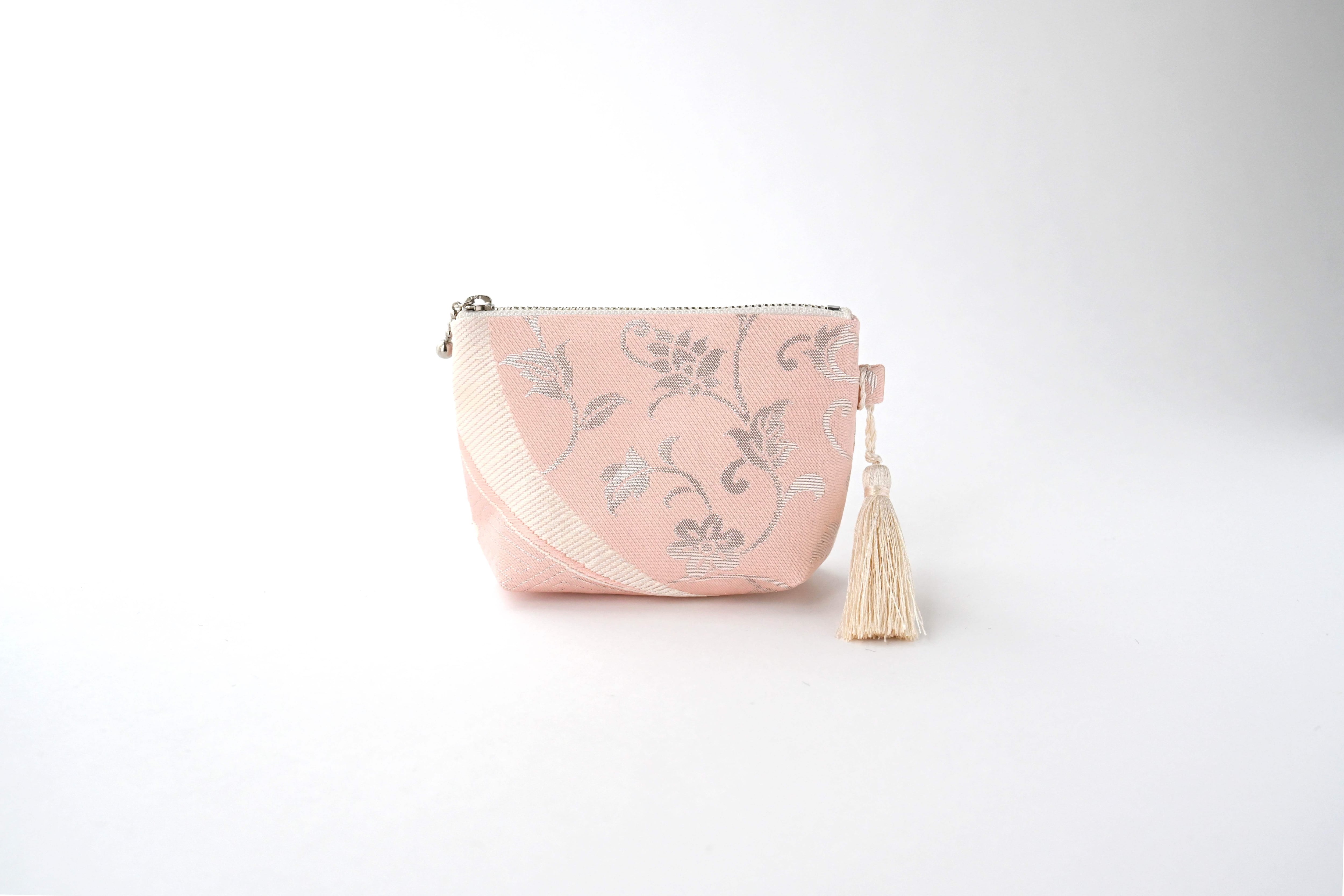 ピンクの帯地に華やかな華紋があしらわれたシルク帯で製作したミニポーチです。