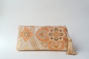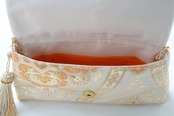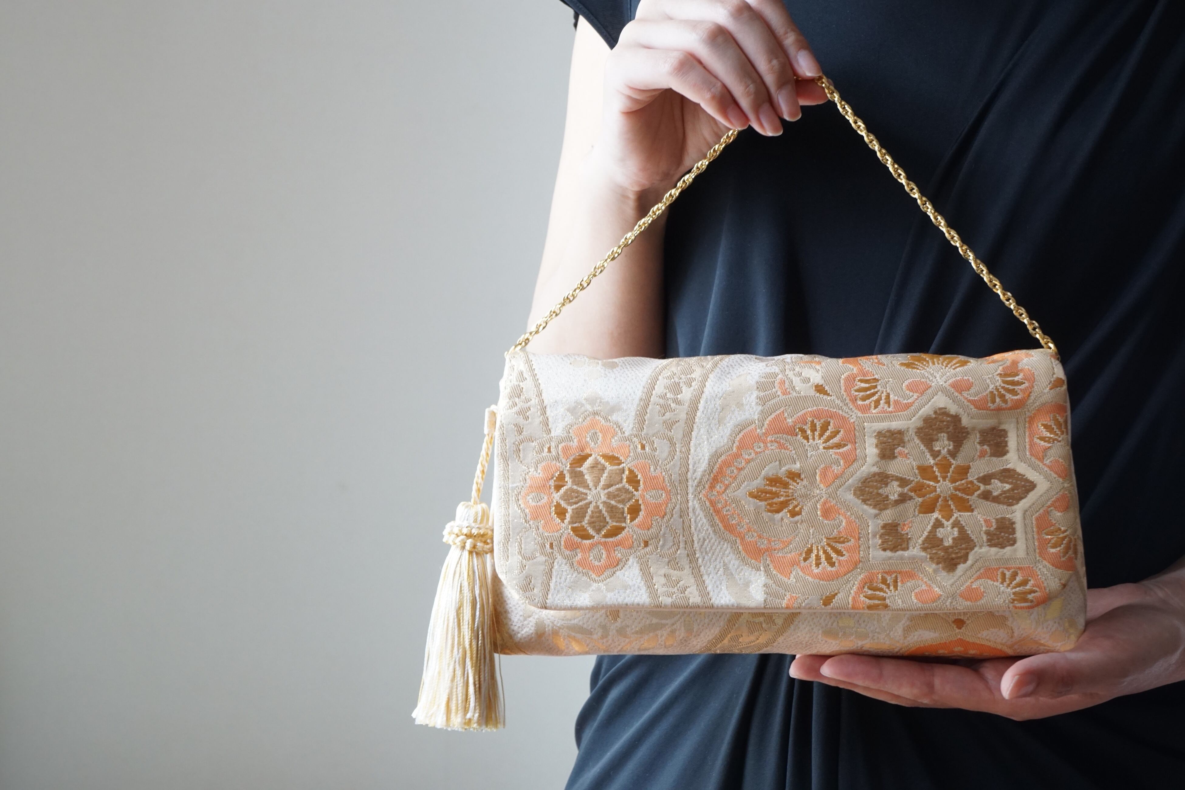 ゴールドとオレンジを貴重に描かれた文様が華やかで品のあるシルクのリユース帯を使った、2way クラッチバックです。チェーンの取り外しが可能で、手提げバックとしてもお使い頂けます。