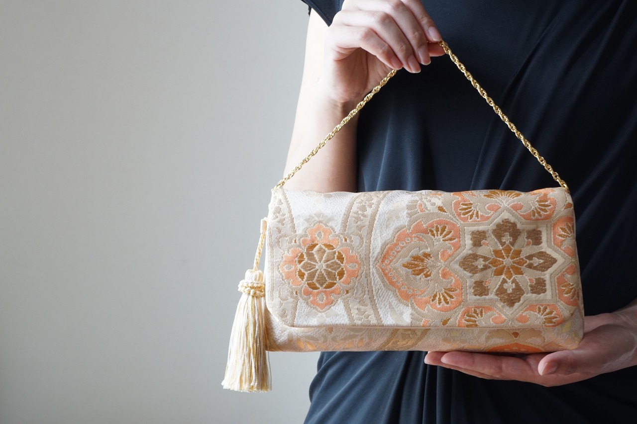 フォーマルな席に相応しいゴールド帯を使ったバックで、結婚式、パーティー、お着物、日常使いに、様々なシーンで活用頂く事ができます。