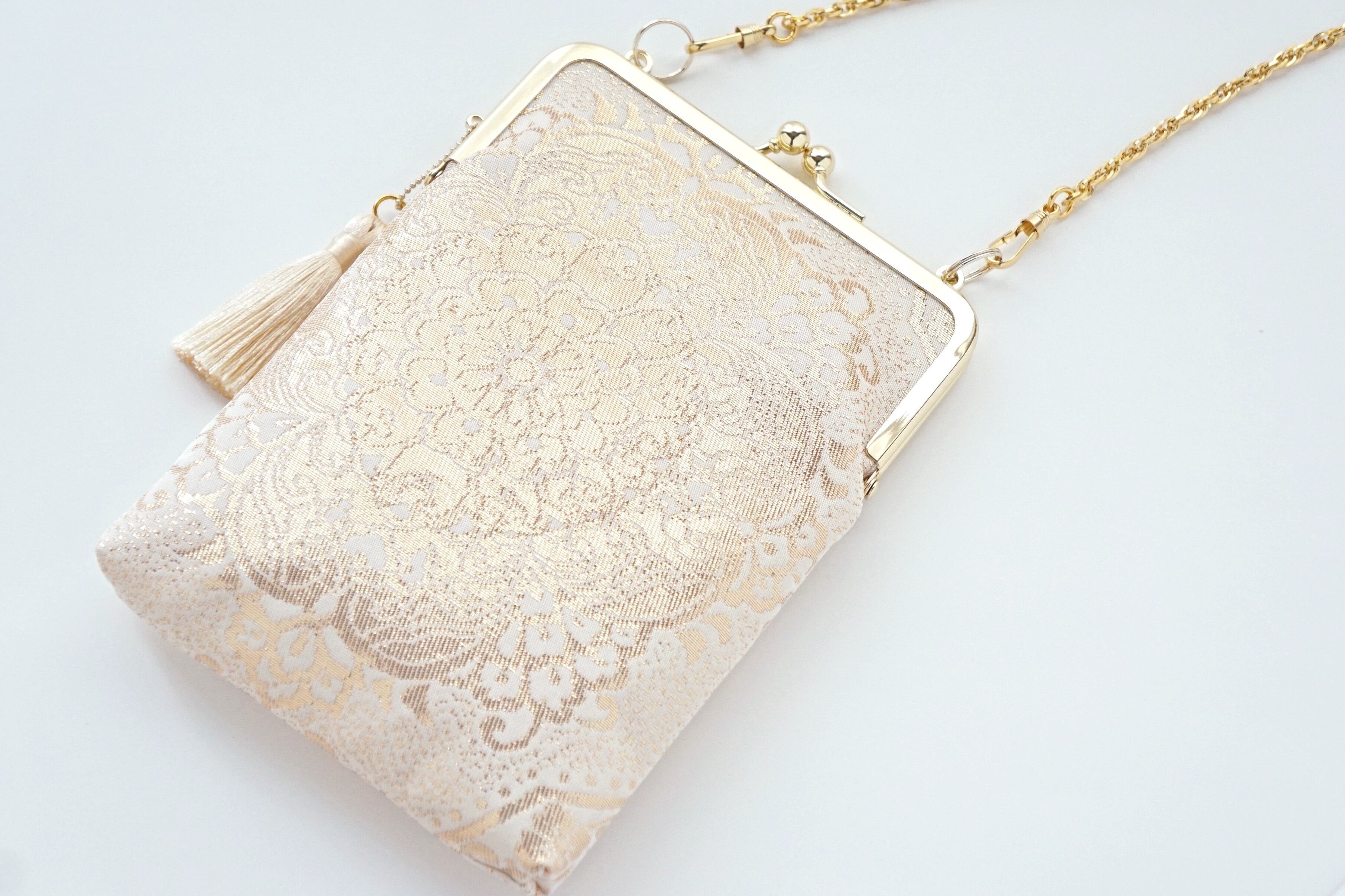 本金箔二重箔 小さめパーティーバック、スマホケース、スマホポーチ がま口 リユース帯リメイク ゴールド