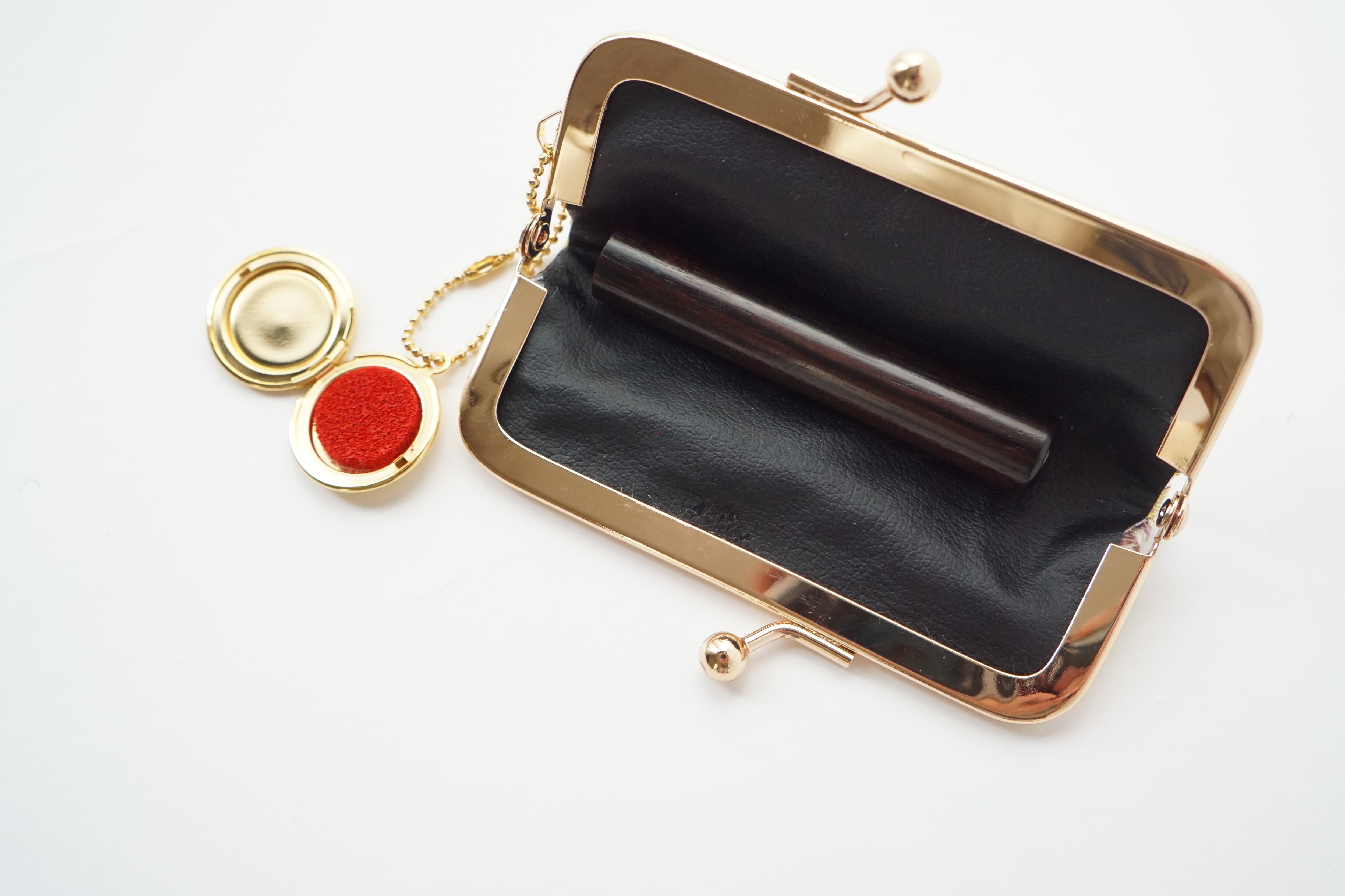 就職祝い、ご友人、外国人の方へのギフトにもぴったりな朱肉付きのがま口印鑑ケースです。
