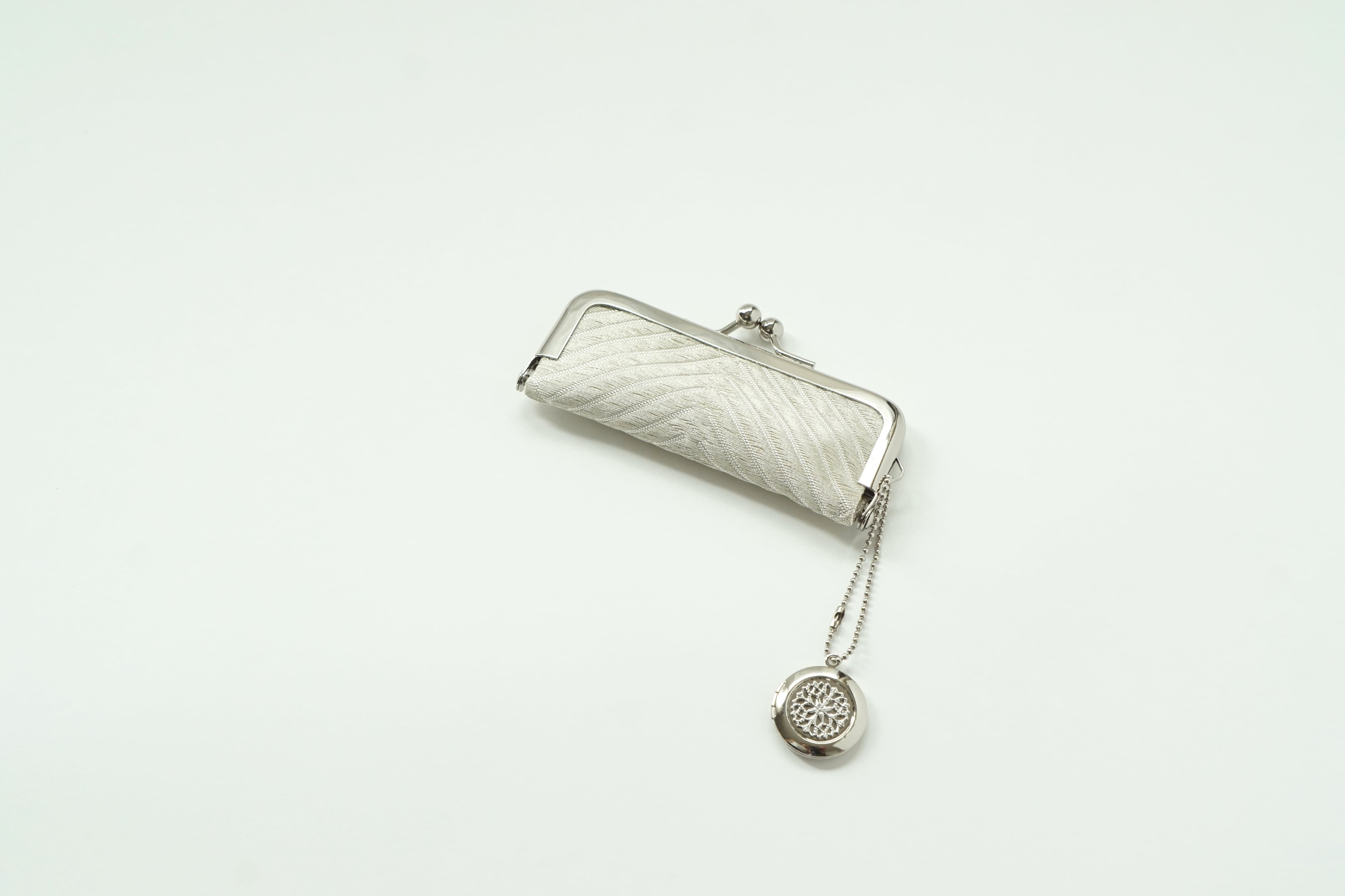 【CELINE シルバー 薄緑 シルク帯 印鑑ケース】がま口、帯リメイク。敬老の日、結婚祝い、誕生日、敬老の日のギフトに。