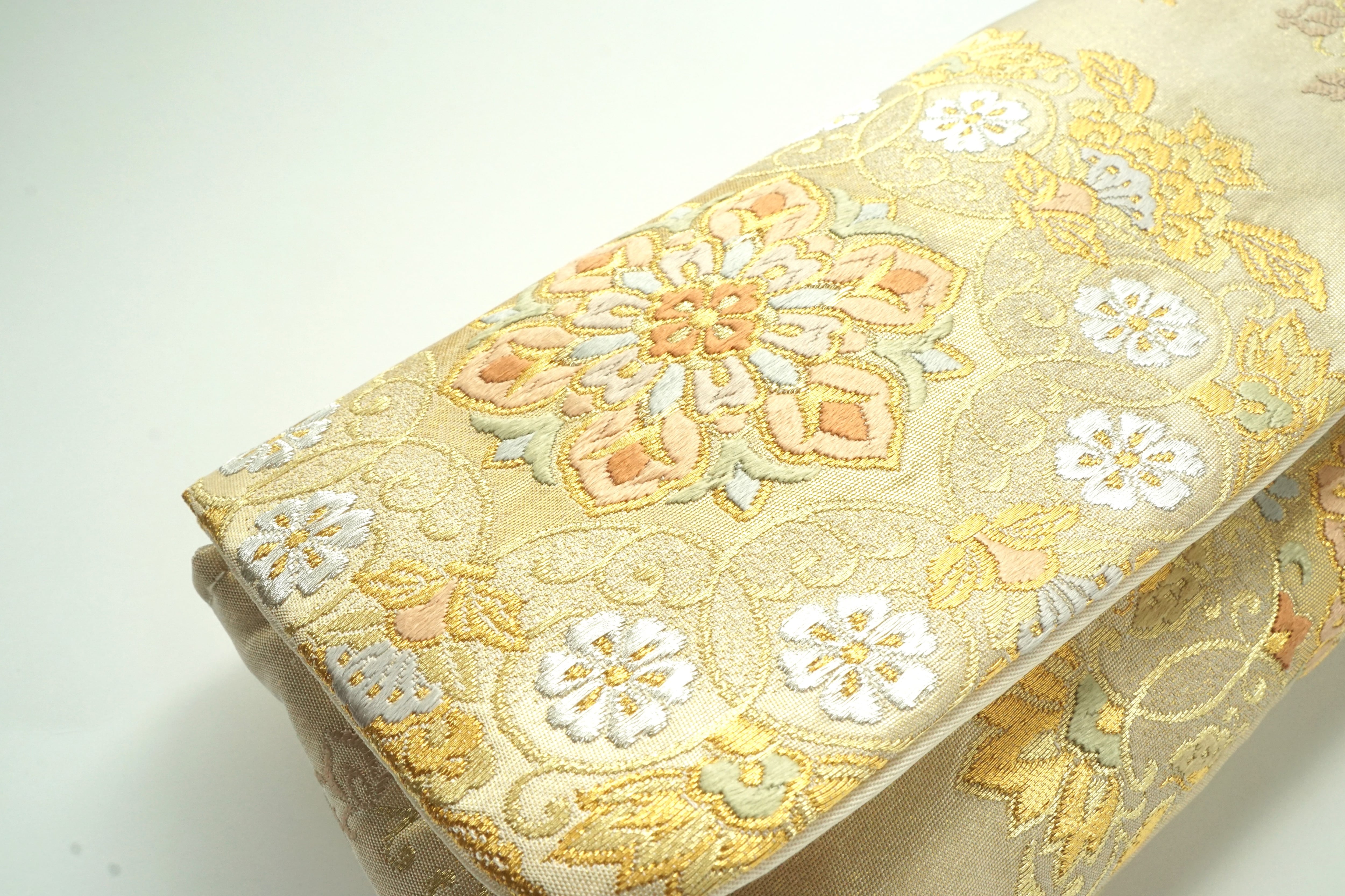 ゴールドの華模様のシルク帯を使った2wayクラッチバック ・ハンドバックです。