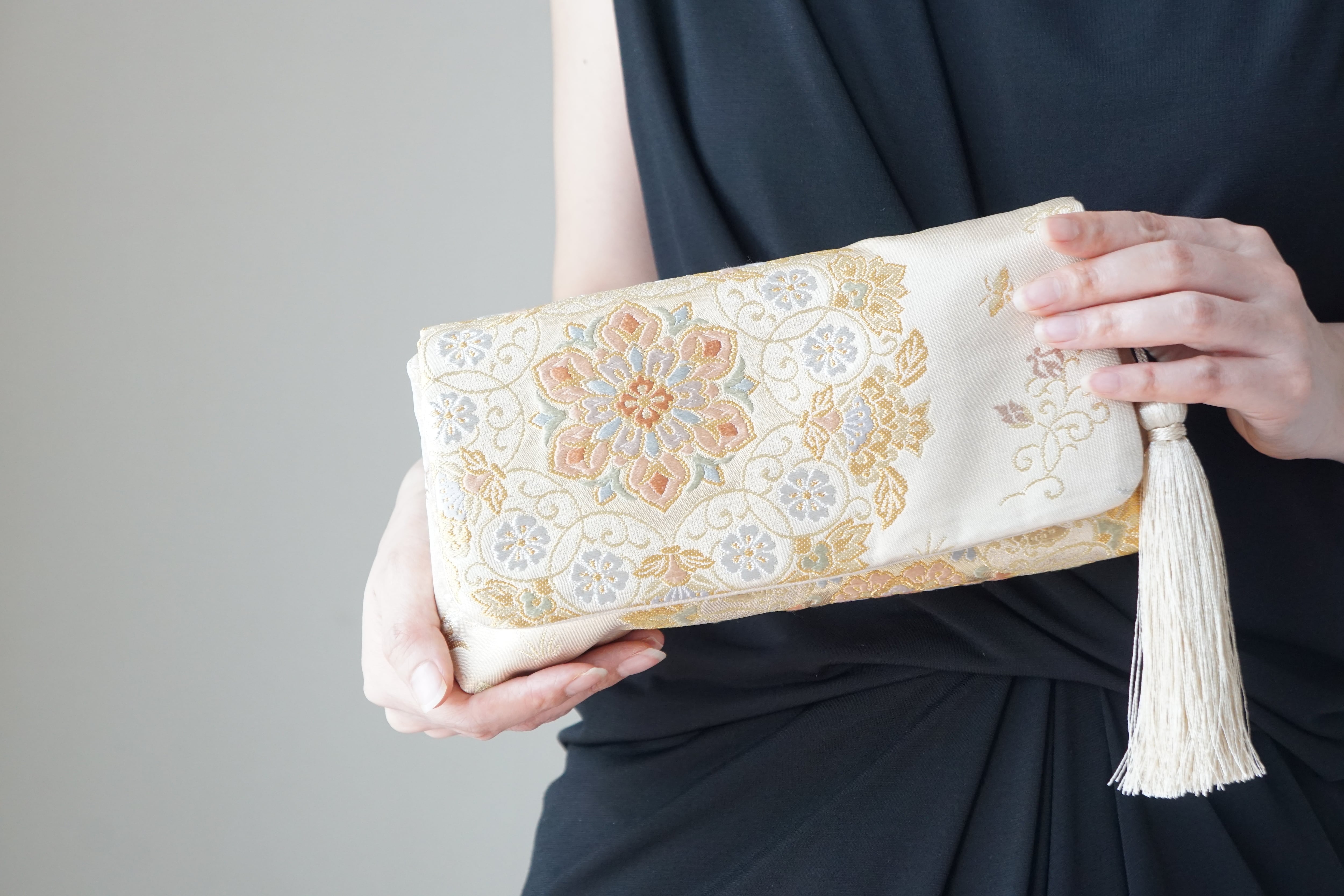 フォーマル帯のため、結婚式やパーティーのバッグとして、格も申し分なく、シンプルなワンピースに合わせるだけで、フォーマルな場にふさわしいワンランク上のコーディネートに。
