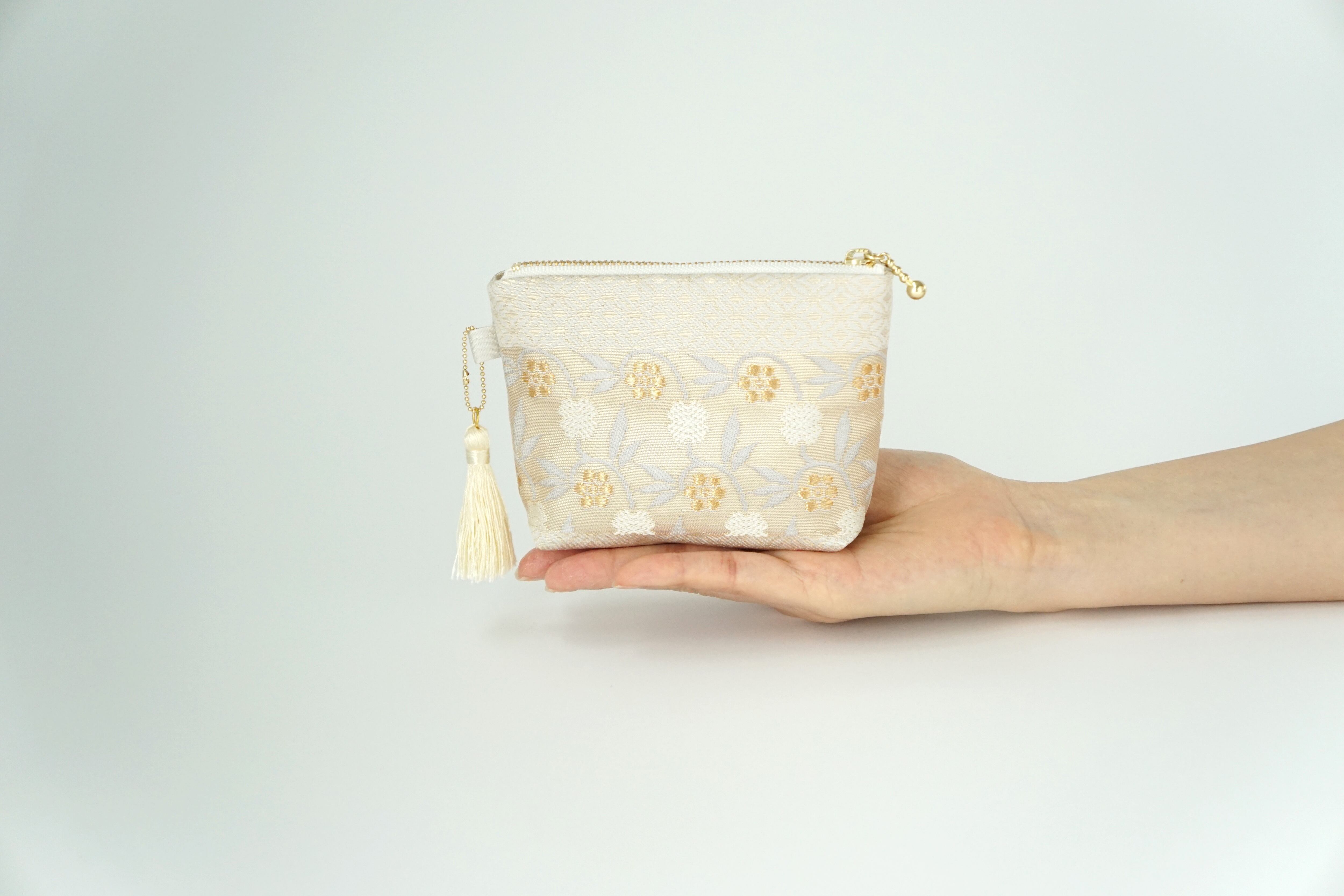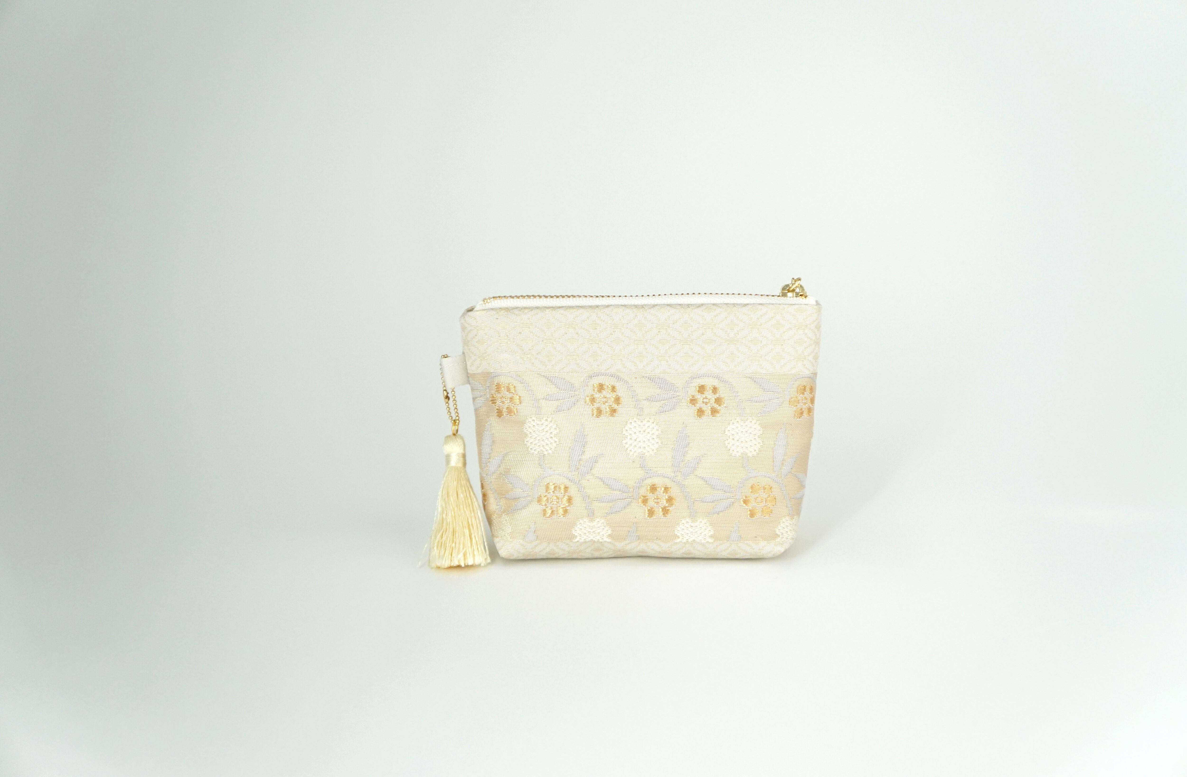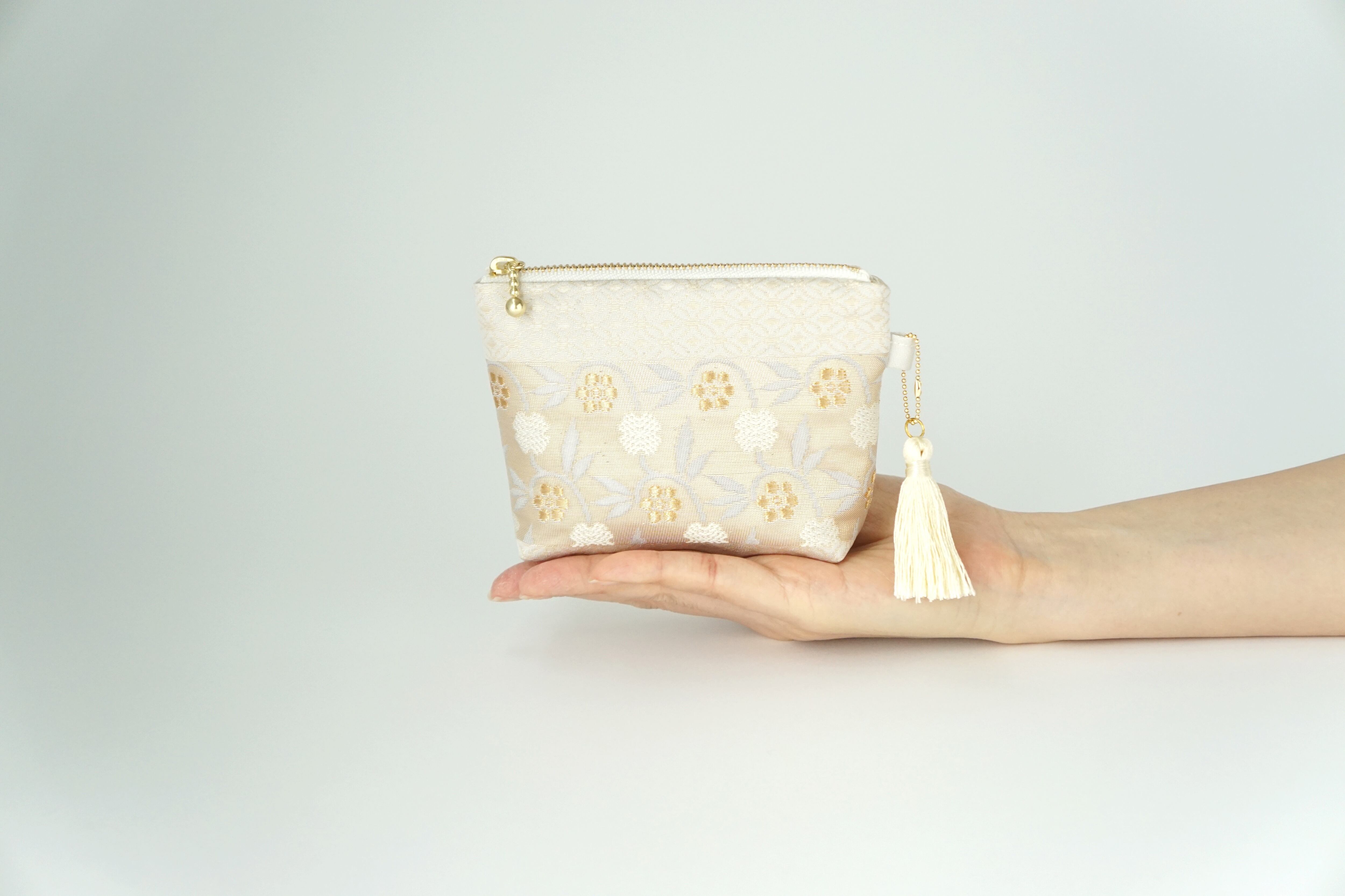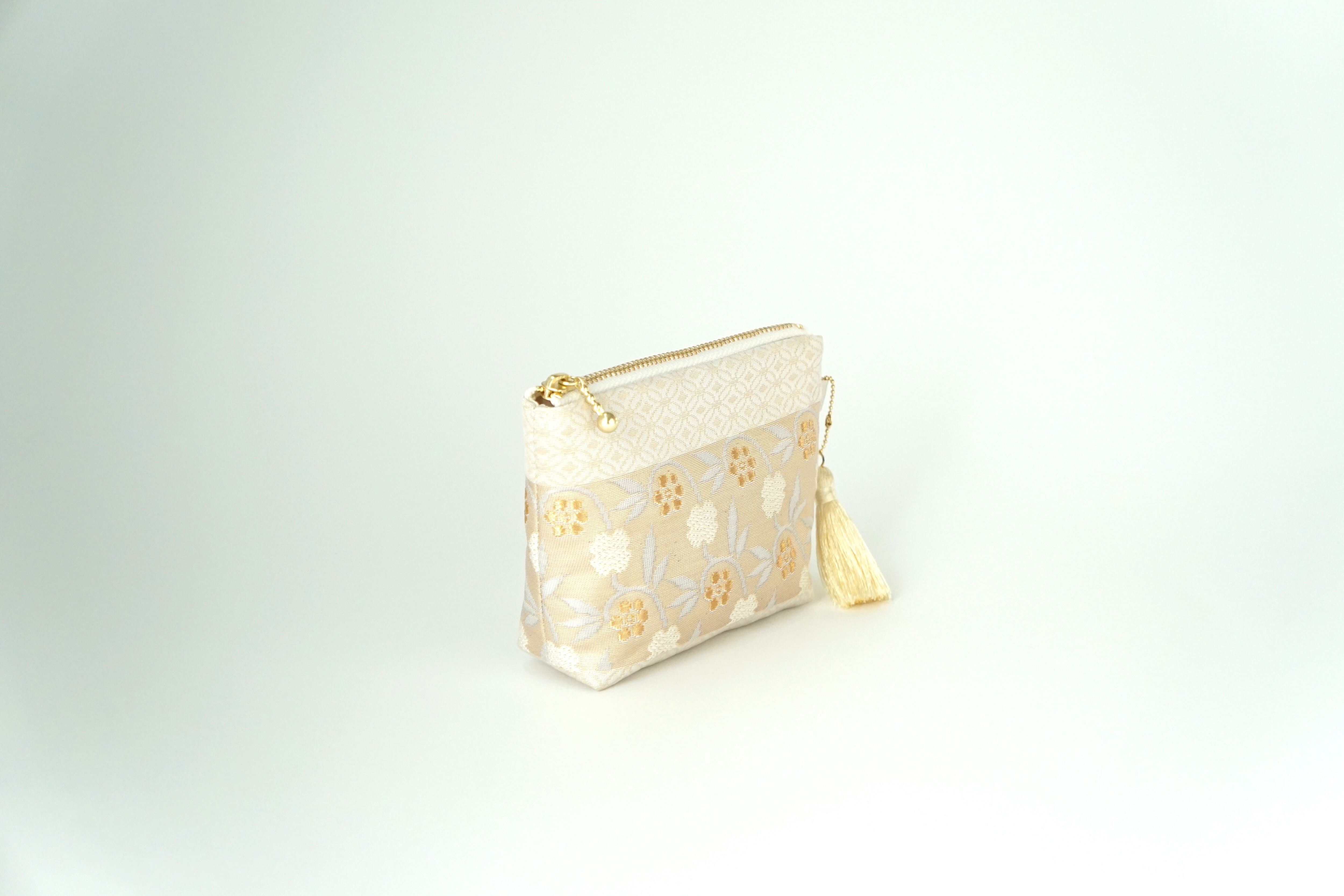 【小花柄 ゴールド シルク帯 ミニポーチ】化粧ポーチ、カードケース、ポーチ小さめ、ジュエリーポーチ、帯リメイク
