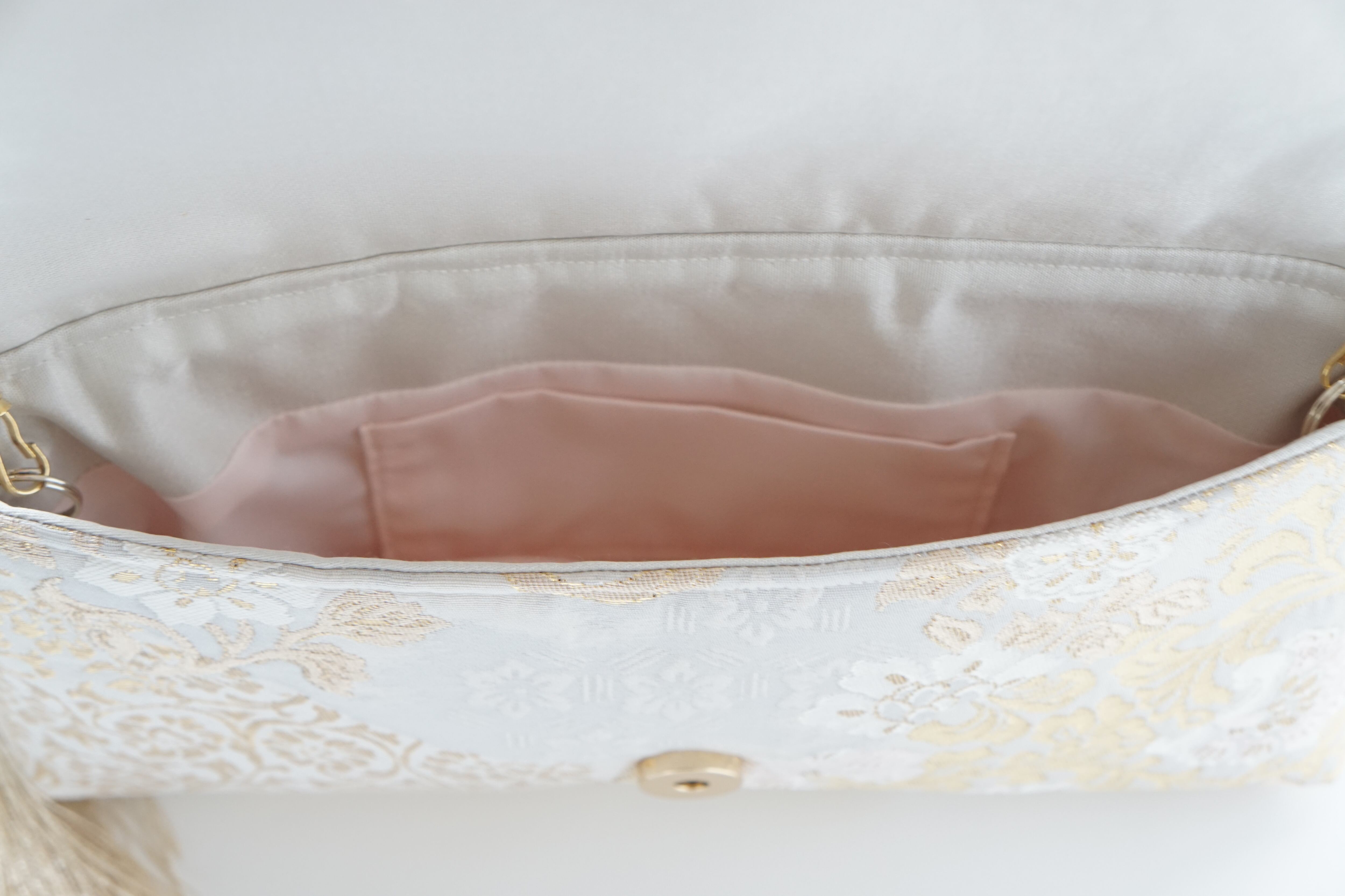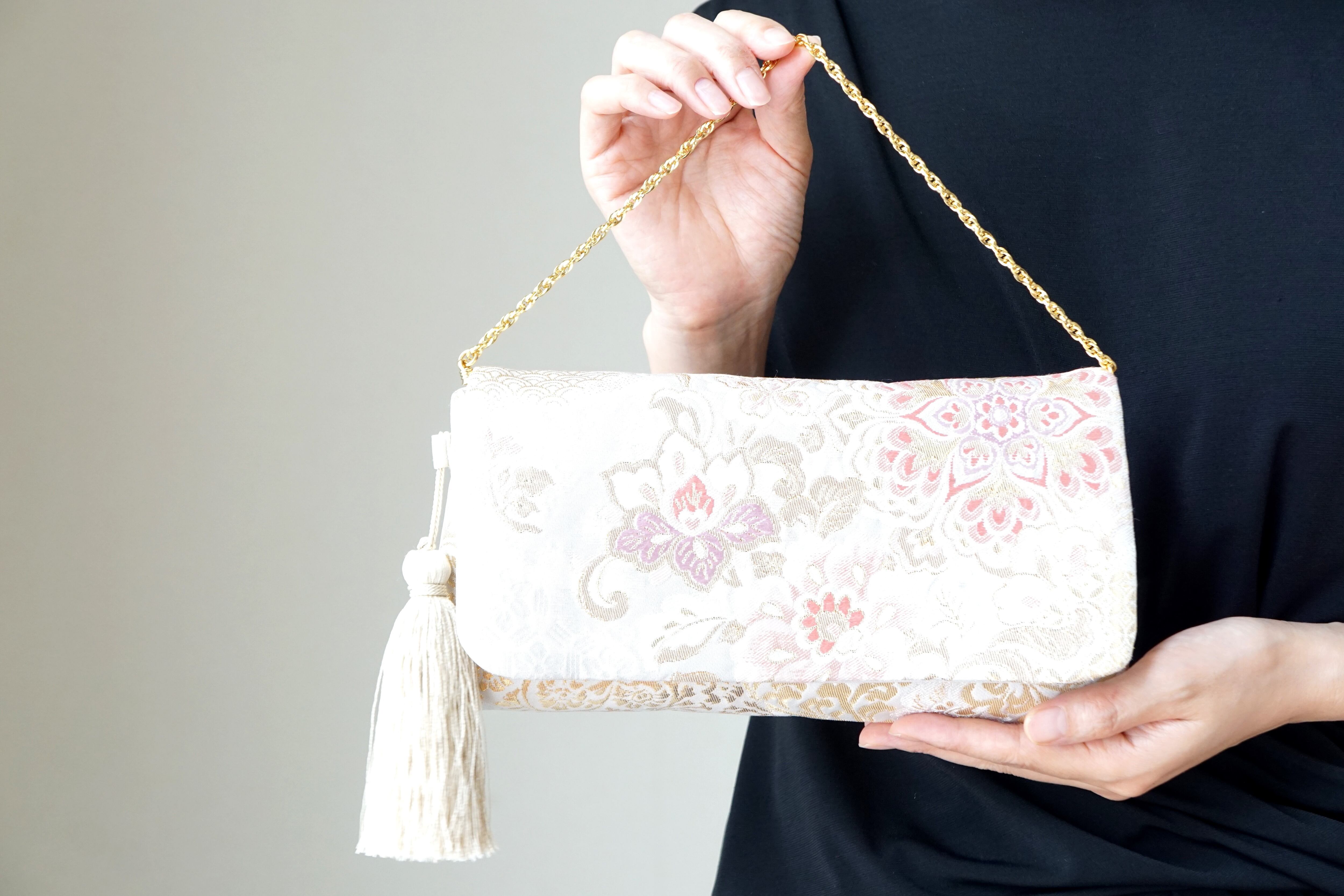 フォーマル帯のため、結婚式やパーティーのバッグとして、格も申し分なく、シンプルなワンピースに合わせるだけで、フォーマルな場にふさわしいワンランク上のコーディネートに。
