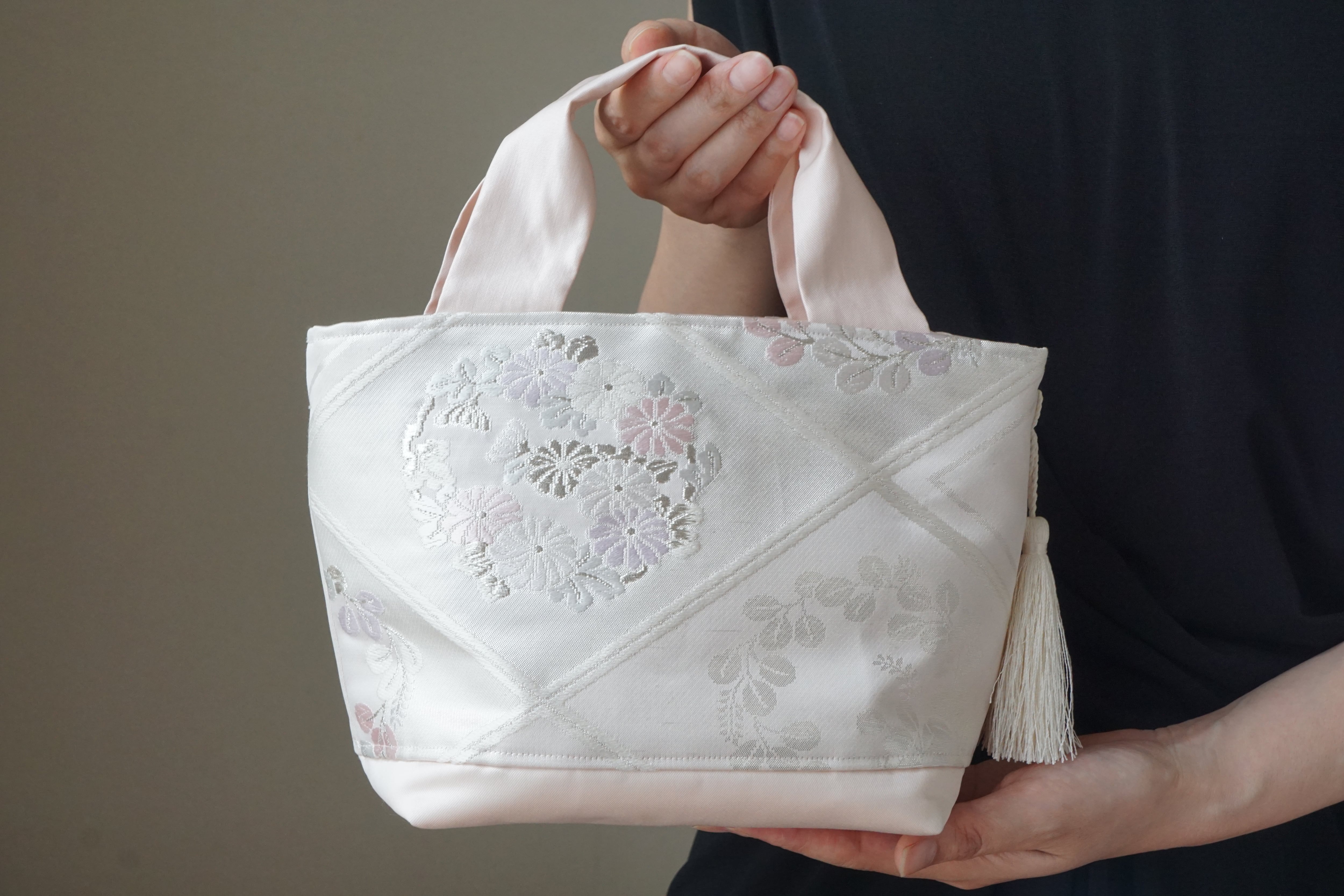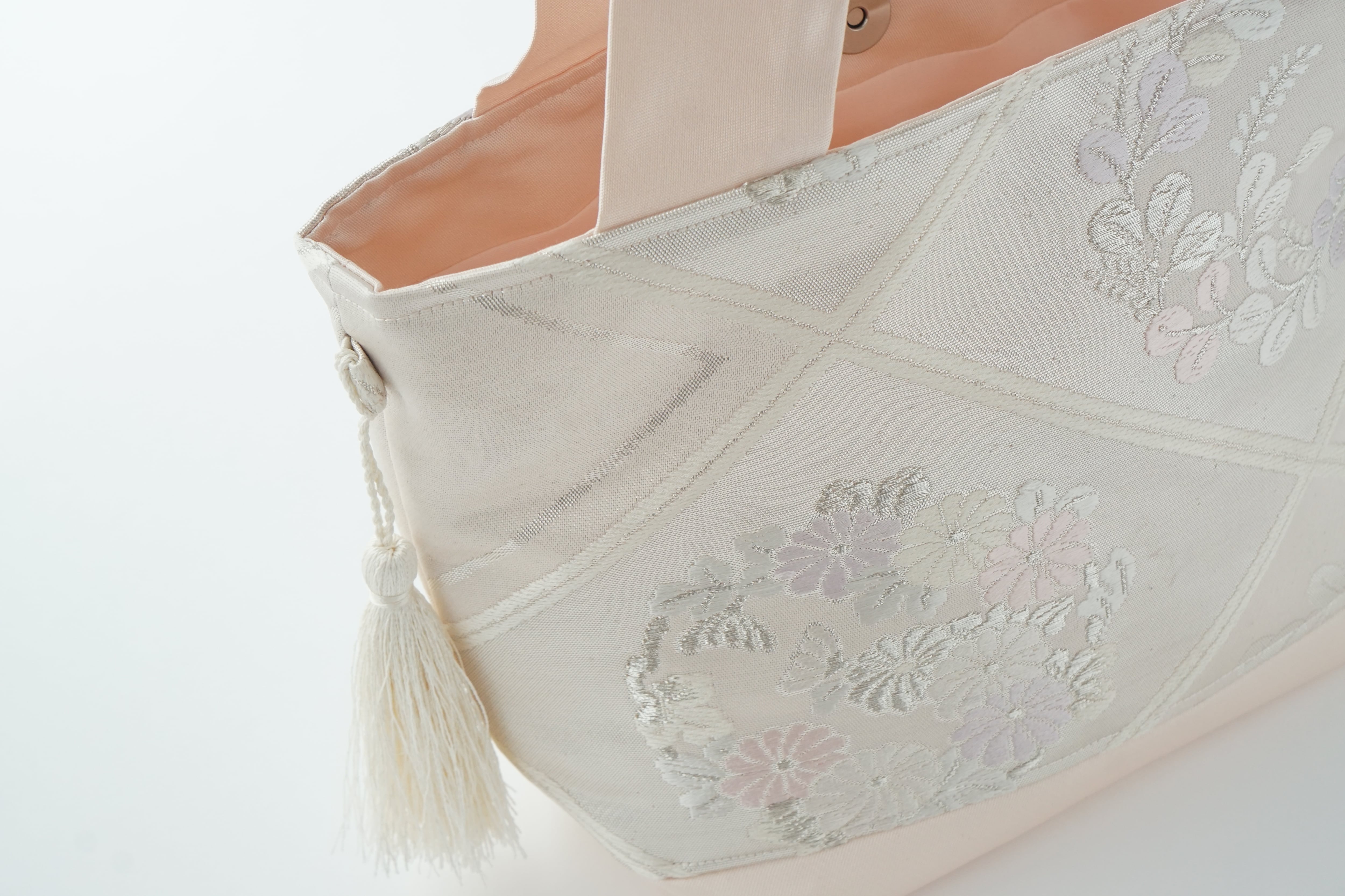 シルバー・薄ピンクの小花模様のシルク帯を使ったトート型バックです。