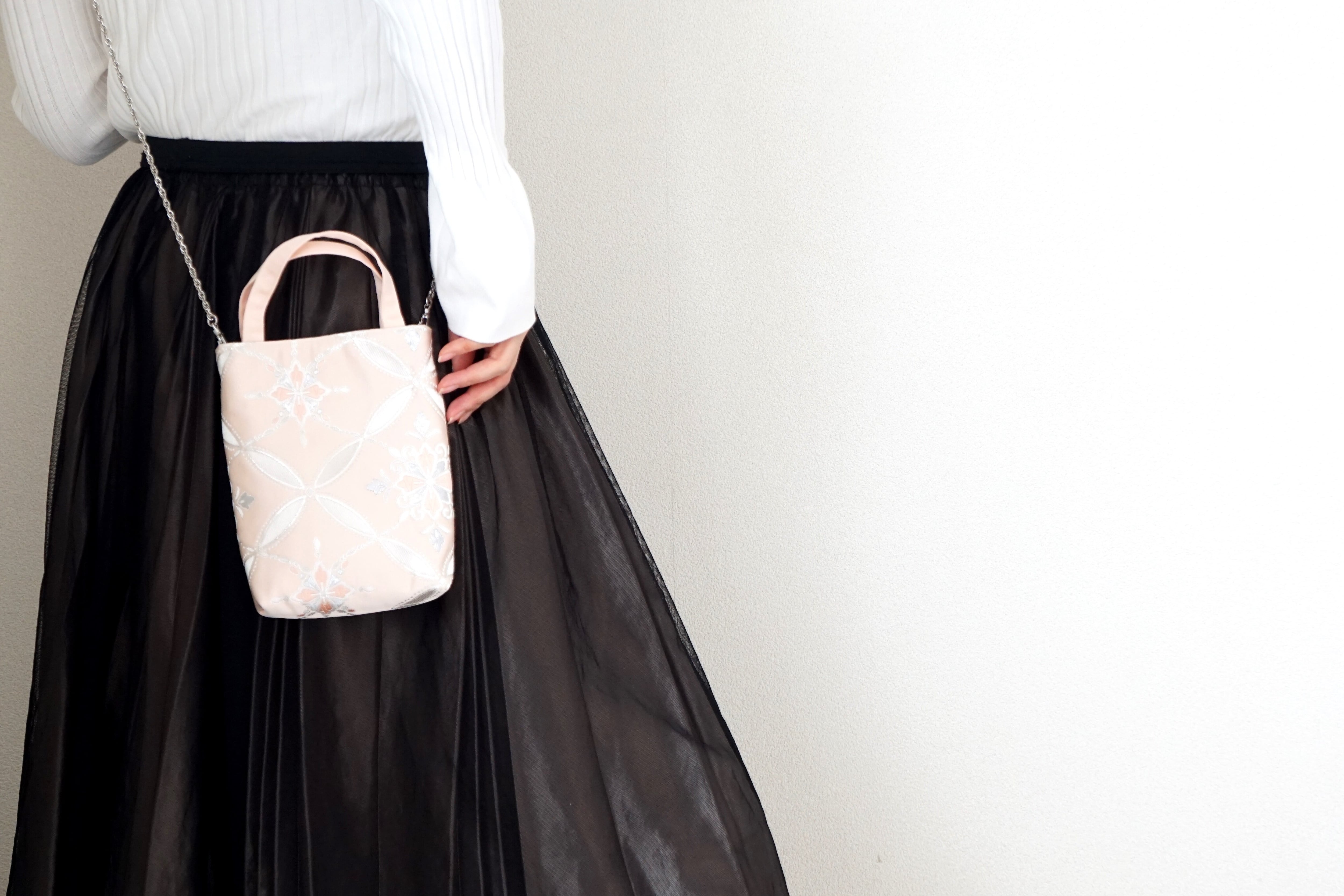 【桜色・シルバー 花模様 シルク帯リメイク 2way ミニショルダーバッグ&ミニハンドバッグ】日常使い、結婚式、パーティー、お呼ばれの日に。サコッシュとしても。