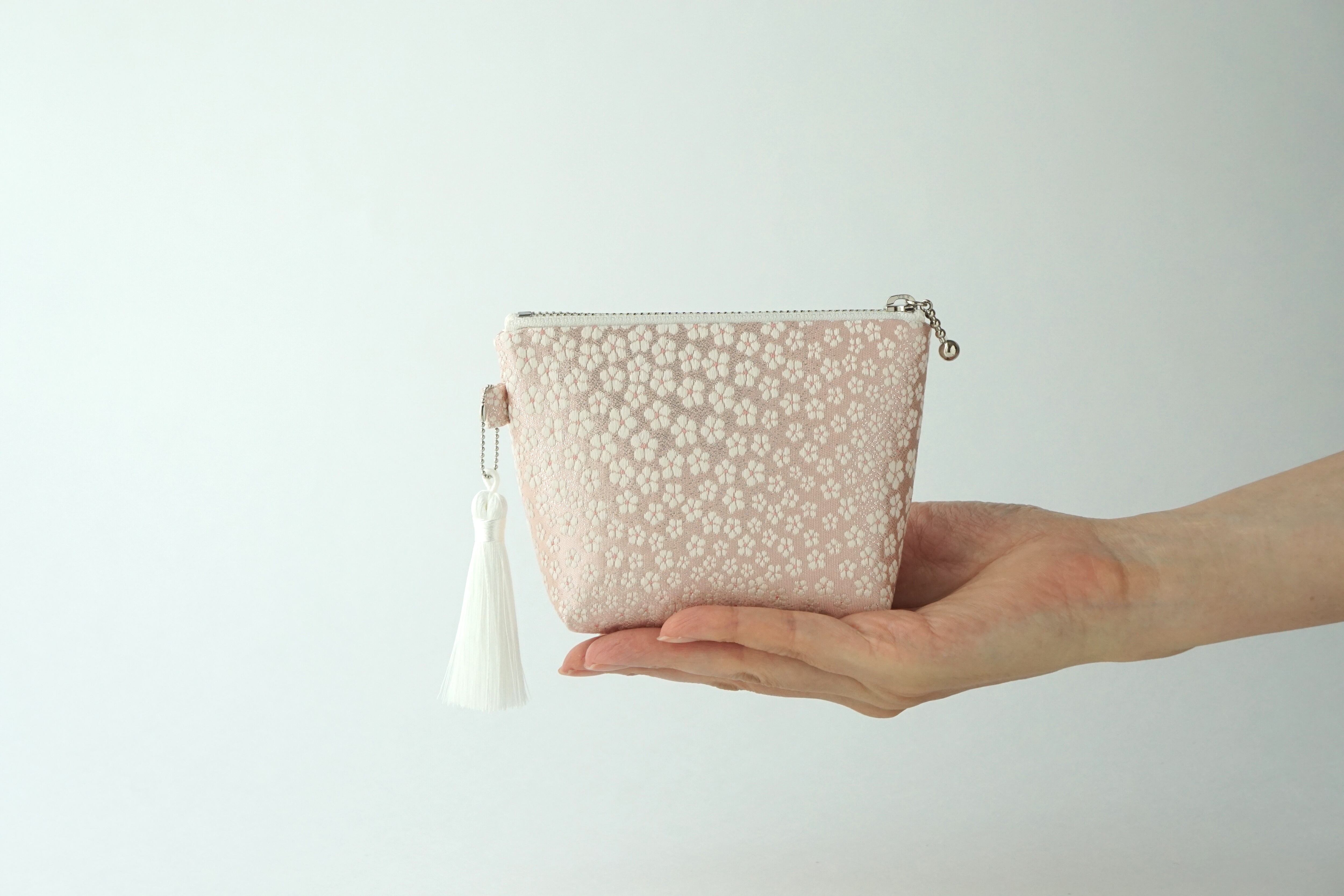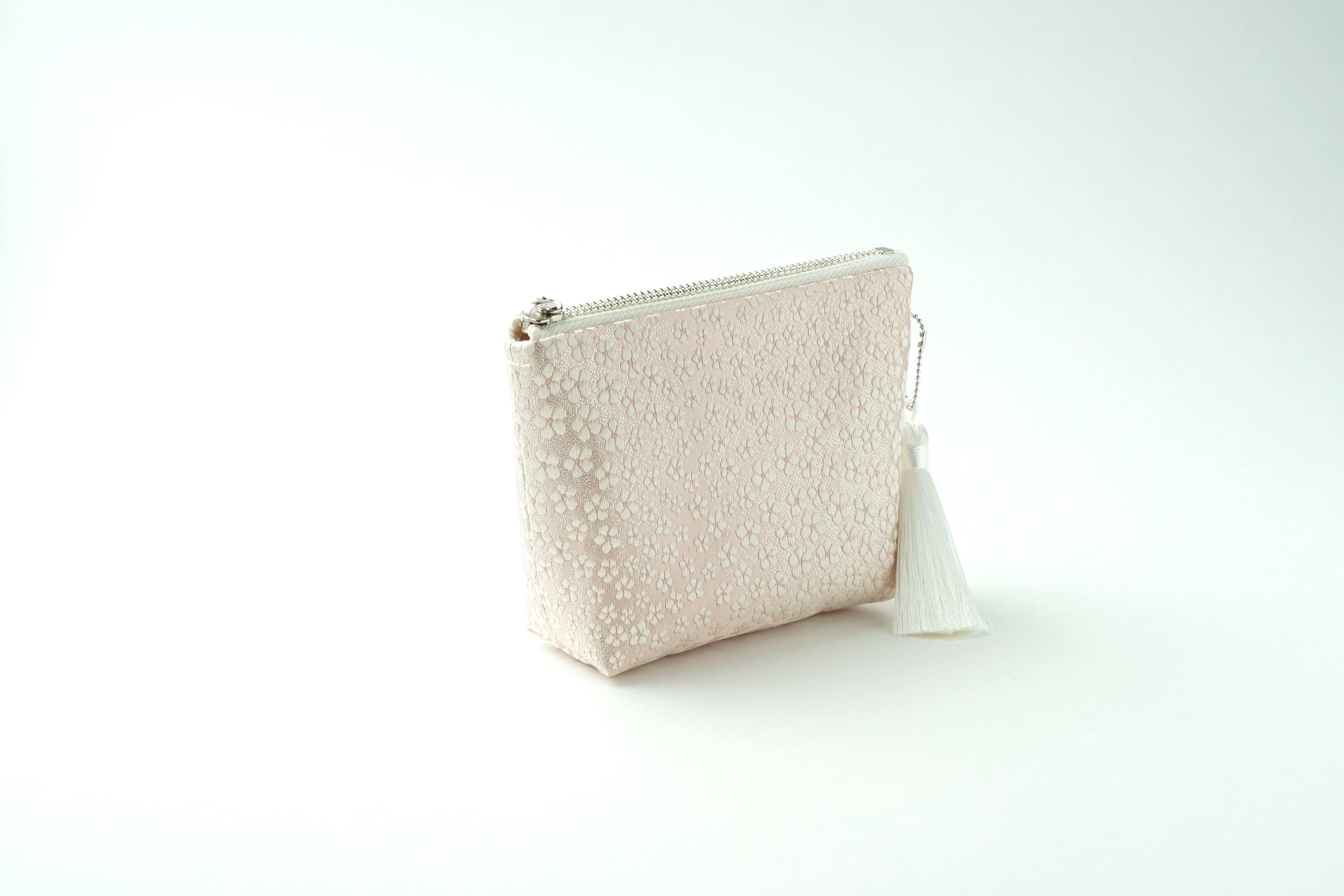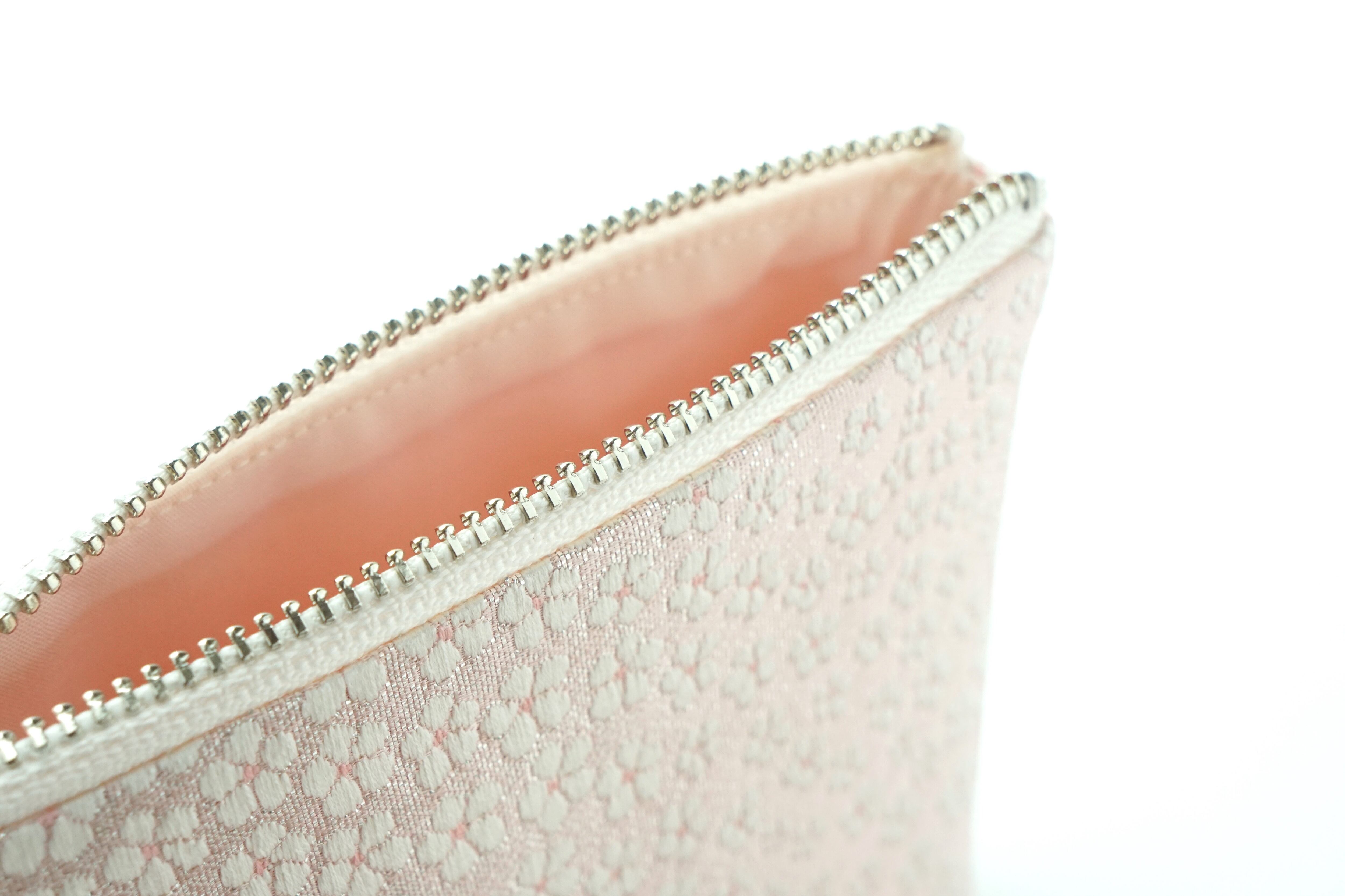 薄い桜色の帯地に立体的に織り出された小花模様が高級感があり美しく、可愛らしいシルク帯を使ったポーチです。