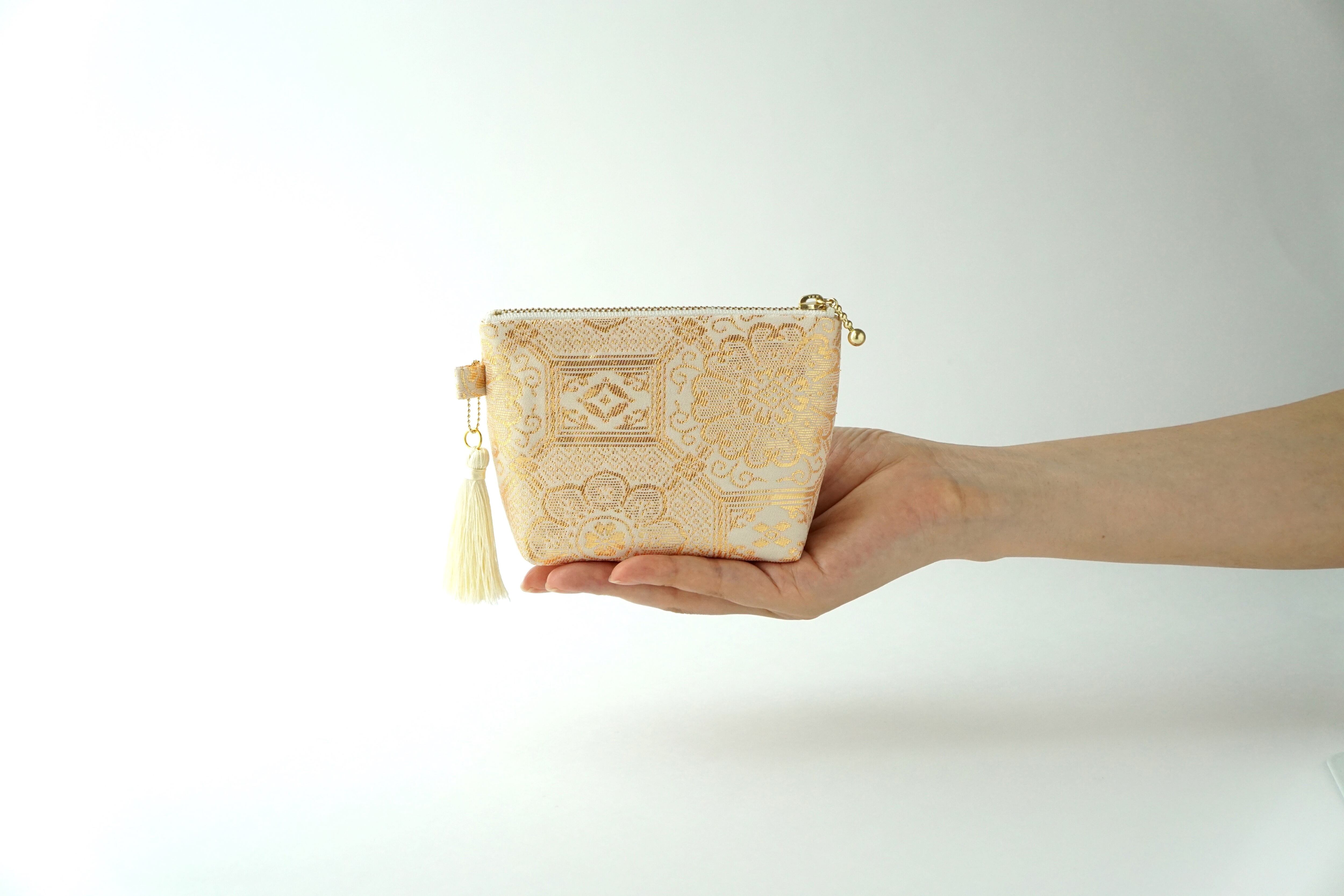 【花蜀江文様 ゴールド シルク帯リメイク ミニポーチ】カードケース、ポーチ小さめ、ジュエリーポーチ。誕生日ギフトにも。